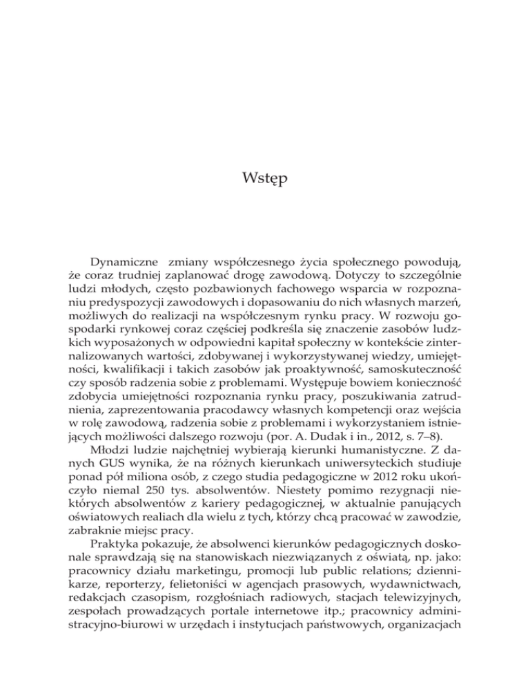 Wstęp Dynamiczne zmiany współczesnego życia społecznego powodują, że coraz trudniej zaplanować drogę zawodową. Dotyczy to szczególnie ludzi młodych, często pozbawionych fachowego wsparcia w rozpoznaniu predyspozycji zawodowych i dopasowaniu do nich własnych marzeń, możliwych do realizacji na współczesnym rynku pracy. W rozwoju gospodarki rynkowej coraz częściej podkreśla się znaczenie zasobów ludzkich wyposażonych w odpowiedni kapitał społeczny w kontekście zinternalizowanych wartości, zdobywanej i wykorzystywanej wiedzy, umiejętności, kwalifikacji i takich zasobów jak proaktywność, samoskuteczność czy sposób radzenia sobie z problemami. Występuje bowiem konieczność zdobycia umiejętności rozpoznania rynku pracy, poszukiwania zatrudnienia, zaprezentowania pracodawcy własnych kompetencji oraz wejścia w rolę zawodową, radzenia sobie z problemami i wykorzystaniem istniejących możliwości dalszego rozwoju (por. A. Dudak i in., 2012, s. 7–8). Młodzi ludzie najchętniej wybierają kierunki humanistyczne. Z danych GUS wynika, że na różnych kierunkach uniwersyteckich studiuje ponad pół miliona osób, z czego studia pedagogiczne w 2012 roku ukończyło niemal 250 tys. absolwentów. Niestety pomimo rezygnacji niektórych absolwentów z kariery pedagogicznej, w aktualnie panujących oświatowych realiach dla wielu z tych, którzy chcą pracować w zawodzie, zabraknie miejsc pracy. Praktyka pokazuje, że absolwenci kierunków pedagogicznych doskonale sprawdzają się na stanowiskach niezwiązanych z oświatą, np. jako: pracownicy działu marketingu, promocji lub public relations; dziennikarze, reporterzy, felietoniści w agencjach prasowych, wydawnictwach, redakcjach czasopism, rozgłośniach radiowych, stacjach telewizyjnych, zespołach prowadzących portale internetowe itp.; pracownicy administracyjno-biurowi w urzędach i instytucjach państwowych, organizacjach 8 Wstęp pozarządowych oraz w prywatnych przedsiębiorstwach; handlowcy (sprzedawcy, przedstawiciele handlowi, telemarketerzy). Na powyższych stanowiskach wymagane są i cenione umiejętności społeczne, organizacyjne, negocjacyjne, a także komunikatywność i kultura osobista, z założenia będące atrybutem każdego dobrego pedagoga. Każda profesja społeczna, a szczególnie rola pedagoga – jako niezwykle silnie związana z zaufaniem publicznym – wymaga szczególnego rodzaju predyspozycji określanych jako talent czy „pedagogiczna dusza”. We wspomaganiu rozwoju różnych osób i grup społecznych bardzo cenne są osoby, które zostały obdarzone pewnego rodzaju zmysłem, talentem czy wrażliwością pedagogiczną. Potencjał zawodowy pedagoga w dużej mierze zdeterminowany jest również zasobami osobistymi, jakie posiada. Jego poziom funkcjonowania na rynku pracy zależy od wielu cech osobowości, które odpowiednio rozwijane w trakcie nauki, mogą stać się cennymi zasobami wykorzystywanymi później w przyszłej pracy zawodowej. Problematyka związana z kształceniem pedagogów i ich funkcjonowaniem zawodowym jest przedmiotem licznych badań i analiz naukowych (por. m.in. M. Łobocki (red.), 2001; J. Saran, 1993; A. Gofron (red.), 1998; E. Rogalski, 2007; Z. Melosik, 2008; K. Denek, 2011a; 2011b, 2012; J. Kostkiewicz, A. Domagała-Kręcioch, M. J. Szymański (red.), 2011; S. Waśniewski, 2009, B. Śliwerski, 2008; 2010; 2011; 2012; A. Szerląg, 2011; J. Kostkiewicz, 2011;W. Wróblewska, 2008; M. Kwiatkowski, 2012; K. Klimkowska, A. Dudak, 2012; A. Dudak, K. Klimkowska, A. Różański, 2012 (red.); R. Bera, 2011; 2012; Cz. Banach, 2012; T. Aleksander, 2013; M. Czerepaniak-Walczak, 2013a; 2013b). Wybór pedagogiki jako kierunku studiów staje się także przedmiotem analiz procesów rynkowych w kategorii popytu i podaży, ale mało kto docieka powodów wysokiej motywacji, jaką kierują się kandydaci na pedagogikę. Generalizuje się opinie, że taki wybór jest po prostu zły, błędny, gdyż na rynku nie ma adekwatnej do popytu liczby miejsc pracy. Jednak nie wszyscy eksperci postrzegają wybór pedagogiki jako zło. Zdaniem Elżbiety Kryńskiej (2004), która prowadzi badania nad rynkiem pracy, „pedagogika jako dziedzina związana z tzw. usługami osobistymi, np. z poradnictwem, opieką nad dziećmi, raczej będzie dawać pracę w przyszłości, choć na pewno nie tylu osobom, ile chciałoby ją studiować”. Uczelnie pedagogiczne przygotowują zupełnie nowe programy kształcenia i oferty w zakresie specjalności, które nie muszą być związane z nauczycielskimi, a dają większą szansę na znalezienie pracy. Łączy się wówczas wiedzę ściśle pedagogiczną z psychologią czy naukami o zarządzaniu, ekonomią lub socjologią, zaspokajając częściowo Wstęp 9 niespełnione marzenia o studiowaniu na tych trudniej dostępnych kierunkach. Według Marii Czerepaniak-Walczak (2002) „rosną zastępy wykształconych, dobrze przygotowanych profesjonalistów odpowiedzialnych za rozwój społeczeństwa opartego na wiedzy, świadomie uczestniczącego w zmianie poszczególnych dziedzin życia. Jesteśmy wszak drugą po ekonomistach i specjalistach od zarządzania grupą wykształconą na poziomie wyższym. Ponadto istnieje szansa na zwiększenie grupy kognitariuszy, dla których przewiduje się szerokie spektrum ról i zadań w społeczeństwie opartym na wiedzy. Do takiego optymizmu może skłaniać rozległa lista specjalności i specjalizacji w ramach kierunku pedagogika. Na tej liście znajduje się między innymi pedagogika społeczna i pedagogika religijna, pedagogika opiekuńcza i opiekuńczo-wychowawcza, resocjalizacja i praca socjalna, a jednocześnie edukacja zdrowotna, społeczno-obywatelska, doradztwo społeczne i zawodowe” (s. 4–5). Nie brakuje też uwag krytycznych, że kształcenie pedagogiczne nie spełnia pokładanych w nim oczekiwań, że masowość kształcenia powoduje obniżenie jego jakości, co daje się wyraźnie zauważyć wśród m