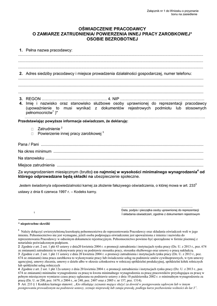 Załącznik nr 1 do Wniosku o przyznanie bonu na zasiedlenie OŚWIADCZENIE PRACODAWCY O ZAMIARZE ZATRUDNIENIA/ POWIERZENIA INNEJ PRACY ZAROBKOWEJ* OSOBIE BEZROBOTNEJ 1. Pełna nazwa pracodawcy: ........................................................................................................................................................................................ ........................................................................................................................................................................................ ........................................................................................................................................................................................ 2. Adres siedziby pracodawcy i miejsce prowadzenia działalności gospodarczej, numer telefonu: ................................................................................................................................................................... ................................................................................................................................................................... ................................................................................................................................................................... 3. REGON …………………………………………. 4. NIP ……………………………………………………… 4. Imię i nazwisko oraz stanowisko służbowe osoby uprawnionej do reprezentacji pracodawcy (upoważnienie to musi wynikać z dokumentów rejestrowych podmiotu lub stosownych pełnomocnictw1 )* ………………………………………………………………………………………………………………………………….. Przedstawiając powyższe informacje oświadczam, że deklaruję: Zatrudnienie 2 Powierzenie innej pracy zarobkowej 3 Pana / Pani ............................................................................................................................................... Na okres minimum .................................................................................................................................... Na stanowisku ........................................................................................................................................... Miejsce zatrudnienia ................................................................................................................................. Za wynagrodzeniem miesięcznym (brutto) co najmniej w wysokości minimalnego wynagrodzenia4 od którego odprowadzane będą składki na ubezpieczenie społeczne. Jestem świadomy/a odpowiedzialności karnej za złożenie fałszywego oświadczenia, o której mowa w art. 233 5 ustawy z dnia 6 czerwca 1997 r. – Kodeks karny. ………………………………………………….. 1 Data, podpis i pieczątka osoby uprawnionej do reprezentacji i składania oświadczeń, zgodnie z dokumentem rejestrowym * niepotrzebne skreślić 1 Należy dołączyć uwierzytelnioną kserokopię pełnomocnictwa do reprezentowania Pracodawcy oraz składania oświadczeń woli w jego imieniu. Pełnomocnictwo nie jest wymagane, jeżeli osoba podpisująca oświadczenie jest upoważniona z imienia i nazwiska do reprezentowania Pracodawcy w odnośnym dokumencie rejestracyjnym. Pełnomocnictwo powinno być sporządzone w formie pisemnej z notarialnie poświadczonym podpisem. 2 Zgodnie z art. 2 ust. 1 pkt 43 ustawy z dnia20 kwietnia 2004 r. o promocji zatrudnienia i instytucjach rynku pracy (Dz. U. z 2013 r., poz. 674 ze zmianami) zatrudnienie to wykonywanie pracy na podstawie stosunku pracy, stosunku służbowego oraz umowy o pracę nakładczą 3 Zgodnie z art. 2 ust. 1 pkt 11 ustawy z dnia 20 kwietnia 2004 r. o promocji zatrudnienia i instytucjach rynku pracy (Dz. U. z 2013 r., poz. 674 ze zmianami) inna praca zarobkowa to wykonywanie pracy lub świadczenie usług na podstawie umów cywilnoprawnych, w tym umowy agencyjnej, umowy zlecenia, umowy o dzieło albo w okresie członkostwa w rolniczej spółdzielni produkcyjnej, spółdzielni kółek rolniczych lub spółdzielni usług rolniczych 4 Zgodnie z art. 2 ust. 1 pkt 12a ustawy z dnia 20 kwietnia 2004 r. o promocji zatrudnienia i instytucjach rynku pracy (Dz. U. z 2013 r., poz. 674 ze zmianami) minimalne wynagrodzenie za pracę to kwota minimalnego wynagrodzenia za pracę pracowników przysługująca za pracę w pełnym miesięcznym wymiarze czasu pracy ogłaszana na podstawie ustawy z dnia 10 października 2002 r. o minimalnym wynagrodzeniu za pracę (Dz. U. nr 200, poz. 1679, z 2004 r., nr 240, poz. 2407 oraz z 2005 r. nr 157, poz. 1314). 5 Art. 233 § 1 Kodeksu karnego stanowi: „Kto składając zeznanie mające służyć za dowód w postępowaniu sądowym lub w innym postępowaniu prowadzonym na podstawie ustawy, zeznaje nieprawdę lub zataja prawdę, podlega karze pozbawienia wolności do lat 3”.