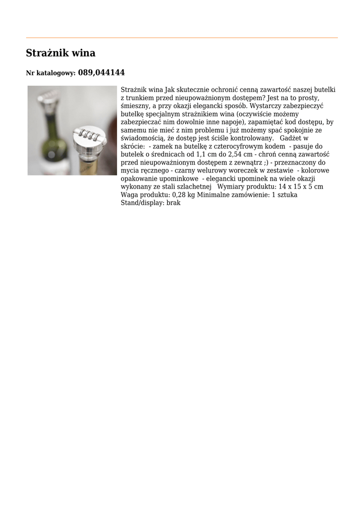 Strażnik wina Nr katalogowy: 089,044144 Strażnik wina Jak skutecznie ochronić cenną zawartość naszej butelki z trunkiem przed nieupoważnionym dostępem? Jest na to prosty, śmieszny, a przy okazji elegancki sposób. Wystarczy zabezpieczyć butelkę specjalnym strażnikiem wina (oczywiście możemy zabezpieczać nim dowolnie inne napoje), zapamiętać kod dostępu, by samemu nie mieć z nim problemu i już możemy spać spokojnie ze świadomością, że dostęp jest ściśle kontrolowany. Gadżet w skrócie: - zamek na butelkę z czterocyfrowym kodem - pasuje do butelek o średnicach od 1,1 cm do 2,54 cm - chroń cenną zawartość przed nieupoważnionym dostępem z zewnątrz ;) - przeznaczony do mycia ręcznego - czarny welurowy woreczek w zestawie - kolorowe opakowanie upominkowe - elegancki upominek na wiele okazji wykonany ze stali szlachetnej Wymiary produktu: 14 x 15 x 5 cm Waga produktu: 0,28 kg Minimalne zamówienie: 1 sztuka Stand/display: brak