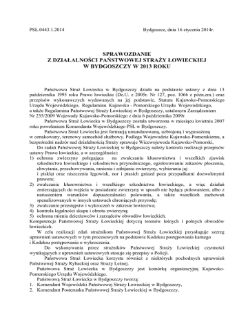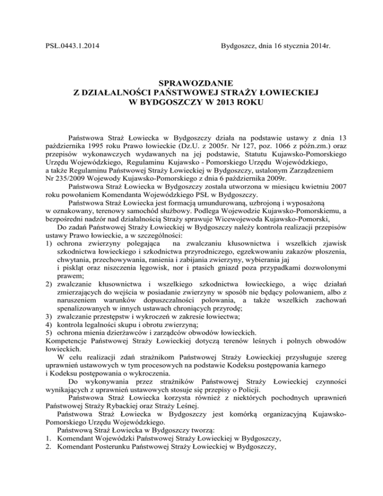 PSŁ.0443.1.2014 Bydgoszcz, dnia 16 stycznia 2014r. SPRAWOZDANIE Z DZIAŁALNOŚCI PAŃSTWOWEJ STRAŻY ŁOWIECKIEJ W BYDGOSZCZY W 2013 ROKU Państwowa Straż Łowiecka w Bydgoszczy działa na podstawie ustawy z dnia 13 października 1995 roku Prawo łowieckie (Dz.U. z 2005r. Nr 127, poz. 1066 z późn.zm.) oraz przepisów wykonawczych wydawanych na jej podstawie, Statutu Kujawsko-Pomorskiego Urzędu Wojewódzkiego, Regulaminu Kujawsko - Pomorskiego Urzędu Wojewódzkiego, a także Regulaminu Państwowej Straży Łowieckiej w Bydgoszczy, ustalonym Zarządzeniem Nr 235/2009 Wojewody Kujawsko-Pomorskiego z dnia 6 października 2009r. Państwowa Straż Łowiecka w Bydgoszczy została utworzona w miesiącu kwietniu 2007 roku powołaniem Komendanta Wojewódzkiego PSŁ w Bydgoszczy. Państwowa Straż Łowiecka jest formacją umundurowaną, uzbrojoną i wyposażoną w oznakowany, terenowy samochód służbowy. Podlega Wojewodzie Kujawsko-Pomorskiemu, a bezpośredni nadzór nad działalnością Straży sprawuje Wicewojewoda Kujawsko-Pomorski, Do zadań Państwowej Straży Łowieckiej w Bydgoszczy należy kontrola realizacji przepisów ustawy Prawo łowieckie, a w szczególności: 1) ochrona zwierzyny polegająca na zwalczaniu kłusownictwa i wszelkich zjawisk szkodnictwa łowieckiego i szkodnictwa przyrodniczego, egzekwowaniu zakazów płoszenia, chwytania, przechowywania, ranienia i zabijania zwierzyny, wybierania jaj i piskląt oraz niszczenia lęgowisk, nor i ptasich gniazd poza przypadkami dozwolonymi prawem; 2) zwalczanie kłusownictwa i wszelkiego szkodnictwa łowieckiego, a więc działań zmierzających do wejścia w posiadanie zwierzyny w sposób nie będący polowaniem, albo z naruszeniem warunków dopuszczalności polowania, a także wszelkich zachowań spenalizowanych w innych ustawach chroniących przyrodę; 3) zwalczanie przestępstw i wykroczeń w zakresie łowiectwa; 4) kontrola legalności skupu i obrotu zwierzyną; 5) ochrona mienia dzierżawców i zarządców obwodów łowieckich. Kompetencje Państwowej Straży Łowieckiej dotyczą terenów leśnych i polnych obwodów łowieckich. W celu realizacji zdań strażnikom Państwowej Straży Łowieckiej przysługuje szereg uprawnień ustawowych w tym procesowych na podstawie Kodeksu postępowania karnego i Kodeksu postępowania o wykroczenia. Do wykonywania przez strażników Państwowej Straży Łowieckiej czynności wynikających z uprawnień ustawowych stosuje się przepisy o Policji. Państwowa Straż Łowiecka korzysta również z niektórych pochodnych uprawnień Państwowej Straży Rybackiej oraz Straży Leśnej. Państwowa Straż Łowiecka w Bydgoszczy jest komórką organizacyjną KujawskoPomorskiego Urzędu Wojewódzkiego. Państwową Straż Łowiecka w Bydgoszczy tworzą: 1. Komendant Wojewódzki Państwowej Straży Łowieckiej w Bydgoszczy, 2. Komendant Posterunku Państwowej Straży Łowieckiej w Bydgoszczy, 3. 4. 5. 6. Starszy Strażnik PSŁ, Strażnik PSŁ, Strażnik PSŁ, Inspektor. Pracownicy Straży posiadają szczegółowe zakresy obowiązków i odpowiedzialności za prawidłową realizację zadań. Koordynację działań Państwowej Straży Łowieckiej na obszarze województwa w zakresie realizacji zadań określonych w art. 37 ust. 1 prowadzi Komendant Wojewódzki PSŁ. W województwie kujawsko-pomorskim Państwowa Straż Łowiecka działa na 271 obwodach łowieckich, w tym 198 polnych i 73 leśnych, o łącznej powierzchni 1673269 ha w tym 416335 ha to obwody leśne. Obwody te dzierżawią koła łowieckie lub zarządzają nimi Ośrodki Hodowli Zwierzyny (dane źródłowe: Uchwała nr LI/1379/10 Sejmiku Województwa Kujawsko-Pomorskiego z dnia 18 października 2010r. w sprawie podziału województwa kujawsko-pomorskiego na obwody łowieckie). Państwowa Straż Łowiecka zadania ochronne wykonuje przy użyciu jednego samochodu służbowego. Służba wykonywana jest w formie patrolu zmotoryzowanego z elementami patrolu pieszego. W skład patrolu wchodzi dwóch strażników wykonujących 12 godzinną służbę. Ilość służb patrolowych wykonanych w roku 2013 przedstawia się następująco: 1) Ilość patroli zmotoryzowanych – 290 / w roku 2010 – 230, w roku 2011 – 235,w roku 2012279 /, 2) Ilość patroli pieszych – 6 / w roku 2010 – 122 , w roku 2011 – 118, w roku 2012- 27 /. 3) Ilość przejechanych kilometrów – 38 332 km / w roku 2010 –36 060 km , w roku 2011 – 38 624 km, w roku 2012 – 40 137km /. Służba patrolowa wykonywana była /jej dyslokacja/ w oparciu o analizę załączników sprawozdań rocznych ŁOW-1 sporządzanych przez dzierżawców obwodów łowieckich i przesyłanych do ZO PSŁ w Bydgoszczy, Toruniu i Włocławka , oraz telefonicznych i ustnych zgłoszeń o występujących zagrożeniach kłusownictwem przekazywanych do bezpośrednio do PSŁ w Bydgoszczy. Zgodnie z Rozporządzeniem Ministra Ochrony Środowiska Zasobów Naturalnych i Leśnictwa z 23 czerwca 1997 roku w sprawie współdziałania Państwowej Straży Łowieckiej z Policją i Polskim Związkiem Łowieckim (Dz.U. Nr 73, poz. 460) oraz uzgodnionymi na jego podstawie ramowymi planami współdziałania z Komendantem Wojewódzkim Policji oraz Zarządami Okręgowymi Polskiego Związku Łowieckiego w Bydgoszczy, Toruniu i Włocławku w 2013 roku zorganizowano i przeprowadzono: 1) wspólnych patroli z Policją – 2 2) wspólnych patroli ze strażnikami PZŁ – 2 Na mocy porozumienia Wojewody Kujawsko-Pomorskiego z Dyrektorem Regionalnej Dyrekcji Lasów Państwowych w Toruniu zawartego w dniu 1.09.2008r. strażnicy PSŁ wykonali 8 patroli wspólnych z pracownikami Straży Leśnych. W ramach współpracy z innymi podmiotami strażnicy Państwowej Straży Łowieckiej w Bydgoszczy uczestniczyli we wspólnym szkoleniu w Komendzie Wojewódzkiej Policji w Bydgoszczy oraz naradzie służbowej Regionalnej Dyrekcji Lasów Państwowych w Toruniu z udziałem Prokuratury, Policji, Nadleśniczych i Straży Leśnej poświęconej szko