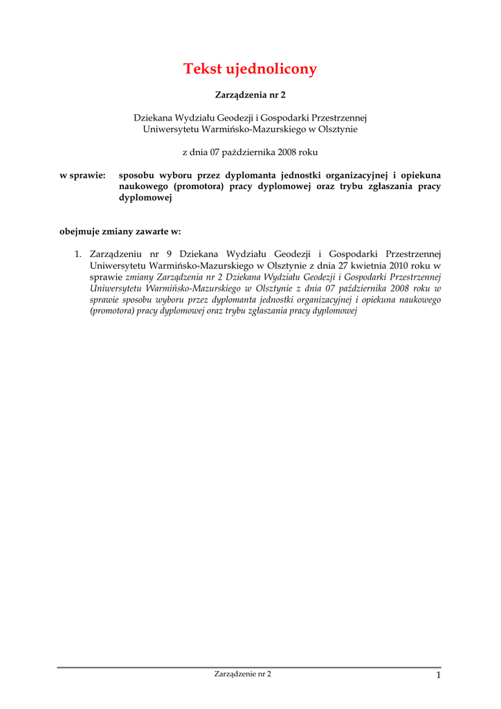 Tekst ujednolicony Zarządzenia nr 2 Dziekana Wydziału Geodezji i Gospodarki Przestrzennej Uniwersytetu Warmińsko-Mazurskiego w Olsztynie z dnia 07 października 2008 roku w sprawie: sposobu wyboru przez dyplomanta jednostki organizacyjnej i opiekuna naukowego (promotora) pracy dyplomowej oraz trybu zgłaszania pracy dyplomowej obejmuje zmiany zawarte w: 1. Zarządzeniu nr 9 Dziekana Wydziału Geodezji i Gospodarki Przestrzennej Uniwersytetu Warmińsko-Mazurskiego w Olsztynie z dnia 27 kwietnia 2010 roku w sprawie zmiany Zarządzenia nr 2 Dziekana Wydziału Geodezji i Gospodarki Przestrzennej Uniwersytetu Warmińsko-Mazurskiego w Olsztynie z dnia 07 października 2008 roku w sprawie sposobu wyboru przez dyplomanta jednostki organizacyjnej i opiekuna naukowego (promotora) pracy dyplomowej oraz trybu zgłaszania pracy dyplomowej Zarządzenie nr 2 1 Zarządzenie nr 2 Dziekana Wydziału Geodezji i Gospodarki Przestrzennej Uniwersytetu Warmińsko-Mazurskiego w Olsztynie z dnia 07 października 2008 roku w sprawie sposobu wyboru przez dyplomanta jednostki organizacyjnej i opiekuna naukowego (promotora) pracy dyplomowej oraz trybu zgłaszania pracy dyplomowej Działając na podstawie § 26 ust 2 pkt 5 i 6 Statutu Uniwersytetu Warmińsko-Mazurskiego w Olsztynie oraz § 41 ust. 2 Regulaminu Studiów stanowiącego załącznik do Uchwały Nr 99 Senatu Uniwersytetu Warmińsko-Mazurskiego w Olsztynie z dnia 30 czerwca 2006 r. (z późn. zm.) zarządza się co następuje: §1 1. Pracę dyplomową student wykonuje pod kierunkiem uprawnionego nauczyciela akademickiego. 2. Uprawnienia, o których mowa w ust. 1 posiada nauczyciel akademicki z tytułem naukowym profesora lub posiadający stopień naukowy doktora habilitowanego. 3. Uprawnienia, o których mowa w ust. 1 posiada nauczyciel akademicki ze stopniem naukowym doktora, którego rada wydziału upoważniła do kierowania pracą dyplomową. §2 1. Studentowi przysługuje swobodny wybór: a) Jednostki Organizacyjnej, w której chce przygotować pracę dyplomową, jednak w ramach limitu prac, który Prodziekan wyznacza danej Jednostce Organizacyjnej wydziału, z zastrzeżeniem ust. 3, b) opiekuna naukowego (promotora pracy) w wybranej Jednostce Organizacyjnej, pod kierunkiem którego chce przygotować pracę dyplomową, z zastrzeżeniem ust. 5 i ust. 6. 2. Limit prac, o którym mowa w ust. 1 litera a, ustalany jest według następujących zasad: a) odrębnie dla studiów stacjonarnych i niestacjonarnych, b) odrębnie dla każdej Jednostki Organizacyjnej z uwzględnieniem kierunku studiów, specjalności i formy kształcenia oraz zgłoszonego zapotrzebowania na prace dyplomowe. 3. W przypadku, gdy do danej Jednostki Organizacyjnej zgłosi się więcej Dyplomantów niż przydzielony limit prac, Prodziekan przygotowuje Listę Rankingową Średnich Ocen odrębnie dla studiów stacjonarnych i niestacjonarnych oraz dla poszczególnych Jednostek Organizacyjnych. Listę Rankingową Średnich Ocen oraz Wykaz Wolnych Miejsc w poszczególnych jednostkach są publikowane w serwisie www.geo.kortowo.pl w terminie 14 dni od dnia zakończenia rejestracji. 4. W przypadku, o którym mowa w ust. 3 ranking średnich ocen jest podstawą przyjęcia Dyplomanta do danej Jednostki Organizacyjnej. Dyplomanci, których średnia ocen nie pozwoliła na przyjęcie do danej jednostki są zobowiązani wybrać inną Jednostkę Organizacyjną. Zarządzenie nr 2 2 5. Kierownik Jednostki Organizacyjnej może określić inne, niż zawarte w ust. 1 litera b, zasady wyboru nauczyciela akademickiego w danej Jednostce Organizacyjnej, w tym wykorzystać listę Rankingową Średnich Ocen, o której mowa ust. 3. W przypadku określenia innych zasad wyboru Kierownik Jednostki Organizacyjnej jest zobowiązany opublikować na tablicy ogłoszeń w danej jednostce oraz w serwisie www.geo.kortowo.pl ustalone odrębne zasady wyboru nauczyciela akademickiego w terminie 30 dni przed terminem zakończenia rejestracji w danym roku akademickim. 6. Jeżeli Kierownik Jednostki Organizacyjnej określił zasady, o których mowa w ust. 5, i wyznaczył danego nauczyciela akademickiego do prowadzenia prac dyplomowych na studiach stacjonarnych i niestacjonarnych, liczba prac dyplomowych powinna być przydzielona w taki sposób, aby udział prac dyplomowych na studiach niestacjonarnych nie był mniejszy niż 30% ogólnej liczby prac przydzielonych danemu nauczycielowi akademickiemu. §3 1. Student chcący pisać pracę dyplomową w danej Jednostce Organizacyjnej zobowiązany jest, w wyznaczonych terminach, zarejestrować się w serwisie www.geo.kortowo.pl. 2. Studenci studiów pierwszego stopnia muszą zakończyć rejestrację do dnia 15 grudnia danego roku w trakcie trwania semestru V. 3. Studenci studiów drugiego stopnia muszą zakończyć rejestrację do dnia: a) 15 grudnia danego roku w przypadku naboru w ramach rekrutacji w miesiącu lipcu, b) 15 maja danego roku w przypadku naboru w ramach rekrutacji w miesiącu lutym. 4. Studenta, który w wyznaczonym terminie, o którym mowa w ust. 2 i 3 nie dokonał rejestracji Prodziekan przydziela do Jednostki Organizacyjnej w terminie odpowiednio do 30 grudnia i 30 czerwca. 5. Dyplomanci, których średnia ocen nie pozwoliła na przyjęcie do danej Jednostki Organizacyjnej są zobowiązani wybrać inną Jednostkę Organizacyjną, w której są wolne miejsca w terminie odpowiednio do 15 stycznia i 15 czerwca. Wyboru Jednostki Organizacyjnej Dyplomant dokonuje w oparciu o Wykaz Wolnych Miejsc w poszczególnych jednostkach opublikowany w serwisie www.geo.kortowo.pl. §4 1. W trakcie rejestracji Dyplomant podaje średnią ocen według następujących zasad: a) studia pierwszego stopnia (inżynierskie) – średnia arytmetyczna ocen, z dokładnością do dwóch miejsc po przecinku, ze wszystkich egzaminów oraz zaliczeń przedmiotów niekończących się egzaminem, uzyskanych na I i II roku studiów łącznie (semestry od I do IV); do średniej należy wliczyć wszystkie oc