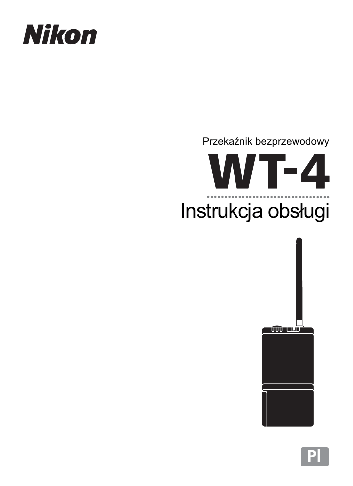 Przekaźnik bezprzewodowy Instrukcja obsługi Pl Informacje o znakach towarowych Macintosh i Mac OS są zarejestrowanymi znakami towarowymi firmy Apple Computer, Inc. Microsoft, Windows i Windows Vista są zarejestrowanymi znakami towarowymi firmy Microsoft Corporation. CompactFlash jest znakiem handlowym firmy SanDisk Corporation. Wszystkie inne nazwy handlowe wymienione w tej instrukcji obsługi lub innych dokumentach dołączonych do tego produktu Nikon są znakami towarowymi lub zarejestrowanymi znakami towarowymi odpowiednich właścicieli. Licencja publicznego kodu źródłowego firmy Apple Ten produkt zawiera kod źródłowy mDNS firmy Apple, który może być używany zgodnie z warunkami licencji publicznego kodu źródłowego firmy Apple znajdującej się na stronie: http://developer.apple.com/darwin/. Części kodu podlegają prawu autorskiemu © 1999-2003 Apple Computer, Inc. Wszelkie prawa zastrzeżone. Plik ten zawiera oryginalny kod i/lub modyfikacje oryginalnego kodu, które są opisane w i podlegają Licencji publicznego kodu źródłowego wersja 2.0 (Licencja). Nie można używać tego pliku w inny sposób niż opisany w Licencji. Pobierz kopię Licencji ze strony http://www.opensource.apple.com/apsl/ i przeczytaj ją przed rozpoczęciem użytkowania tego pliku. Oryginalny kod i wszelkie oprogramowanie dystrybuowane zgodnie z tą licencją jest dostarczane jako produkt „GOTOWY”, BEZ JAKICHKOLWIEK GWARANCJI WYRAŻONYCH LUB DOROZUMIANYCH I NINIEJSZYM FIRMA APPLE ZRZEKA SIĘ JAKICHKOLWIEK GWARANCJI WŁĄCZNIE Z GWARANCJAMI WARTOŚCI HANDLOWEJ I PRZYDATNOŚCI DO OKREŚLONYCH CELÓW, SPOKOJNEGO UŻYTKOWANIA LUB Z TYTUŁU NIENARUSZALNOŚCI PRAW OSÓB TRZECICH. W licencji znajdują się prawa i ograniczenia dotyczące niektórych języków. Dla Twojego bezpieczeństwa Dla Twojego bezpieczeństwa Aby zapobiec obrażeniom ciała i uszkodzeniu produktu Nikon, należy przeczytać całe poniższe zasady bezpieczeństwa przed rozpoczęciem użytkowania tego urządzenia. Należy przechowywać zasady bezpieczeństwa w miejscu, w którym wszyscy użytkownicy będą mogli je przeczytać. Groźne skutki nieprzestrzegania zasad bezpieczeństwa opisanych w tym rozdziale są oznaczone następującym symbolem: Ikona ta oznacza ostrzeżenia, informacje, które muszą być przeczytane przed użytkowaniem tego produktu, aby zapobiec możliwym obrażeniom ciała. ❏ OSTRZEŻENIA Nie rozbierać Nie stosowanie się do tego zalecenia może spowodować porażenie prądem elektrycznym, pożar lub inny wypadek. W razie pęknięcia produktu w wyniku upadku lub z innej przyczyny, należy odłączyć źródło zasilania aparatu i przekazać go do sprawdzenia w autoryzowanym serwisie firmy Nikon. W razie usterki należy natychmiast odłączyć zasilanie W przypadku wykrycia dymu lub dziwnego zapachu wydobywającego się z urządzenia należy natychmiast odłączyć zasilacz i wyjąć baterię, uważając, aby się nie poparzyć. Dalsze korzystanie z aparatu może doprowadzić do wypadku. Po wyjęciu baterii przekaż urządzenie do kontroli w autoryzowanym serwisie firmy Nikon. Nie należy używać urządzenia w pobliżu łatwopalnego gazu. Nie stosowanie się do tego zalecenia może spowodować eksplozję lub pożar. Urządzenie musi być suche Nie należy zanurzać w wodzie ani nie wystawiać na działanie wody lub deszczu. Nie stosowanie się do tego zalecenia może spowodować porażenie prądem elektrycznym lub pożar. Nie należy korzystać z urządzenia mając mokre ręce Nie stosowanie się do tego zalecenia może spowodować porażenie prądem elektrycznym. Przechowuj w miejscu niedostępnym dla dzieci Nie stosowanie się do tego zalecenia może spowodować obrażenie ciała. i Dla Twojego bezpieczeństwa Stosuj się do instrukcji podczas użytkowania akumulatora Akumulator może eksplodować lub może z niego wyciec kwas, gdy nie będzie prawidłowo użytkowany. Należy przestrzegać następujących zaleceń podczas użytkowania akumulatora dla tego produktu: • Sprawdź, czy produkt jest wyłączony podczas wymiany akumulatora. W przypadku korzystania z zasilacza sieciowego, należy sprawdzić, czy jest odłączony. • Należy używać tylko akumulatorów przeznaczonych do tego urządzenia. • Nie należy wkładać akumulatora do góry nogami lub tyłem. • Nie należy zwierać ani rozbierać akumulatorów. • Nie należy wystawiać akumulatora na działanie ognia lub zbytniego gorąca. • Nie należy zanurzać akumulatora w wodzie ani nie wystawiać go na działanie wilgoci. • Załóż pokrywę styków podczas transportu akumulatora. Nie należy przenosić lub przechowywać akumulatora razem z przedmiotami takimi, jak naszyjniki lub spinki. • Z całkowicie rozładowanego akumulatora może delete wystąpić kwas. Aby uniknąć uszkodzenia produktu, należy wyjąć z urządzenia rozładowany akumulator. • Gdy akumulator nie jest używany, załóż pokrywę styków i przechowuj go w miejscu. • Akumulator może być gorący natychmiast po użytkowaniu lub w przypadku gdy użytkowano produkt przez dłuższy okres czasu na zasilaniu bateryjnym. Przed wyjęciem akumulatora, wyłącz aparat i poczekaj na ostygnięcie akumulatora. • Należy niezwłocznie zaprzestać użytkowania akumulatora, w którym, w którym zauważono jakiekolwiek zmiany, takie jak odbarwienie lub odkształcenie. Nie należy wystawiać na działanie wysokich temperatur Nie należy pozostawiać urządzenia w zamkniętym pojeździe na słońcu lub w innych miejscach o bardzo wysokich temperaturach. Nie stosowanie się do tego zalecenia może spowodować popożar, uszkodzenie obudowy oraz wewnętrznych części. Należy zachować ostrożność podczas użytkowania anteny Podczas użytkowania anteny należy uważać, aby przypadkowo nie włożyć jej do oka. Nie stosowanie się do tego zalecenia może spowodować trwałe uszkodzenie wzroku. Płyty CD-ROM Płyty CD-ROM, na których znajduje się oprogramowanie i inst