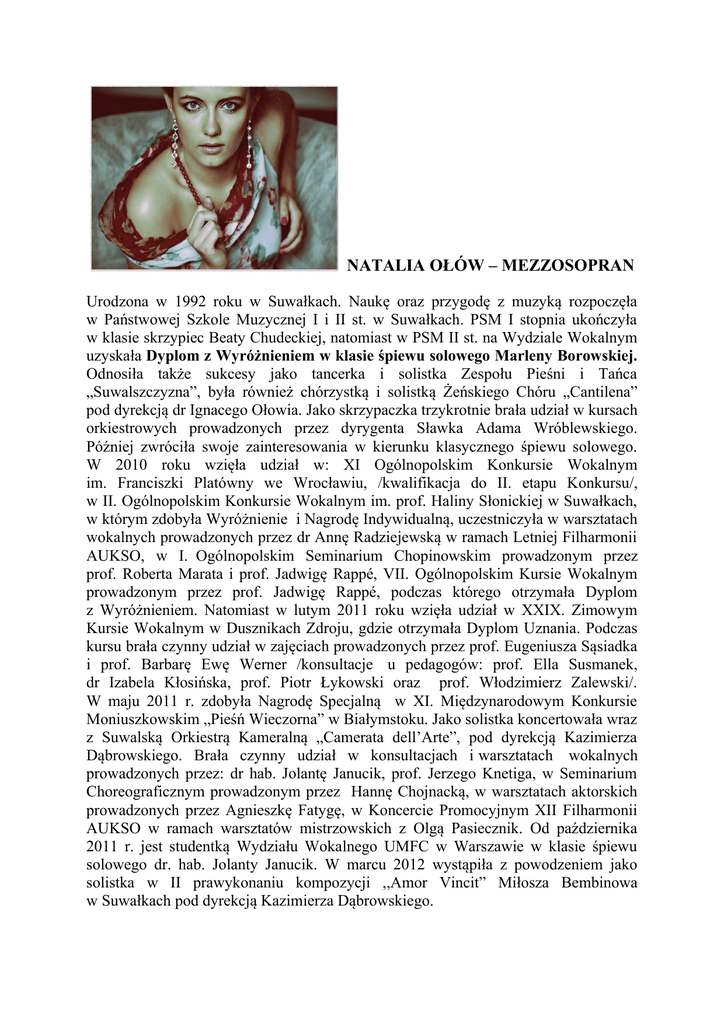 NATALIA OŁÓW – MEZZOSOPRAN Urodzona w 1992 roku w Suwałkach. Naukę oraz przygodę z muzyką rozpoczęła w Państwowej Szkole Muzycznej I i II st. w Suwałkach. PSM I stopnia ukończyła w klasie skrzypiec Beaty Chudeckiej, natomiast w PSM II st. na Wydziale Wokalnym uzyskała Dyplom z Wyróżnieniem w klasie śpiewu solowego Marleny Borowskiej. Odnosiła także sukcesy jako tancerka i solistka Zespołu Pieśni i Tańca „Suwalszczyzna”, była również chórzystką i solistką Żeńskiego Chóru „Cantilena” pod dyrekcją dr Ignacego Ołowia. Jako skrzypaczka trzykrotnie brała udział w kursach orkiestrowych prowadzonych przez dyrygenta Sławka Adama Wróblewskiego. Później zwróciła swoje zainteresowania w kierunku klasycznego śpiewu solowego. W 2010 roku wzięła udział w: XI Ogólnopolskim Konkursie Wokalnym im. Franciszki Platówny we Wrocławiu, /kwalifikacja do II. etapu Konkursu/, w II. Ogólnopolskim Konkursie Wokalnym im. prof. Haliny Słonickiej w Suwałkach, w którym zdobyła Wyróżnienie i Nagrodę Indywidualną, uczestniczyła w warsztatach wokalnych prowadzonych przez dr Annę Radziejewską w ramach Letniej Filharmonii AUKSO, w I. Ogólnopolskim Seminarium Chopinowskim prowadzonym przez prof. Roberta Marata i prof. Jadwigę Rappé, VII. Ogólnopolskim Kursie Wokalnym prowadzonym przez prof. Jadwigę Rappé, podczas którego otrzymała Dyplom z Wyróżnieniem. Natomiast w lutym 2011 roku wzięła udział w XXIX. Zimowym Kursie Wokalnym w Dusznikach Zdroju, gdzie otrzymała Dyplom Uznania. Podczas kursu brała czynny udział w zajęciach prowadzonych przez prof. Eugeniusza Sąsiadka i prof. Barbarę Ewę Werner /konsultacje u pedagogów: prof. Ella Susmanek, dr Izabela Kłosińska, prof. Piotr Łykowski oraz prof. Włodzimierz Zalewski/. W maju 2011 r. zdobyła Nagrodę Specjalną w XI. Międzynarodowym Konkursie Moniuszkowskim „Pieśń Wieczorna” w Białymstoku. Jako solistka koncertowała wraz z Suwalską Orkiestrą Kameralną „Camerata dell’Arte”, pod dyrekcją Kazimierza Dąbrowskiego. Brała czynny udział w konsultacjach i warsztatach wokalnych prowadzonych przez: dr hab. Jolantę Janucik, prof. Jerzego Knetiga, w Seminarium Choreograficznym prowadzonym przez Hannę Chojnacką, w warsztatach aktorskich prowadzonych przez Agnieszkę Fatygę, w Koncercie Promocyjnym XII Filharmonii AUKSO w ramach warsztatów mistrzowskich z Olgą Pasiecznik. Od października 2011 r. jest studentką Wydziału Wokalnego UMFC w Warszawie w klasie śpiewu solowego dr. hab. Jolanty Janucik. W marcu 2012 wystąpiła z powodzeniem jako solistka w II prawykonaniu kompozycji ,,Amor Vincit” Miłosza Bembinowa w Suwałkach pod dyrekcją Kazimierza Dąbrowskiego.