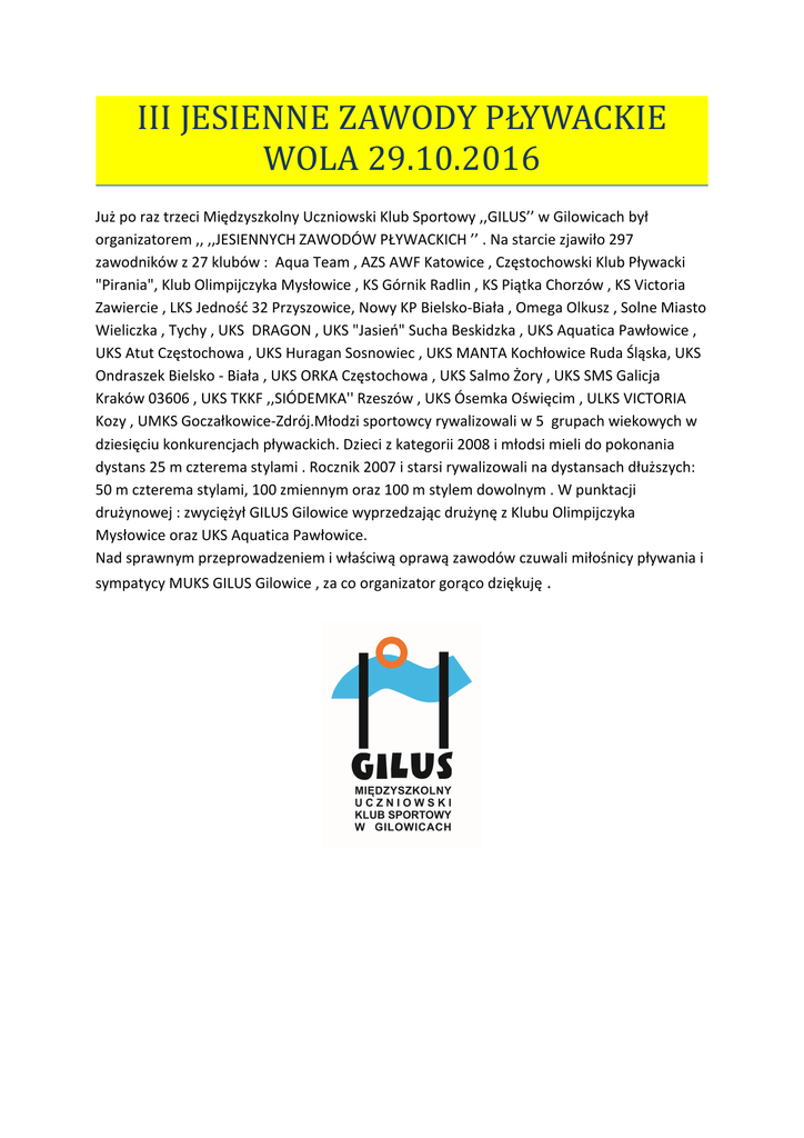 III JESIENNE ZAWODY PŁYWACKIE WOLA 29.10.2016 Już po raz trzeci Międzyszkolny Uczniowski Klub Sportowy ,,GILUS’’ w Gilowicach był organizatorem ,, ,,JESIENNYCH ZAWODÓW PŁYWACKICH ’’ . Na starcie zjawiło 297 zawodników z 27 klubów : Aqua Team , AZS AWF Katowice , Częstochowski Klub Pływacki "Pirania", Klub Olimpijczyka Mysłowice , KS Górnik Radlin , KS Piątka Chorzów , KS Victoria Zawiercie , LKS Jedność 32 Przyszowice, Nowy KP Bielsko-Biała , Omega Olkusz , Solne Miasto Wieliczka , Tychy , UKS DRAGON , UKS "Jasień" Sucha Beskidzka , UKS Aquatica Pawłowice , UKS Atut Częstochowa , UKS Huragan Sosnowiec , UKS MANTA Kochłowice Ruda Śląska, UKS Ondraszek Bielsko - Biała , UKS ORKA Częstochowa , UKS Salmo Żory , UKS SMS Galicja Kraków 03606 , UKS TKKF ,,SIÓDEMKA'' Rzeszów , UKS Ósemka Oświęcim , ULKS VICTORIA Kozy , UMKS Goczałkowice-Zdrój.Młodzi sportowcy rywalizowali w 5 grupach wiekowych w dziesięciu konkurencjach pływackich. Dzieci z kategorii 2008 i młodsi mieli do pokonania dystans 25 m czterema stylami . Rocznik 2007 i starsi rywalizowali na dystansach dłuższych: 50 m czterema stylami, 100 zmiennym oraz 100 m stylem dowolnym . W punktacji drużynowej : zwyciężył GILUS Gilowice wyprzedzając drużynę z Klubu Olimpijczyka Mysłowice oraz UKS Aquatica Pawłowice. Nad sprawnym przeprowadzeniem i właściwą oprawą zawodów czuwali miłośnicy pływania i sympatycy MUKS GILUS Gilowice , za co organizator gorąco dziękuję .