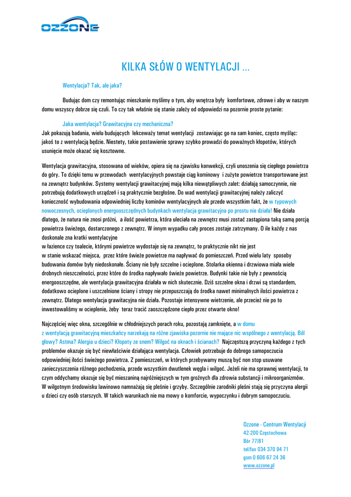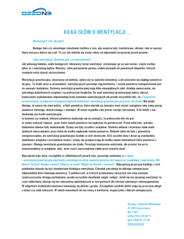 KILKA SŁÓW O WENTYLACJI … Wentylacja? Tak, ale jaka? Budując dom czy remontując mieszkanie myślimy o tym, aby wnętrza były komfortowe, zdrowe i aby w naszym domu wszyscy dobrze się czuli. To czy tak właśnie się stanie zależy od odpowiedzi na pozornie proste pytanie: Jaka wentylacja? Grawitacyjna czy mechaniczna? Jak pokazują badania, wielu budujących lekceważy temat wentylacji zostawiając go na sam koniec, często myśląc: jakoś to z wentylacją będzie. Niestety, takie postawienie sprawy szybko prowadzi do poważnych kłopotów, których usunięcie może okazać się kosztowne. Wentylacja grawitacyjna, stosowana od wieków, opiera się na zjawisku konwekcji, czyli unoszenia się ciepłego powietrza do góry. To dzięki temu w przewodach wentylacyjnych powstaje ciąg kominowy i zużyte powietrze transportowane jest na zewnątrz budynków. Systemy wentylacji grawitacyjnej mają kilka niewątpliwych zalet: działają samoczynnie, nie potrzebują dodatkowych urządzeń i są praktycznie bezgłośne. Do wad wentylacji grawitacyjnej należy zaliczyć konieczność wybudowania odpowiedniej liczby kominów wentylacyjnych ale przede wszystkim fakt, że w typowych nowoczesnych, ocieplonych energooszczędnych budynkach wentylacja grawitacyjna po prostu nie działa! Nie działa dlatego, że natura nie znosi próżni, a ilość powietrza, która uleciała na zewnętrz musi zostać zastąpiona taką samą porcją powietrza świeżego, dostarczonego z zewnątrz. W innym wypadku cały proces zostaje zatrzymany. O ile każdy z nas doskonale zna kratki wentylacyjne w łazience czy toalecie, którymi powietrze wydostaje się na zewnątrz, to praktycznie nikt nie jest w stanie wskazać miejsca, przez które świeże powietrze ma napływać do pomieszczeń. Przed wielu laty sposoby budowania domów były niedoskonałe. Ściany nie były szczelne i ocieplone. Stolarka okienna i drzwiowa miała wiele drobnych nieszczelności, przez które do środka napływało świeże powietrze. Budynki takie nie były z pewnością energooszczędne, ale wentylacja grawitacyjna działała w nich skutecznie. Dziś szczelne okna i drzwi są standardem, dodatkowo ocieplone i uszczelnione ściany i stropy nie przepuszczają do środka nawet minimalnych ilości powietrza z zewnątrz. Dlatego wentylacja grawitacyjna nie działa. Pozostaje intensywne wietrzenie, ale przecież nie po to inwestowaliśmy w ocieplenie, żeby teraz tracić zaoszczędzone ciepło przez otwarte okno! Najczęściej więc okna, szczególnie w chłodniejszych porach roku, pozostają zamknięte, a w domu z wentylacją grawitacyjną mieszkańcy narzekają na różne zjawiska pozornie nie mające nic wspólnego z wentylacją. Ból głowy? Astma? Alergia u dzieci? Kłopoty ze snem? Wilgoć na oknach i ścianach? Najczęstszą przyczyną każdego z tych problemów okazuje się być niewłaściwie działająca wentylacja. Człowiek potrzebuje do dobrego samopoczucia odpowiedniej ilości świeżego powietrza. Z pomieszczeń, w których przebywamy muszą być non stop usuwane zanieczyszczenia różnego pochodzenia, przede wszystkim dwutlenek węgla i wilgoć. Jeżeli nie ma sprawnej wentylacji, to czym oddychamy okazuje się być mieszaniną najróżniejszych w tym groźnych dla zdrowia substancji i mikroorganizmów. W wilgotnym środowisku lawinowo namnażają się pleśnie i grzyby. Szczególnie zarodniki pleśni stają się przyczyna alergii u dzieci czy osób starszych. W takich warunkach nie ma mowy o komforcie, wypoczynku i dobrym samopoczuciu. Ozzone - Centrum Wentylacji 42-200 Częstochowa Bór 77/81 tel/fax 034 370 94 71 gsm 0 606 67 24 36 www.ozzone.pl Chwilowe, nawet bardzo intensywne, wietrzenie pomieszczeń niewiele pomaga i nie przynosi ulgi, ponieważ tylko ciągły proces wymiany powietrza jest skuteczny. Czy jest zatem możliwe połączenie skutecznej i komfortowej wentylacji z oszczędzaniem energii? Tak, jest to możliwe przy zastosowaniu systemów wentylacji mechanicznej nawiewno – wywiewnej z odzyskiem ciepła. Za tą nieco rozbudowaną i skomplikowaną nazwą kryje się urządzenie, które spełnia jednocześnie kilka funkcji. Po pierwsze urządzenie to – zwane potocznie centralą wentylacyjną – non stop usuwa z pomieszczeń zużyte powietrze wraz z wilgocią i wszystkimi zanieczyszczeniami. Powietrze jest z reguły usuwane bezpośrednio z miejsc, w których powstaje wilgoć czy nieprzyjemne zapachy czyli z łazienki toalety, kuchni i ewentualnie pralni. W tym samym czasie dokładnie taka sama ilość świeżego powietrza jest dostarczana do pomieszczeń, gdzie najczęściej przebywają domownicy czyli do sypialni, pokoi czy salonu. Dzięki tym dwóm procesom mamy w domu zawsze optymalną ilość powietrza przepływającego od sypialni do kuchni czy łazienki. W samej centrali zamontowane są dodatkowo filtry i powietrze zewnętrzne, zanim dotrze do pomieszczeń, jest oczyszczane z kurzu czy drobnych zanieczyszczeń. Osoby uczulone np. na pyłki roślin mogą zastosować w centrali wentylacyjnej filtry o większej gęstości zatrzymujące także te popularne alergeny. Kolejną zaletą systemu wentylacji mechanicznej jest fakt, że cały proces wymiany powietrza odbywa się przy pomocy wentylatorów, których pracą możemy sterować. Tak więc jeżeli w domu nie ma nikogo urządzenie pracuje z minimalną wydajnością, zapewniając podstawowy stopień wymiany powietrza. Nie ma potrzeby zostawiania otwartych, czy nawet uchylonych okien będących często zaproszeniem dla złodzieja. Jeżeli w domu są mieszkańcy system pracuje ze średnią wydajnością dającą domownikom pełen komfort do pracy czy wypoczynku. W szczególnych przypadkach (np. większa niż zwykle liczba osób w domu, konieczność szybkiego przewietrzenia pomieszczeń) centrala wentylacyjna może pracować z maksymalną wydajnością skutecznie usuwając np. nieprzyjemne zapachy z kuchni. W naszych warunkach klimatycznych bardzo duże znaczenie ma 