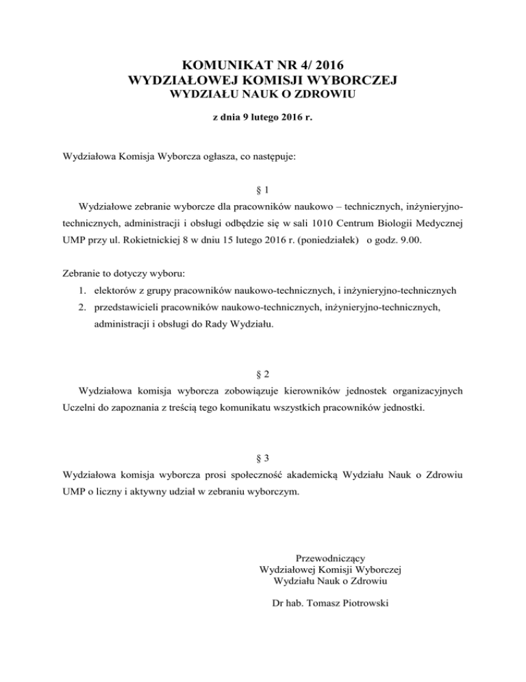 KOMUNIKAT NR 4/ 2016 WYDZIAŁOWEJ KOMISJI WYBORCZEJ WYDZIAŁU NAUK O ZDROWIU z dnia 9 lutego 2016 r. Wydziałowa Komisja Wyborcza ogłasza, co następuje: §1 Wydziałowe zebranie wyborcze dla pracowników naukowo – technicznych, inżynieryjnotechnicznych, administracji i obsługi odbędzie się w sali 1010 Centrum Biologii Medycznej UMP przy ul. Rokietnickiej 8 w dniu 15 lutego 2016 r. (poniedziałek) o godz. 9.00. Zebranie to dotyczy wyboru: 1. elektorów z grupy pracowników naukowo-technicznych, i inżynieryjno-technicznych 2. przedstawicieli pracowników naukowo-technicznych, inżynieryjno-technicznych, administracji i obsługi do Rady Wydziału. §2 Wydziałowa komisja wyborcza zobowiązuje kierowników jednostek organizacyjnych Uczelni do zapoznania z treścią tego komunikatu wszystkich pracowników jednostki. §3 Wydziałowa komisja wyborcza prosi społeczność akademicką Wydziału Nauk o Zdrowiu UMP o liczny i aktywny udział w zebraniu wyborczym. Przewodniczący Wydziałowej Komisji Wyborczej Wydziału Nauk o Zdrowiu Dr hab. Tomasz Piotrowski