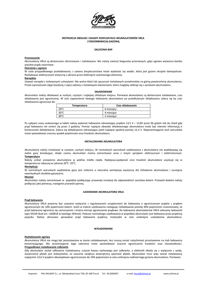 INSTRUKCJA OBSŁUGI I ZASADY EKSPLOATACJI AKUMULATORÓW VRLA Z REKOMBINACJĄ GAZOWĄ ZALECENIA BHP Przenoszenie Akumulatory VRLA są dostarczane uformowane i naładowane. Nie należy zwierać biegunów przeciwnych, gdyż ogniwo wytwarza bardzo wysokie prądy zwarciowe. Ostrożnie z ogniem W razie przypadkowego przeładowania, z zaworu bezpieczeństwa może wydostać się wodór, który jest gazem skrajnie łatwopalnym. Rozładować elektryczność statyczną z ubrania przez dotknięcie uziemionego elementu. Narzędzia Używać narzędzi z izolowanymi uchwytami. Nie wolno kłaść lub upuszczać metalowych przedmiotów na górną powierzchnię akumulatora. Przed czynnościami zdjąć biżuterię i części odzieży z metalowymi elementami, które mogłyby zetknąć się z zaciskami akumulatora. SKŁADOWANIE Akumulator należy składować w suchym, czystym i najlepiej chłodnym miejscu. Ponieważ akumulatory są dostarczone naładowane, czas składowania jest ograniczony. W celu zapewnienia łatwego ładowania akumulatora po przedłużonym składowaniu zaleca się by czas składowania ograniczyć do: Temperatura Czas składowania 20°C 6 miesięcy 30°C 4 miesiące 40°C 2 miesiące Po upływie czasu wskazanego w tabeli należy wykonać ładowanie odnawiające prądem 13,5 V – 13,8V przez 96 godzin lub do chwili gdy prąd ładowania nie zmieni się przez 3 godziny. Pomiar napięcia obwodu składowanego akumulatora może być również informacją o konieczności doładowania. Zaleca się doładowanie odnawiające jeżeli napięcie spadnie poniżej 12,3 V. Nieprzestrzeganie tych warunków może spowodować znaczny spadek pojemności oraz trwałości akumulatora. INSTALOWANIE AKUMULATORA Akumulatory należy instalować w czystym, suchym miejscu. W normalnych warunkach użytkowania z akumulatora nie wydobywają się żadne gazy korodujące, dzięki czemu akumulator można zamontować wraz z innym sprzętem elektrycznym i elektronicznym. Temperatura Należy unikać ustawienia akumulatora w pobliżu źródła ciepła. Najlepszą wydajność oraz trwałość akumulatora uzyskuje się w temperaturze roboczej w zakresie 200C -250C. Wentylacja W normalnych warunkach wydzielanie gazu jest znikome a naturalna wentylacja wystarczy dla chłodzenia akumulatora i usunięcia ewentualnych skutków gazowania. Montaż Akumulator należy zamontować w pojeździe podłączając przewody instalacji do odpowiednich zacisków baterii. Przewód dodatni należy podłączyć jako pierwszy, następnie przewód ujemny. ŁADOWANIE AKUMULATORA VRLA Prąd ładowania Akumulatory VRLA powinny być używane wyłącznie z regulowanymi urządzeniami do ładowania o ograniczonym prądzie z prądem ograniczonym do 10% pojemności baterii. Jeżeli w trakcie użytkowania następuje rozładowanie poniżej 40% pojemności znamionowej, to prąd ładowania ogranicza się samoczynnie i można ominąć ograniczenie prądowe. Do ładowania akumulatorów VRLA zalecamy ładowarki typu 5015R (kod art.: AA0018 w katalogu Wilmat). Podczas normalnego użytkowania w pojeździe akumulator jest ładowany przez prądnicę pojazdu. Należy okresowo sprawdzać prąd ładowania prądnicy motocykla w celu uniknięcia uszkodzenia akumulatora. WYŁADOWANIE Rozładowanie ogniwa Akumulatory VRLA nie mogą być pozostawione w stanie rozładowanym, lecz muszą zostać natychmiast przestawione na tryb ładowania konserwującego. Nie przestrzeganie tego zalecenia może spowodować znaczne ograniczenia trwałości oraz niezawodności. Przypadkowe rozładowanie całkowite Gdy akumulator został całkowicie rozładowany, zużycie kwasu siarkowego jest całkowite, a elektrolit składa się z wyłącznie z wody. Zasiarczenie płytek jest maksymalne, co znacznie zwiększa wewnętrzną oporność płytek. Akumulator musi więc zostać naładowany napięciem 13,6 V prądem obowiązkowo ograniczonym do 10% pojemności w celu uniknięcia nadmiernego grzania akumulatora. Ponieważ Importer: FHU WILMAT S.J., ul. Skłodowkiej-Curie 73D, 87-100 Toruń Tel.: 56 6583937 e-mail: [email protected] www.wilmat.pl początkowa oporność jest wysoka, to minimalny czas ładowania musi wynosić 96 godzin. UWAGA: zbyt głębokie rozładowania spowodują przedwczesne zniszczenie akumulatora i ma znaczny wpływ na trwałość. KONSERWACJA / KONTROLA VRLA są akumulatorami kwasowo - ołowiowymi, bezobsługowymi, szczelnie zamkniętymi i nie muszą być napełniane. Pojemniki oraz pokrywy muszą być suche i bez kurzu. Raz w miesiącu należy sprawdzić czy całkowite napięcie końcówek akumulatora wynosi min. 13,5V w temperaturze 20°C. Raz w roku należy wykonać pomiar napięcia akumulatora. Przy dłuższym składowaniu akumulatorów zalecamy wypełnianie poniższej tabeli, w której zapisywane są zmierzone wartości jak również parametry ładowania. Raz w roku należy wykonać próbę trwałości akumulatora. Tabela ładowania składowanego akumulatora: Data pomiaru Zmierzone napięcie Czas ładowania Napięcie po ładowaniu Data następnego pomiaru/ładowania WARUNKI GWARANCJI Gwarancja obejmuje wadliwe wykonanie i materiały. Okres gwarancji wynosi 12 miesięcy od daty sprzedaży nie dłużej niż 24 miesiące od daty produkcji akumulatora oznaczonej na obudowie. W przypadku wykrycia wady lub niewłaściwej pracy akumulatora należy ten fakt zgłosić u sprzedawcy przedkładając niniejszą prawidłowo wypełnioną gwarancję, dowód zakupu i reklamowy akumulator. Reklamacja zostanie rozpatrzona w ciągu 14 dniu. Gwarancja traci moc w przypadku uszkodzeń mechanicznych; zasiarczenia ogniw wynikającego z niesprawnej instalacji elektrycznej motocykla; niewłaściwego przechowywania lub niewłaściwego zamontowania akumulatora w pojeździe; eksploatowania akumulatora w sposób niezgodny z instrukcją obsługi. Wszelkie przeróbki lub naprawy wykonane przez niepowołane do tego osoby w szczególności próby otwierania pokrywy akumulatora, powodują również utratę praw wyni