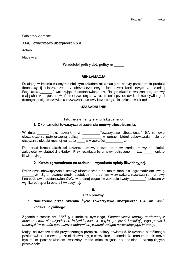 Poznań _______ roku Odbiorca/ Adresat: XXX, Towarzystwo Ubezpieczeń S.A. Adres….. Nadawca: Właściciel polisy dot. polisy nr _____ REKLAMACJA Działając w imieniu własnym niniejszym składam reklamację na nabyty przeze mnie produkt finansowy tj. ubezpieczenie z ubezpieczeniowym funduszem kapitałowym ze składką Regularną „______ ” wskazując, iż postanowienia określające skutki rozwiązania tej umowy mają charakter postanowień niedozwolonych w rozumieniu przepisów kodeksu cywilnego i domagając się umożliwienia rozwiązania umowy bez potrącania jakichkolwiek opłat. UZASADNIENIE I. Istotne elementy stanu faktycznego 1. Okoliczności towarzyszące zawarciu umowy ubezpieczenia. W dniu ______ roku zawarłam z _________Towarzystwo Ubezpieczeń SA (umowę ubezpieczenia potwierdzoną polisą __________ w ramach której zobowiązałam się do uiszczania składki rocznej na rzecz ____ w wysokości _________ zł. Po ponad trzech latach od zawarcia umowy doszło do rozwiązania umowy na skutek zaległości w płatności składek. Przy rozwiązaniu umowy potrącono mi tzw _____ opłatę likwidacyjną. 2. Kwota zgromadzona na rachunku, wysokość opłaty likwidacyjnej. Przez czas obowiązywania umowy ubezpieczenia na moim rachunku zgromadziłam kwotę ______ zł. Zgromadzone środki zostałyby mi przy tym w związku z rozwiązaniem umowy i na podstawie postanowień OWU w istotnej części (w zakresie kwoty ________) pobrane w wyniku potrącenia opłaty likwidacyjnej. II. Stan prawny 1. Naruszenie przez Skandia Życie Towarzystwo Ubezpieczeń S.A. art. 3851 kodeksu cywilnego. Zgodnie z treścią art. 3851 § 1 kodeksu cywilnego, Postanowienia umowy zawieranej z konsumentem nie uzgodnione indywidualnie nie wiążą go, jeżeli kształtują jego prawa i obowiązki w sposób sprzeczny z dobrymi obyczajami, rażąco naruszając jego interesy. Mając na uwadze treść przytoczonego przepisu, należy stwierdzić, iż uznanie określonego postanowienia umownego za niedozwolony, a w rezultacie uznanie, że konsument nie może być takim postanowieniem związany, może mieć miejsce po spełnieniu następujących przesłanek: 3. postanowienie nie zostało uzgodnione indywidualnie; 4. postanowienie umowy nie dotyczy sformułowanych w sposób jednoznaczny głównych świadczeń stron; 5. ukształtowane w ten sposób prawa i obowiązki konsumenta pozostają w sprzeczności z dobrymi obyczajami; 6. ukształtowane we wskazany sposób prawa i obowiązki rażąco naruszają interesy konsumenta; W świetle okoliczności faktycznych związanych z zawarciem spornych Umów oraz treścią ich postanowień, istnieją przesłanki do jednoznacznego przyjęcia, że w kwestionowanym zakresie mnie one nie wiążą. ad. 1) brak indywidualnego uzgodnienia postanowień umowy, z których wynikało uprawnienie Skandii do potrącania istotnej części zgromadzonych przez konsumenta środków w przypadku rozwiązania umowy. Postanowienia, z których ______ TU. S.A. wywodzi uprawnienie do pobierania opłaty likwidacyjnej nie były uzgadniane ze mną indywidualnie. Ogólne warunki ubezpieczenia na Życie z Ubezpieczeniowym Funduszem Kapitałowym ze Składką Regularną „_______” oraz załącznik nr 1 określający wysokość potrąceń w przypadku rozwiązania umowy, stanowiący integralną część tychże ogólnych są przedkładane konsumentowi wyrażającemu wolę zawarcia umowy ubezpieczenia i nie podlegają żadnym zmianom w wyniku negocjacji z konsumentem. Fakt ten należy uznać za bezsporny. ad. 2) postanowienie nie dotyczy sformułowanych w sposób jednoznaczny głównych świadczeń stron Postanowienia umowy, nakładające na mojego Klienta „karę” za wcześniejsze rozwiązanie umowy nie dotyczą głównych świadczeń stron umowy. Przez główne świadczenia stron należy uznać takie elementy konstrukcyjne umowy, bez których nie doszłoby do jej zawarcia, czyli tzw. essentialia negotii. W niniejszej sprawie, do świadczeń należy zaliczyć – ze strony ubezpieczyciela- świadczenie usług ubezpieczeniowo-inwestycyjnych na moją rzecz, z mojej zaś strony - zapłatę za te usługi. ad. 3) ukształtowanie praw i obowiązków konsumenta w sprzeczności z dobrymi obyczajami Przewidziane w umowie uprawnienie zakładające potrącenie całości lub bardzo istotnej części zgromadzonych przez ubezpieczonego środków wskutek rozwiązania umowy narusza dobre obyczaje. Sporne postanowienia sankcjonują bowiem przejęcie przez ubezpieczyciela całości (w pierwszych dwóch latach __% wartość rachunku) lub bardzo istotnej części (w kolejnych latach obowiązywania umowy) wykupionych środków w całkowitym oderwaniu od skali poniesionych przez ______ wydatków. Waga naruszenia dobrych obyczajów potęgowana jest faktem, że we wzorcu umowy stosowanym przez _____ nie wskazano wyczerpujących wyjaśnień pojęć, z których wynika uprawnienie _____ do potrącania środków zgromadzonych przez ubezpieczonego , a wyłącznie jej wysokość i okoliczności, w których ____ uzyskuje uprawnienie do ich potrącenia. Nie do pogodzenia z dobrymi obyczajami jest więc sytuacja, w której wysokość tych kosztów nie jest we wzorcu umownym uzasadniona wskazaniem świadczeń wzajemnych, taki koszt uzasadniających. Brak natomiast wskazania źródeł takiego świadczenia narusza obowiązek kompletnego informowania konsumentów o istotnych okolicznościach dotyczących ich praw i obowiązków. 1 ad. 4) rażące naruszenie interesów konsumenta 1 Por. wyrok sądu okręgowego w Warszawie z dnia 9 stycznia 2012 roku, sygn. XVII AmC 355/11, niepubl. Po czwarte, kwestionowane przeze mnie _____ postanowienia rażąco naruszają jego interesy. Zgodnie z orzeczeniem Sądu Apelacyjnego w Warszawie w analogicznej sprawie, podobne postanowienie (zakładające pobranie tytułem opłaty likwidacyjnej 100% zgromadzonych środków w ciągu dwóch lat od podpisania umowy) rażąco naruszają interesy konsumenta, gdyż prowadz