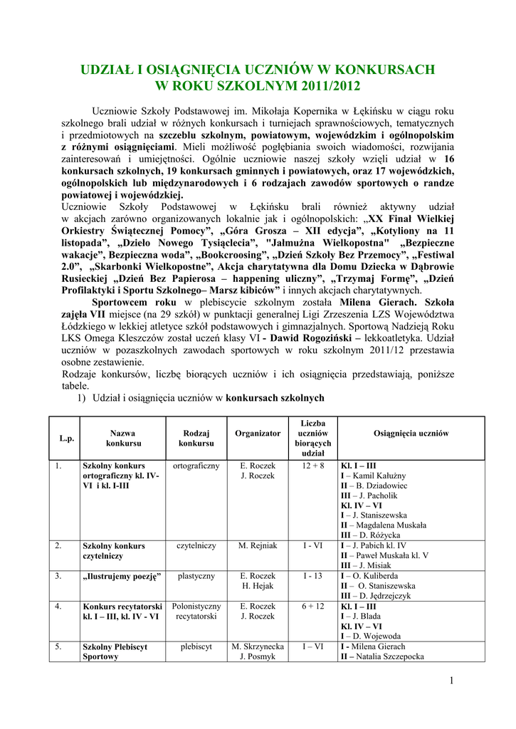 UDZIAŁ I OSIĄGNIĘCIA UCZNIÓW W KONKURSACH W ROKU SZKOLNYM 2011/2012 Uczniowie Szkoły Podstawowej im. Mikołaja Kopernika w Łękińsku w ciągu roku szkolnego brali udział w różnych konkursach i turniejach sprawnościowych, tematycznych i przedmiotowych na szczeblu szkolnym, powiatowym, wojewódzkim i ogólnopolskim z różnymi osiągnięciami. Mieli możliwość pogłębiania swoich wiadomości, rozwijania zainteresowań i umiejętności. Ogólnie uczniowie naszej szkoły wzięli udział w 16 konkursach szkolnych, 19 konkursach gminnych i powiatowych, oraz 17 wojewódzkich, ogólnopolskich lub międzynarodowych i 6 rodzajach zawodów sportowych o randze powiatowej i wojewódzkiej. Uczniowie Szkoły Podstawowej w Łękińsku brali również aktywny udział w akcjach zarówno organizowanych lokalnie jak i ogólnopolskich: „XX Finał Wielkiej Orkiestry Świątecznej Pomocy”, „Góra Grosza – XII edycja”, „Kotyliony na 11 listopada”, „Dzieło Nowego Tysiąclecia”, "Jałmużna Wielkopostna" „Bezpieczne wakacje”, Bezpieczna woda”, „Bookcroosing”, „Dzień Szkoły Bez Przemocy”, „Festiwal 2.0”, „Skarbonki Wielkopostne”, Akcja charytatywna dla Domu Dziecka w Dąbrowie Rusieckiej „Dzień Bez Papierosa – happening uliczny”, „Trzymaj Formę”, „Dzień Profilaktyki i Sportu Szkolnego– Marsz kibiców” i innych akcjach charytatywnych. Sportowcem roku w plebiscycie szkolnym została Milena Gierach. Szkoła zajęła VII miejsce (na 29 szkół) w punktacji generalnej Ligi Zrzeszenia LZS Województwa Łódzkiego w lekkiej atletyce szkół podstawowych i gimnazjalnych. Sportową Nadzieją Roku LKS Omega Kleszczów został uczeń klasy VI - Dawid Rogoziński – lekkoatletyka. Udział uczniów w pozaszkolnych zawodach sportowych w roku szkolnym 2011/12 przestawia osobne zestawienie. Rodzaje konkursów, liczbę biorących uczniów i ich osiągnięcia przedstawiają, poniższe tabele. 1) Udział i osiągnięcia uczniów w konkursach szkolnych L.p. Nazwa konkursu Rodzaj konkursu Organizator ortograficzny E. Roczek J. Roczek Liczba uczniów biorących udział 12 + 8 1. Szkolny konkurs ortograficzny kl. IVVI i kl. I-III 2. Szkolny konkurs czytelniczy czytelniczy M. Rejniak I - VI 3. „Ilustrujemy poezję” plastyczny E. Roczek H. Hejak I - 13 4. Konkurs recytatorski kl. I – III, kl. IV - VI Polonistyczny recytatorski E. Roczek J. Roczek 6 + 12 5. Szkolny Plebiscyt Sportowy plebiscyt M. Skrzynecka J. Posmyk I – VI Osiągnięcia uczniów Kl. I – III I – Kamil Kałużny II – B. Dziadowiec III – J. Pacholik Kl. IV – VI I – J. Staniszewska II – Magdalena Muskała III – D. Różycka I – J. Pabich kl. IV II – Paweł Muskała kl. V III – J. Misiak I – O. Kuliberda II – O. Staniszewska III – D. Jędrzejczyk Kl. I – III I – J. Blada Kl. IV – VI I – D. Wojewoda I - Milena Gierach II – Natalia Szczepocka 1 III – Paweł Pajęcki, Szymon Kupka „Sportowiec roku” „20 lat Państwowej Straży Pożarnej - jak nas widzą, tak malują” Konkurs „Szybkiego czytania” 6. 7. „Zimowa pomoc dla zwierząt” Zbiórka makulatury 8. 9. plastyczny M. Jegier I-VI 21 11 prac uczniów wysłanych na konkurs gminny polonistyczny E. Roczek J. Roczek II – III 17 IV – VI 7 plastyczny M. Jegier ekologiczny – podsumowanie roczne M. Jegier I – VI 21 Kl. I – VI 28 Kl. II – III I – B. Dziadowiec II – J. Pacholik III – B. Bednarz Kl. IV – VI I – Karol Fryś II – Milena Gierach III – J. Staniszewska 12 prac wysłanych na konkurs powiatowy I – P. Krawczyk II – K. Pulwert III– N. Szczepocka Ogólnie zebrano ok. 2500 kg makulatury I – klasa IV I – M. Rogoziński, II – J. Bednarski III – M. Muskała, J. Muskała Ogólnie zebrano 1443 puszek I – klasa VI I – K. Kazior II – Konrad Fryś, III– J. Pabich, P. Augustyńczyk Ogólnie zebrano 1512 baterii. I – klasa IV 6 uczniów zakwalifikowało się do etapu gminnego: P. Muskała, P. Oleszczyk, P. Krawczykowska, K. Pulwert, S. Koper, Magdalena Muskała I – K. Kazior II – A. Pajęcka III – M. Muskała Wszyscy nagrodzeni 10. Zbiórka puszek aluminiowych ekologiczny – podsumowanie roczne M. Jegier 11. Zbiórka zużytych baterii ekologiczny – podsumowanie roczne M. Jegier Kl. I – VI 19 12. Turniej Wiedzy Pożarniczej i Ekologicznej wiedzy pożarniczej i ekologicznej M. Jegier III-VI 21 13. „Bookcrosing – poszukiwacze książek” „Biblioteka ciągle w grze – plakat Euro 2012” „Nie pal przy mnie, proszę” środowiskowyterenowy N. Podlejska M. Rejniak I - VI plastyczny N. Podlejska W. Pacholik M. Rejniak N. Podlejska I - VI 27 Szkolny Konkurs Matematyczny „Dlaczego matematyka” matematyczny G. Szczęsna III-VI 25 14. 15. 16. plastyczny profilaktyczny Kl. I – VI 9 I - III 8 I – Kinga Bartyzel II – D. Jędrzejczyk III – O. Kuliberda Wyróżnienia dla 13 uczniów 2) Udział i osiągnięcia uczniów w konkursach gminnych i powiatowych Lp. 1. Nazwa konkursu „Korczak – postać, idee i twórczość” gminny Rodzaj konkursu Osoba przygotowując a plastyczny M. Jegier Liczba uczniów biorących udział I- VI 51/100 Osiągnięcia uczniów Kl. I – III II – O. Staniszewska Kl. IV – VI 2 I – E. Jegier II – P. Krawczyk III – J. Staniszewska 2. 3. 4. 5. 6. 7. 8. 9. 10. 11. 12. 13. 14. „II Gminny Konkurs o Janie Pawle II” wiedzy religijnej W. Pacholik IV – VI 6/54 „Jan Paweł II – człowiek modlitwy” gminny „Tęczowe wierszyki” gminny Turniej Wiedzy Pożarniczej i Ekologicznej gminny „Portret Wielkiego astronoma”, „Gdy patrzę w gwiazdy” , gminny plastyczny W. Pacholik I - III 10 recytatorski H. Hejak III – O. Staniszewska wiedzy pożarniczej i ekologicznej M. Jegier I 3/20 III-VI 12 plastyczny J. Roczek E. Roczek M. Cybulska Berencz I – VI 83/127 plastyczny ekologiczny Wychowwcy kl. I – III M. Jegier M. Jegier I – VI 60 Kl. I – III Wyróżnienia: Oliwia Staniszewska kl. I Kamil Misia