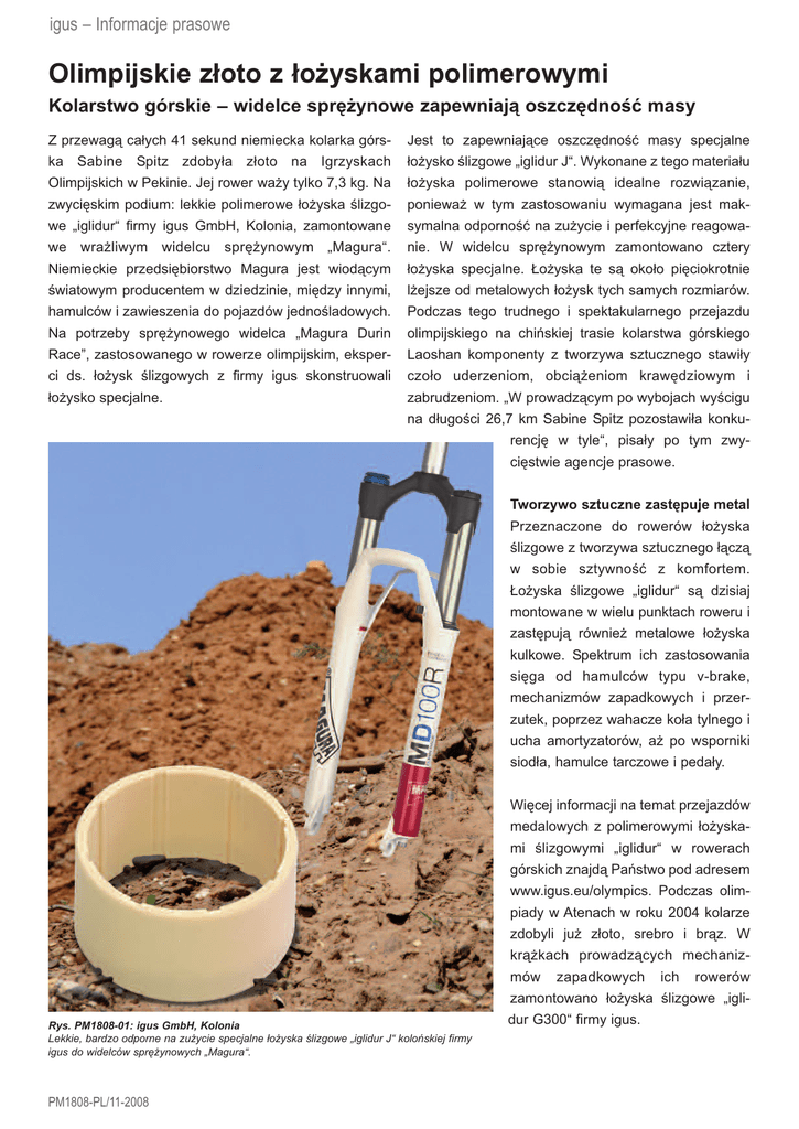 igus – Informacje prasowe Olimpijskie złoto z łożyskami polimerowymi Kolarstwo górskie – widelce sprężynowe zapewniają oszczędność masy Z przewagą całych 41 sekund niemiecka kolarka górska Sabine Spitz zdobyła złoto na Igrzyskach Olimpijskich w Pekinie. Jej rower waży tylko 7,3 kg. Na Jest to zapewniające oszczędność masy specjalne łożysko ślizgowe „iglidur J“. Wykonane z tego materiału łożyska polimerowe stanowią idealne rozwiązanie, zwycięskim podium: lekkie polimerowe łożyska ślizgo- ponieważ w tym zastosowaniu wymagana jest mak- we wrażliwym widelcu sprężynowym „Magura“. nie. W widelcu sprężynowym zamontowano cztery we „iglidur“ firmy igus GmbH, Kolonia, zamontowane Niemieckie przedsiębiorstwo Magura jest wiodącym światowym producentem w dziedzinie, między innymi, symalna odporność na zużycie i perfekcyjne reagowa- łożyska specjalne. Łożyska te są około pięciokrotnie lżejsze od metalowych łożysk tych samych rozmiarów. hamulców i zawieszenia do pojazdów jednośladowych. Podczas tego trudnego i spektakularnego przejazdu Race”, zastosowanego w rowerze olimpijskim, eksper- Laoshan komponenty z tworzywa sztucznego stawiły Na potrzeby sprężynowego widelca „Magura Durin ci ds. łożysk ślizgowych z firmy igus skonstruowali łożysko specjalne. olimpijskiego na chińskiej trasie kolarstwa górskiego czoło uderzeniom, obciążeniom krawędziowym i zabrudzeniom. „W prowadzącym po wybojach wyścigu na długości 26,7 km Sabine Spitz pozostawiła konkurencję w tyle“, pisały po tym zwycięstwie agencje prasowe. Tworzywo sztuczne zastępuje metal Przeznaczone do rowerów łożyska ślizgowe z tworzywa sztucznego łączą w sobie sztywność z komfortem. Łożyska ślizgowe „iglidur“ są dzisiaj montowane w wielu punktach roweru i zastępują również metalowe łożyska kulkowe. Spektrum ich zastosowania sięga od hamulców typu v-brake, mechanizmów zapadkowych i przer- zutek, poprzez wahacze koła tylnego i ucha amortyzatorów, aż po wsporniki siodła, hamulce tarczowe i pedały. Więcej informacji na temat przejazdów medalowych z polimerowymi łożyska- mi ślizgowymi „iglidur“ w rowerach górskich znajdą Państwo pod adresem www.igus.eu/olympics. Podczas olim- piady w Atenach w roku 2004 kolarze zdobyli już złoto, srebro i brąz. W krążkach prowadzących mechanizmów Rys. PM1808-01: igus GmbH, Kolonia Lekkie, bardzo odporne na zużycie specjalne łożyska ślizgowe „iglidur J“ kolońskiej firmy igus do widelców sprężynowych „Magura“. PM1808-PL/11-2008 zapadkowych ich rowerów zamontowano łożyska ślizgowe „igli- dur G300“ firmy igus. igus – Informacje prasowe Rys. PM1808-02: igus GmbH, Kolonia Uderzenia, obciążenia krawędziowe, zabrudzenie: Sabine Spitz zdobyła w Pekinie olimpijskie złoto w kolarstwie górskim. KONTAKT PRASOWY: André Kluth Corporate Communication Manager igus GmbH Spicher Str. 1a D-51147 Köln Tel. +49 (0) 22 03 / 96 49 - 611 Fax +49 (0) 22 03 / 96 49 - 631 [email protected] www.igus.de DIN ISO 9001:2000 PM1808-PL/11-2008 “igus, Chainflex, Easy Chain, E-Chain, E-Chain System, Energy Chain, Energy Chain System, Flizz, ReadyChain, ReadyCable, invis, Triflex, TwisterChain, DryLin, iglidur, igubal, xiros, plastics for longer life en manus“ są znakami towarowymi chronionymi prawem w Republice Federalnej Niemiec i na całym świecie.