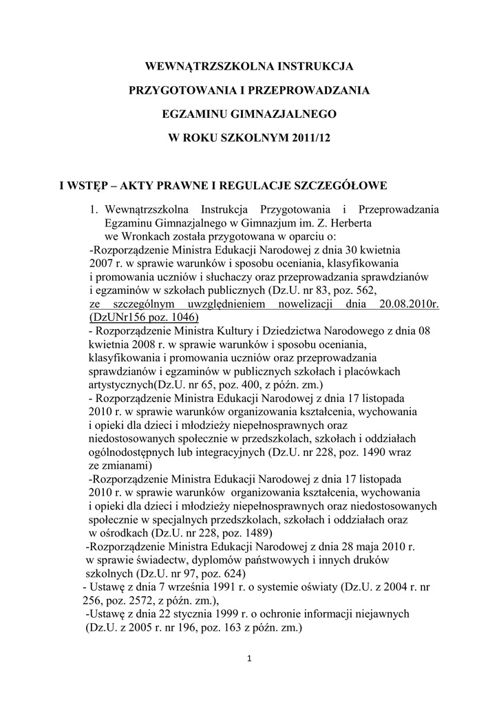 WEWNĄTRZSZKOLNA INSTRUKCJA PRZYGOTOWANIA I PRZEPROWADZANIA EGZAMINU GIMNAZJALNEGO W ROKU SZKOLNYM 2011/12 I WSTĘP – AKTY PRAWNE I REGULACJE SZCZEGÓŁOWE 1. Wewnątrzszkolna Instrukcja Przygotowania i Przeprowadzania Egzaminu Gimnazjalnego w Gimnazjum im. Z. Herberta we Wronkach została przygotowana w oparciu o: -Rozporządzenie Ministra Edukacji Narodowej z dnia 30 kwietnia 2007 r. w sprawie warunków i sposobu oceniania, klasyfikowania i promowania uczniów i słuchaczy oraz przeprowadzania sprawdzianów i egzaminów w szkołach publicznych (Dz.U. nr 83, poz. 562, ze szczególnym uwzględnieniem nowelizacji dnia 20.08.2010r. (DzUNr156 poz. 1046) - Rozporządzenie Ministra Kultury i Dziedzictwa Narodowego z dnia 08 kwietnia 2008 r. w sprawie warunków i sposobu oceniania, klasyfikowania i promowania uczniów oraz przeprowadzania sprawdzianów i egzaminów w publicznych szkołach i placówkach artystycznych(Dz.U. nr 65, poz. 400, z późn. zm.) - Rozporządzenie Ministra Edukacji Narodowej z dnia 17 listopada 2010 r. w sprawie warunków organizowania kształcenia, wychowania i opieki dla dzieci i młodzieży niepełnosprawnych oraz niedostosowanych społecznie w przedszkolach, szkołach i oddziałach ogólnodostępnych lub integracyjnych (Dz.U. nr 228, poz. 1490 wraz ze zmianami) -Rozporządzenie Ministra Edukacji Narodowej z dnia 17 listopada 2010 r. w sprawie warunków organizowania kształcenia, wychowania i opieki dla dzieci i młodzieży niepełnosprawnych oraz niedostosowanych społecznie w specjalnych przedszkolach, szkołach i oddziałach oraz w ośrodkach (Dz.U. nr 228, poz. 1489) -Rozporządzenie Ministra Edukacji Narodowej z dnia 28 maja 2010 r. w sprawie świadectw, dyplomów państwowych i innych druków szkolnych (Dz.U. nr 97, poz. 624) - Ustawę z dnia 7 września 1991 r. o systemie oświaty (Dz.U. z 2004 r. nr 256, poz. 2572, z późn. zm.), -Ustawę z dnia 22 stycznia 1999 r. o ochronie informacji niejawnych (Dz.U. z 2005 r. nr 196, poz. 163 z późn. zm.) 1 -Ustawę z dnia 14 lipca 1983 r. o narodowym zasobie archiwalnym i archiwach (Dz.U. z 2006 r. nr 97, poz. 673, z późn. zm.) -ustawę z dnia 29 sierpnia 1997 r. o ochronie danych osobowych (Dz.U. z 2002 r. nr 101, poz. 926, z późn. zm.) - Informator o egzaminie gimnazjalnym od roku szkolnego 2011/2012, opublikowanym na stronie internetowej Centralnej Komisji Egzaminacyjnej - Komunikat dyrektora Centralnej Komisji Egzaminacyjnej z 31 sierpnia 2011 r. w sprawie sposobu dostosowania warunków i form przeprowadzania w roku szkolnym 2011/2012 sprawdzianu i egzaminu gimnazjalnego do potrzeb uczniów (słuchaczy) ze specjalnymi potrzebami edukacyjnymi, w tym niepełnosprawnych, niedostosowanych społecznie oraz zagrożonych niedostosowaniem społecznym, opublikowanym na stronie internetowej Centralnej Komisji Egzaminacyjnej. 2. Treść instrukcji zostaje przekazana do wiadomości: a. Radzie Pedagogicznej, członkom Zespołów Nadzorujących, na miesiąc przed próbą oraz nie później niż na miesiąc przed właściwym egzaminem gimnazjalnym. b. Rodzicom uczniów klas trzecich zdających egzamin gimnazjalny na miesiąc przed próbnym egzaminem oraz na miesiąc przed właściwym egzaminem gimnazjalnym c. Uczniom poprzez Przewodniczącego Szkolnego Zespołu Egzaminacyjnego na miesiąc przed próbnym egzaminem gimnazjalnym oraz na miesiąc przed właściwym egzaminem gimnazjalnym. 3. Tekst w/w Instrukcji jest dostępny w bibliotece szkolnej oraz na stronie internetowej szkoły. 4. W sprawach, których nie reguluje niniejsza Instrukcja, należy stosować się do przepisów zawartych w Rozporządzeniu Ministra Edukacji Narodowej z dnia 30 kwietnia 2007 r. w sprawie warunków i sposobu oceniania, klasyfikowania i promowania uczniów i słuchaczy oraz przeprowadzania sprawdzianów i egzaminów w szkołach publicznych (Dz.U. nr 83, poz. 562, ze zmianami) 5. W opracowaniu zastosowano następujące skróty: CKE – Centralna Komisja Egzaminacyjna OKE- Okręgowa Komisja Egzaminacyjna SZE – Szkolny Zespół Egzaminacyjny ZN – Zespół Nadzorujący 2 II . TERMINARZ REALIZACJI ZADAŃ L.p 1. 2. 3. 4. 5. 6. 7. ZADANIE Opracowanie kalendarza dotyczącego organizacji roku szkolnego z uwzględnieniem dni, w których odbywa się egzamin gimnazjalny Zapoznanie rodziców (prawnych opiekunów) ucznia z możliwymi dostosowaniami formy i warunków egzaminu do dysfunkcji ucznia Złożenie w szkole przez rodziców deklaracji o wyborze języka i poziomu egzaminu z tego języka Ustalenie którzy uczniowie przystępują obowiązkowo do egzaminu z języka obcego nowożytnego zadeklarowanego przez rodziców ucznia tylko na poziomie podstawowym, a którzy na poziomie podstawowym i rozszerzonym. Termin przedłożenia dyrektorowi szkoły przez rodziców opinii i orzeczeń poradni psychologicznopedagogicznej, w tym poradni specjalistycznej Określenie przez Radę pedagogiczną dostosowań formy i warunków egzaminu do dysfunkcji ucznia Termin złożenia przez rodzica dyrektorowi szkoły pisemnego oświadczenia o rezygnacji z prawa do zdawania egzaminu ODPOWIEDZIALNY TERMIN REALIZACJI Dyrektor szkoły sierpień Dyrektor szkoły do 15 września Dyrektor szkoły Do 20 września Dyrektor szkoły Do końca września Pedagog szkolny Do 15 października Rada pedagogiczna Do 15 października Dyrektor szkoły Do 15 października 3 8. 9. 10. 11. 12. 13. 14. gimnazjalnego w warunkach i formach dostosowanych do dysfunkcji ucznia Poinformowanie rodziców ucznia o obowiązku przystąpienia do części trzeciej egzaminu gimnazjalnego na poziomie określonym przez dyrektora szkoły Ustalenie listy uczniów korzystających z dostosowania warunków i formy egzaminu do ich indywidualnych potrzeb psychofizycznych i edukacyjnych Dostosowanie warunków przeprowadzania egzaminu do indywidualnych potrzeb i możliwości uczniów ze specjalnymi potrzebami edukacyjnymi spośród wskazanych w komunikacie dyrektora CKE Przygotowanie listy uczniów przystępujących do egzami