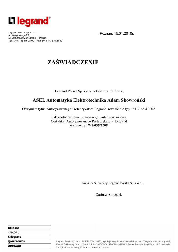 Legrand Polska Sp. z o.o. ul. Waryńskiego 20 57-200 Ząbkowice Śląskie – Polska Tel.: (+48 74) 816 23 00 – Fax: (+48 74) 815 21 49 Poznań, 15.01.2010r. ZAŚWIADCZENIE Legrand Polska Sp. z o.o. potwierdza, Ŝe firma: ASEL Automatyka Elektrotechnika Adam Skowroński Otrzymała tytuł Autoryzowanego Prefabrykatora Legrand rozdzielnic typu XL3 do 4 000A Jako potwierdzenie powyŜszego został wystawiony Certyfikat Autoryzowanego Prefabrykatora Legrand o numerze W1/035/3608 InŜynier SprzedaŜy Legrand Polska Sp. z o.o. Dariusz Smoczyk