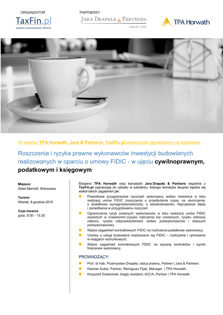 ORGANIZATOR PARTNERZY W imieniu TPA Horwath, Jara & Partners, TaxFin.pl serdecznie zapraszamy na szkolenie: Roszczenia i ryzyka prawne wykonawców inwestycji budowlanych realizowanych w oparciu o umowy FIDIC - w ujęciu cywilnoprawnym, podatkowym i księgowym Miejsce: Hotel Marriott, Warszawa Termin: Wtorek, 8 grudnia 2015 Czas trwania: godz. 9:30 – 15.30 Eksperci TPA Horwath oraz kancelarii Jara Drapała & Partners wspólnie z TaxFin.pl zapraszają do udziału w szkoleniu, którego tematyka skupiać będzie się wokół takich zagadnień jak: Prawidłowe przygotowanie roszczeń wykonawcy wobec inwestora w toku realizacji umów FIDIC (roszczenia o przedłużenie czasu na ukończenie; o dodatkowe wynagrodzenie/koszty; o odszkodowanie). Najczęstsze błędy i zaniedbania w przygotowaniu roszczeń. Ograniczanie ryzyk prawnych wykonawców w toku realizacji umów FIDIC zawartych w inwestorem (ryzyko naliczenia kar umownych, ryzyko odmowy odbioru; ryzyko odpowiedzialności wobec podwykonawców i dalszych podwykonawców). Wpływ zagadnień kontraktowych FIDIC na rozliczenia podatkowe wykonawcy. Umowy o usługi budowlane realizowane wg FIDIC – rozliczanie i ujmowanie w księgach rachunkowych. Wpływ zagadnień kontraktowych FIDIC na wycenę kontraktów i wyniki finansowe wykonawcy. PROWADZĄCY: Prof. dr hab. Przemysław Drapała; radca prawny, Partner | Jara & Partners Damian Kubiś, Partner; Remigiusz Fijak, Manager | TPA Horwath. Krzysztof Dziekoński, biegły rewident, ACCA, Partner | TPA Horwath. ORGANIZATOR PARTNERZY PRELEGENCI Prof. dr hab. Przemysław Drapała, radca prawny, wspólnik w kancelaria JARA DRAPALA & PARTNERS Sp.k. Posiada kilkunastoletnie doświadczenie w reprezentacji firm budowlanych (wykonawców) oraz inwestorów prywatnych w sporach sądowych i arbitrażowych dotyczących inwestycji budowlanych (w tym KIG, ICC, UNCITRAL), doktor habilitowany prawa cywilnego, profesor nadzwyczajny w Katedrze Prawa Cywilnego Akademii Leona Koźmińskiego w Warszawie, autor ponad 70 publikacji za zakresu prawa cywilnego, w tym licznych publikacji dotyczących umów o roboty budowlane, współautor tomu 5 i tomu 6 Systemu Prawa Prywatnego ( ostatnie wydania C.H.Beck, Warszawa 2013 r.), współautor wraz z Sędziami Izby Cywilnej Sądu Najwyższego komentarza do Kodeksu Cywilnego pod red. Jacka Gudowskiego (Lexis Nexis, 2013 r.), członek Zespołu Problemowego przy Komisji Kodyfikacyjnej Prawa Cywilnego ds. umów o świadczenie usług w nowym Kodeksie cywilnym (w tym umów o roboty budowlane), sędzia Sądu Polubownego przy Polsko – Niemieckiej Izbie Przemysłowo – Handlowej, Przewodniczący Komitetu Sądu Polubownego przy Okręgowej Izbie Radców Prawnych w Warszawie. Damian Kubiś, Doradca Podatkowy | Partner w TPA Horwath Damian Kubiś posiada duże doświadczenie doradcze, które zawdzięcza uczestnictwu w wielu kompleksowych projektach obejmujących następujące obszary: podatek dochodowy od osób prawnych, VAT, badania typu due diligence, projekty transfer pricing (ustalanie cen rynkowych, dokumentacja podatkowa).Po ukończeniu studiów rozwijał kompetencje pracując w firmie Arthur Andersen, w dziale doradztwa podatkowego, a następnie w Ernst & Young. Od 2004 r. związał się z TPA, gdzie obecnie pełni funkcję partnera w dziale Podatkowym. Uczestniczył w szeregu polskich oraz międzynarodowych specjalistycznych programach szkoleniowych, jak np.: International Tax School w Veldhoven, Holandia, International Taxation w Barcelonie lub International Reorganisations and Tax Planning w Londynie oraz szkolenia w dziedzinie transfer pricing w Amsterdamie. Jest autorem wielu specjalistycznych artykułów o tematyce podatkowej publikowanych na łamach polskiej oraz zagranicznej prasy. W 2000 roku Damian ukończył Wydział Prawa na Uniwersytecie Adama Mickiewicza w Poznaniu, kierunek Zarządzanie i Marketing o specjalizacji zarządzanie finansami. W 1999 roku, studiował także na Uniwersytecie w Kaiserslautern, Niemcy. Jest doradcą podatkowym od 2004 roku. Krzysztof Dziekoński, biegły rewident, ACCA, Partner w TPA Horwath Krzysztof specjalizuje się w obsłudze dużych i średnich giełdowych i prywatnych grup kapitałowych (krajowych i międzynarodowych) raportujących zgodnie z MSSF lub polskimi standardami rachunkowości, w projektach IPO (prospekty emisyjne, przekształcenia sprawozdań finansowych na MSSF, konsolidacje), jak również doradztwie i rachunkowej obsłudze przy połączeniach i przekształceniach przedsiębiorstw.vW 1998 roku Krzysztof rozpoczął pracę w firmie audytorskiej Arthur Andersen w dziale audytu i doradztwa gospodarczego, którą kontynuował do 2004 roku już w Ernst & Young, kierując jako senior wieloma projektami z obszaru audytu, AUP oraz due dilligence. Tutaj również w 2003 roku uzyskał tytuł biegłego rewidenta oraz uprawnienia ACCA. W latach 20042006 pracował jako Head of Accounting & Reporting w firmie farmaceutycznej Novartis Polska, gdzie odpowiadał za raportowanie, księgowość, podatki oraz kontrolę wewnętrzną. Następnie w latach 2006-2011 jako partner kierował licznymi projektami obejmującymi badania i przeglądy sprawozdań finansowych, projekty IPO oraz przeglądy typu due dilligence w firmie audytorskiej BDO Polska. Krzysztof jest absolwentem Szkoły Głównej Handlowej w Warszawie (SGH) oraz stypendystą fundacji Batorego na Uniwersytecie Giessen w Niemczech. ORGANIZATOR PARTNERZY Program: 9:30 - 10:00 Rejestracja i przywitanie 10:00 - 11:30 Część I – Zagadnienia cywilnoprawne 11:30 - 11:45 Przerwa na kawę 11:45 - 13:00 Część II – Zagadnienia podatkowe 13:00 - 13:45 Lunch 13:45 - 15:15 Część III – Zagadnienia księgowe Prawidłowe przygotowanie, zgłaszanie i udowadnianie przez wykonawcę roszczeń o przedłużenie czasu na ukończenie Prawidłowe przygotowanie, zgłaszanie i udowadnianie przez wykonawcę roszczeń o koszty dodatkowe/dodatkowe wynagrodzenie Klauzule kar umownych. Dopuszczalność kumul