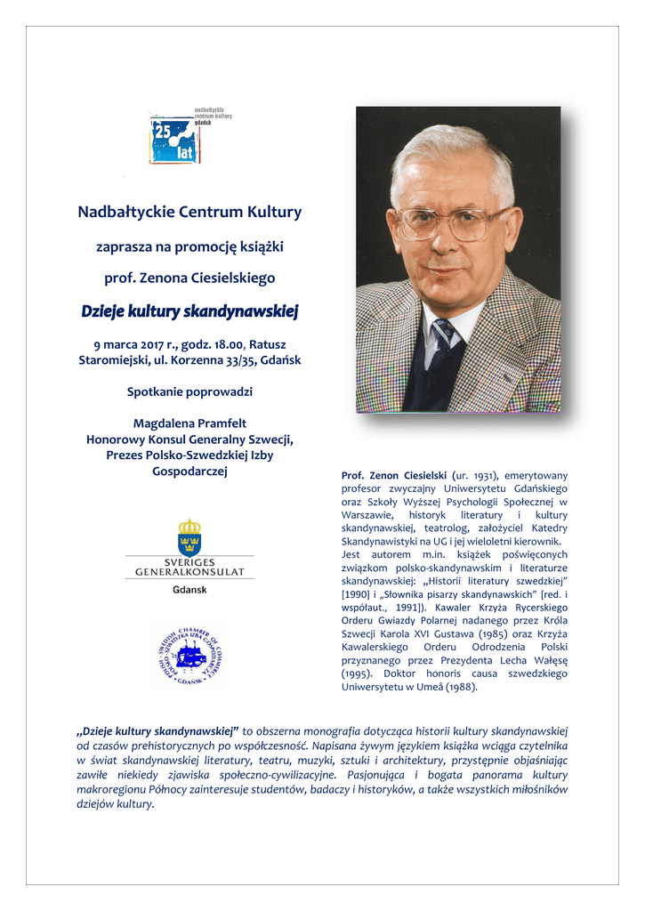 Nadbałtyckie Centrum Kultury zaprasza na promocję książki prof. Zenona Ciesielskiego 9 marca 2017 r., godz. 18.00, Ratusz Staromiejski, ul. Korzenna 33/35, Gdańsk Spotkanie poprowadzi Magdalena Pramfelt Honorowy Konsul Generalny Szwecji, Prezes Polsko-Szwedzkiej Izby Gospodarczej Prof. Zenon Ciesielski (ur. 1931), emerytowany profesor zwyczajny Uniwersytetu Gdańskiego oraz Szkoły Wyższej Psychologii Społecznej w Warszawie, historyk literatury i kultury skandynawskiej, teatrolog, założyciel Katedry Skandynawistyki na UG i jej wieloletni kierownik. Jest autorem m.in. książek poświęconych związkom polsko-skandynawskim i literaturze skandynawskiej: „Historii literatury szwedzkiej” [1990] i „Słownika pisarzy skandynawskich” [red. i współaut., 1991]). Kawaler Krzyża Rycerskiego Orderu Gwiazdy Polarnej nadanego przez Króla Szwecji Karola XVI Gustawa (1985) oraz Krzyża Kawalerskiego Orderu Odrodzenia Polski przyznanego przez Prezydenta Lecha Wałęsę (1995). Doktor honoris causa szwedzkiego Uniwersytetu w Umeå (1988). „Dzieje kultury skandynawskiej” to obszerna monografia dotycząca historii kultury skandynawskiej od czasów prehistorycznych po współczesność. Napisana żywym językiem książka wciąga czytelnika w świat skandynawskiej literatury, teatru, muzyki, sztuki i architektury, przystępnie objaśniając zawiłe niekiedy zjawiska społeczno-cywilizacyjne. Pasjonująca i bogata panorama kultury makroregionu Północy zainteresuje studentów, badaczy i historyków, a także wszystkich miłośników dziejów kultury. Pojęcie kultury zostało potraktowane w tym opracowaniu według koncepcji antropologicznej i obejmuje takie dziedziny, jak kultura artystyczna, umysłowa, społeczno-polityczna, mitologicznoreligijna i techniczno-cywilizacyjna. Pojęcie Skandynawii obejmuje współczesne państwa, jak Szwecja, Norwegia, Dania, Islandia i Finlandia, a także peryferia tego makroregionu, m.in. Grenlandię, Wyspy Owcze i Laponię. Tom I opisuje czasy prehistoryczne, działalność wikingów, wpływ chrześcijaństwa rzymskiego i protestanckiego na rozwój kultury Północy, znaczenie okresu XVI-wiecznej mocarstwowości aż po wpływ idei oświeceniowych w Skandynawii. W tomie II ukazano bogaty okres romantyzmu skandynawskiego, kształtowanie się nowożytnej kultury na Północy w wieku XIX aż po wielostronny rozwój kultury w XX wieku. [na podstawie materiałów Wydawcy]