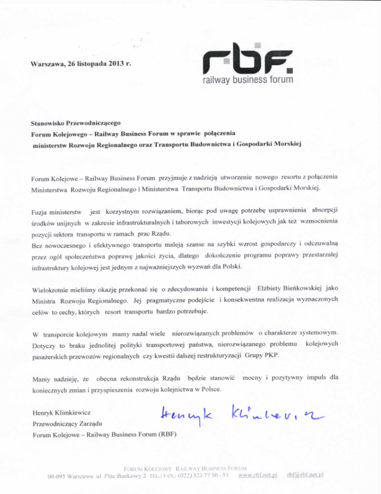 rbF. Warszawa, 26 listopada 2013 r. railway business forum Stammisko Pr/ewodnic/acego Forum Kolejowcgo - Railway Business Forum w sprawie polijc/enia ministerstw Rozwoju Regionalnego oraz Transportu Buduwnictwa i Gospodarki Morskicj Forum Kolejowe - Railway Business Forum przyjmuje z nadziejq utworzenie nowego resortu z polaczenia Ministerstwa Rozwoju Regionalnego i Ministerstwa Transportu Budownictwa i Gospodarki Morskiej. Fuzja ministerstw jest korzystnym rozwiazaniem, biorac pod uwage potrzebe usprawnienia absorpcji s'rodkow unijnych w zakresie infrastrukturalnych i taborowych inwestycji kolejowych jak tez wzmocnienia pozycji sektora transportu w ramach prac Rzadu. Bez nowoczesnego i efektywnego transportu maleja szanse na szybki wzrost gospodarczy i odczuwaln^ przez ogol spoleczeristwa popraw^ jakos'ci zycia, dlatego dokoriczenie programu poprawy przestar/alej infrastruktury kolejowej jest jednym z najwazniejszych wyzwari dla Polski. Wielokrotnie mielismy okazje przekonac sie o zdecydowaniu i kompetencji Elzbiety Bierikowskiej jako Ministra Rozwoju Regionalnego. Jej pragmatyczne podejscie i konsekwentna realizacja wyznaczonych celow to cechy, ktorych resort transportu bardzo potrzebuje. W transporcie kolejowym mamy nadal wiele nierozwiqzanych problemow o charakterze systemowym. Dotyczy to braku jednolitej polityki transportowej paristwa, nierozwiazanego problcmu kolejowych pasazerskich przewozow regionalnych czy kwestii dalszej restrukturyzacji Grupy PKP. Mamy nadzieje, ze obecna rekonstrukcja Rzadu bedzie stanowic mocny i pozytywny impuls dla koniecznych zmian i przyspieszenia rozwoju kolejnictwa w Polsce. Henryk Klimkiewicz ,.^_ Przewodniczacy Zarzadu Forum Kolejowe - Railway Business Forum (RBF) I OKI M K t i l I ; i A \ R VII ft A Y i i l MM SS I'ORl M OIMW5 WaJvauii u l . IMai; Bankm\ [ | i . i \\.; (022)323 77 5 0 - 5 1