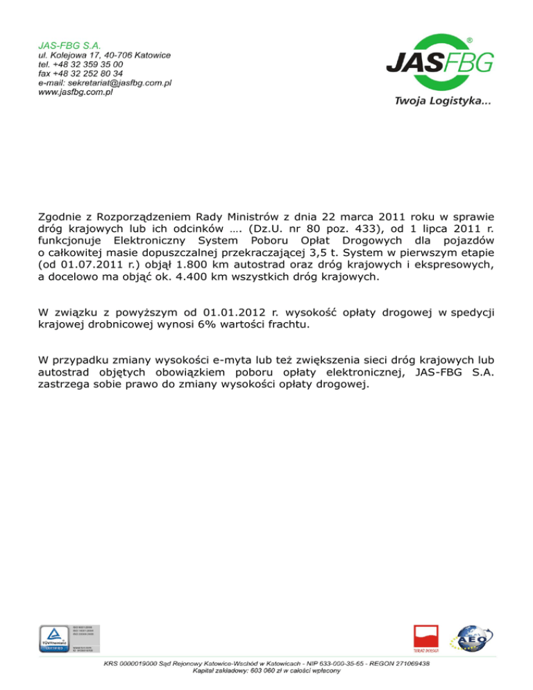 Zgodnie z Rozporządzeniem Rady Ministrów z dnia 22 marca 2011 roku w sprawie dróg krajowych lub ich odcinków …. (Dz.U. nr 80 poz. 433), od 1 lipca 2011 r. funkcjonuje Elektroniczny System Poboru Opłat Drogowych dla pojazdów o całkowitej masie dopuszczalnej przekraczającej 3,5 t. System w pierwszym etapie (od 01.07.2011 r.) objął 1.800 km autostrad oraz dróg krajowych i ekspresowych, a docelowo ma objąć ok. 4.400 km wszystkich dróg krajowych. W związku z powyższym od 01.01.2012 r. wysokość opłaty drogowej w spedycji krajowej drobnicowej wynosi 6% wartości frachtu. W przypadku zmiany wysokości e-myta lub też zwiększenia sieci dróg krajowych lub autostrad objętych obowiązkiem poboru opłaty elektronicznej, JAS-FBG S.A. zastrzega sobie prawo do zmiany wysokości opłaty drogowej.