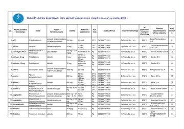 Z YC JC BÓ H URZ ĄD R EJ Lp. Wykaz Produktów Leczniczych, które uzyskały pozwolenie na import równoległy w grudniu 2012 r. O ODUKTÓ JI PR W AC LE TR C ES O H I PR DUKTÓ W YC BI ZN C Y Y ROBÓW CH W ME ZY IC D ZN Nazwa produktu leczniczego Skład Postać farmaceutyczna Dawka Wielkość opakowania Kat. dost. Kod EAN.UCC Importer równoległy Nr pozwolenia na import równoległy Podmiot odpowiedzialny w kraju eksportu Kraj eksport u 1 ACC Acetylcysteinum proszek do sporządzania 200 mg roztworu doustnego 20 sasz. OTC 5909997219783 Delfarma Sp. z o.o. 882/12 Bexal Farmacéutica, S.A. 2 Aescin Escinum tabletki dojelitowe 30 tabl. 90 tabl. OTC OTC 5909997218649 5909997218656 Delfarma Sp. z o.o. 929/12 Teva Pharmaceuticals CR, s.r.o. CZ 3 Aknemycin Plus Erythromycinum + Tretinoinum płyn na skórę Rp 5909997218274 InPharm Sp. z o.o. 893/12 Almirall Hermal GmbH CZ 4 Amlopin 5 mg Amlodipinum tabletki Rp Rp 5909997218120 5909997218113 InPharm Sp. z o.o. 854/12 Sandoz B.V. NL 5 Amlopin 10 mg Amlodipinum tabletki Rp Rp 5909997218106 5909997218090 InPharm Sp. z o.o. 855/12 Sandoz B.V. NL 6 Arthryl Glucosamini sulfas proszek do sporządzania 1500 mg roztworu doustnego 20 sasz. Rp 5909997218816 Forfarm Sp. z o.o. 865/12 Rottapharma S.p.A. H 7 Aspirin Acidum acetylsalicylicum tabletki 500 mg Bayer S.R.L. RO tabletki 500 mg 5909997217499 5909997217505 5909997217512 5909997217611 5909997217628 5909997217635 812/12 Acidum acetylsalicylicum OTC OTC OTC OTC OTC OTC Delfarma Sp. z o.o. 8 Aspirin 10 tabl. 20 tabl. 100 tabl. 10 tabl. 20 tabl. 100 tabl. Delfarma Sp. z o.o. 835/12 Bayer s.r.o. CZ 9 Aspirin C Acidum acetylsalicylicum + Acidum ascorbicum tabletki musujące 400 mg + 240 10 sasz. mg 20 sasz. OTC OTC 5909997220093 5909997220109 InPharm Sp. z o.o. 925/12 Bayer Austria GmbH A Amoxicillinum + Acidum clavulanicum proszek do sporządzania (400 mg + 57 70 ml zawiesiny doustnej mg)/ 5 ml 140 ml Rp Rp 5909997220079 5909997220086 Delfarma Sp. z o.o. 910/12 GlaxoSmithKline Pharma GmbH A 500 mg + 125 14 tabl. mg 21 tabl. 800 mg + 160 10 tabl. mg Rp Rp 5909997219684 5909997219691 Delfarma Sp. z o.o. 838/12 Beecham Group Plc RO GR 10 Augmentin 11 Augmentin 12 Bactrim Forte 13 Batrafen 14 Betadine Amoxicillinum + Acidum clavulanicum Sulfamethoxazolum + Trimethoprimum tabletki powlekane tabletki Ciclopiroxum olaminum krem Povidonum iodinatum globulki 20 mg (10 mg + 0,25 1 butelka 25 ml mg)/g 30 tabl. w 5 mg pojemniku 30 tabl. 30 tabl. w 10 mg pojemniku 30 tabl. 10 mg/g 200 mg 1 tuba 20 g 14 szt. E Rp 5909997218359 Delfarma Sp. z o.o. 913/12 ROCHE (HELLAS) A.E. (S.A.) Rp 5909997219929 Avrentim Sp. z o.o. 920/12 Sanofi-Aventis s.r.o. CZ 902/12 EGIS GYÓGYSZERGYÁR NYRT H Rp 5909997219172 InPharm Sp. z o.o. 15 Betadine Povidonum iodinatum maść 100 mg/g 1 tuba 20 g OTC 5909997220055 ICHEM Sp. z o.o. 915/12 16 Betadine Povidonum iodinatum roztwór na skórę 100 mg/ml 1 butelka 30 ml OTC 5909997218366 InPharm Sp. z o.o. 927/12 EGIS Pharmaceuticals PLC LAVIPHARM A.E. 17 Beto 50 ZK Metoprololi succinas tabletki o przedłużonym 47,5 mg uwalnianiu 30 tabl. 60 tabl. Rp Rp 5909997218762 5909997218779 InPharm Sp. z o.o. 852/12 HEXAL AG D 18 Beto 50 ZK Metoprololi succinas tabletki o przedłużonym 47,5 mg uwalnianiu 28 tabl. 56 tabl. Rp Rp 5909997218182 5909997218199 InPharm Sp. z o.o. 853/12 Sandoz B.V. NL Rp Rp Rp Rp OTC OTC OTC Rp 5909997217666 5909997217673 5909997217642 5909997217659 5909997217819 5909997217826 5909997217833 5909997219523 Avrentim Sp. z o.o. 845/12 OM PHARMA S.A. P Avrentim Sp. z o.o. 844/12 OM PHARMA S.A. P Delfarma Sp. z o.o. 811/12 Boehringer Ingelheim Limited IRL Delfarma Sp. z o.o. 814/12 Gedeon Richter Plc. BG Rp 5909997217932 Avrentim Sp. z o.o. 846/12 Richter Gedeon Nyrt. H Rp Rp Rp Rp Rp Rp Rp 5909997219509 5909997219769 5909997219776 5909997218724 5909997218731 5909997218946 5909997218953 Delfarma Sp. z o.o. 804/12 InPharm Sp. z o.o. 866/12 Gedeon Richter Plc. Gedeon Richter România S.A. ICHEM Sp. z o.o. 847/12 Janssen-Cilag Limited IRL Delfarma Sp. z o.o. 879/12 Janssen-Cilag Ltd IRL A Szczepionka wieloważna Szczepionka wieloważna 22 Cavinton Vinpocetinum roztwór do wstrzykiwań 5 mg/ml 10 kaps. 30 kaps. 10 kaps. 30 kaps. 10 tabl. 14 tabl. 20 tabl. 10 amp. 2 ml 23 Cavinton Vinpocetinum roztwór do wstrzykiwań 5 mg/ml 10 amp. 2 ml 24 Cavinton Vinpocetinum tabletki 5 mg 25 Cavinton Forte Vinpocetinum tabletki 19 Broncho-Vaxom 20 Broncho-Vaxom 21 Buscopan 26 Cilest 27 Cilest Hyoscini butylbromidum Norgestimatum + Ethinylestradiolum Norgestimatum + Ethinylestradiolum kapsułki twarde 3,5 mg kapsułki twarde 7 mg tabletki drażowane 10 mg tabletki tabletki 50 tabl. 30 tabl. 10 mg 90 tabl. 250 mcg + 35 21 tabl. mcg 63 tabl. 250 mcg + 35 21 tabl. mcg 63 tabl. RO 5909997219943 InPharm Sp. z o.o. 928/12 OTC OTC 5909997219004 5909997219011 Delfarma Sp. z o.o. 875/12 GlaxoSmithKline Consumer Healthcare Rp Rp Rp Rp 5909997219042 5909997219059 5909997219066 5909997219721 Delfarma Sp. z o.o. 883/12 Merck KGaA E Delfarma Sp. z o.o. 840/12 Dr. Gerhard Mann D 919/12 Pfizer Hellas A.E. GR 903/12 Pfizer Holding France F 839/12 Pfizer, SA E Delfarma Sp. z o.o. 912/12 MERCK SHARP & DOHME A.F.B.E.E. D.T. MSD A.F.B.E.E. 5909997218250 Hand-Prod Sp. z o.o. 842/12 MSD France 5909997219073 Forfarm Sp. z o.o. 890/12 EGIS Pharmaceuticals PLC krople do oczu, roztwór Coldrex o smaku 29 cytrynowym Paracetamolum + Phenylephrini hydrochloridum + Acidum ascorbicum (750 mg + 10 5 sasz. proszek do sporządzania mg + 60 10 sasz. roztworu doustnego mg)/5 g 30 Concor Cor 5 Bisoprololi fumaras tabletki powlekane 5 mg 31 Corneregel Dexpanthenolum żel do oczu 50 mg/g 32 Dalacin T Clindamycinum żel 10 mg/g 1 tuba 30 g Rp 5909997219912 Avrentim Sp. z o.o. 33 Debridat Trimebutini maleas Medroxyprogesteroni acetas tabletki powlekane zawiesina do wstrzykiwań 100 mg 30 tabl. 1 fiol. 1 ml 10 fiol. 1 ml Rp Rp Rp 5909997218625 5909997219707 5909997219714 Avrentim Sp. z o.o. Delfarma Sp. z o.o. 35 Diprogenta Betamethasonum + 
