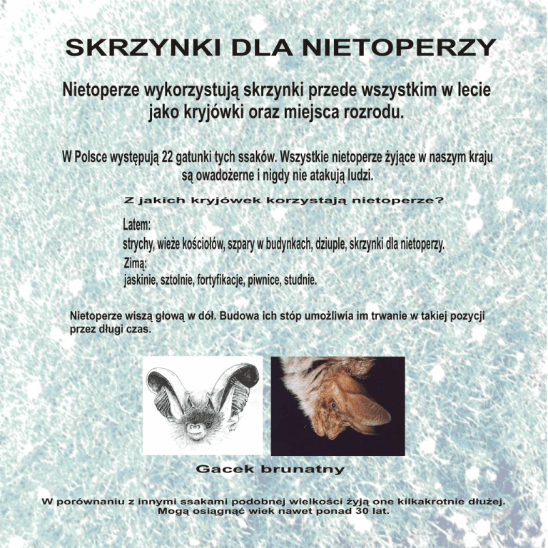 SKRZYNKI DLA NIETOPERZY Nietoperze wykorzystuj¹ skrzynki przede wszystkim w lecie jako kryjówki oraz miejsca rozrodu. W Polsce wystêpuj¹ 22 gatunki tych ssaków. Wszystkie nietoperze ¿yj¹ce w naszym kraju s¹ owado¿erne i nigdy nie atakuj¹ ludzi. Z jakich kryjówek korzystaj¹ nietoperze? Latem: strychy, wie¿e koœcio³ów, szpary w budynkach, dziuple, skrzynki dla nietoperzy. Zim¹: jaskinie, sztolnie, fortyfikacje, piwnice, studnie. Nietoperze wisz¹ g³ow¹ w dó³. Budowa ich stóp umo¿liwia im trwanie w takiej pozycji przez d³ugi czas. Gacek brunatny W porównaniu z innymi ssakami podobnej wielkoœci ¿yj¹ one kilkakrotnie d³u¿ej. Mog¹ osi¹gn¹æ wiek nawet ponad 30 lat.