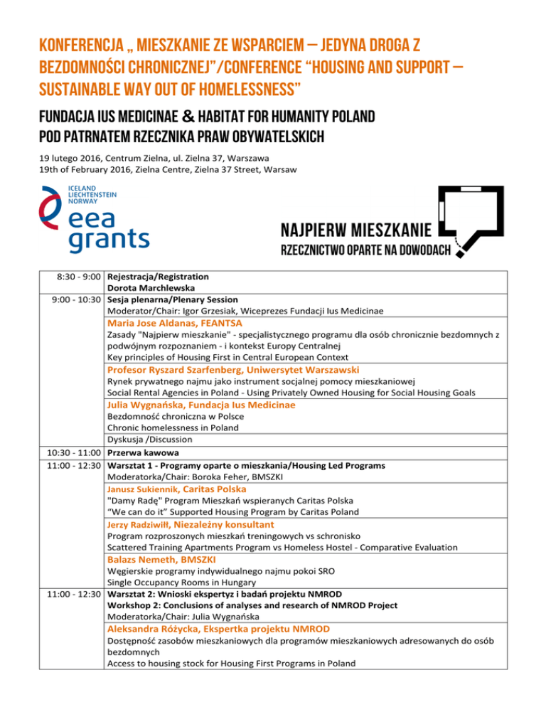 Konferencja „ mieszkanie ze wsparciem – jedyna droga z bezdomności chronicznej”/Conference “housing and support – sustainable way out of homelessness” Fundacja Ius Medicinae & habitat for humanity Poland Pod patrnatem rzecznika praw obywatelskich 19 lutego 2016, Centrum Zielna, ul. Zielna 37, Warszawa 19th of February 2016, Zielna Centre, Zielna 37 Street, Warsaw 8:30 - 9:00 Rejestracja/Registration Dorota Marchlewska 9:00 - 10:30 Sesja plenarna/Plenary Session Moderator/Chair: Igor Grzesiak, Wiceprezes Fundacji Ius Medicinae Maria Jose Aldanas, FEANTSA Zasady "Najpierw mieszkanie" - specjalistycznego programu dla osób chronicznie bezdomnych z podwójnym rozpoznaniem - i kontekst Europy Centralnej Key principles of Housing First in Central European Context Profesor Ryszard Szarfenberg, Uniwersytet Warszawski Rynek prywatnego najmu jako instrument socjalnej pomocy mieszkaniowej Social Rental Agencies in Poland - Using Privately Owned Housing for Social Housing Goals Julia Wygnańska, Fundacja Ius Medicinae Bezdomność chroniczna w Polsce Chronic homelessness in Poland Dyskusja /Discussion 10:30 - 11:00 Przerwa kawowa 11:00 - 12:30 Warsztat 1 - Programy oparte o mieszkania/Housing Led Programs Moderatorka/Chair: Boroka Feher, BMSZKI Janusz Sukiennik, Caritas Polska "Damy Radę" Program Mieszkań wspieranych Caritas Polska “We can do it” Supported Housing Program by Caritas Poland Jerzy Radziwiłł, Niezależny konsultant Program rozproszonych mieszkań treningowych vs schronisko Scattered Training Apartments Program vs Homeless Hostel - Comparative Evaluation Balazs Nemeth, BMSZKI Węgierskie programy indywidualnego najmu pokoi SRO Single Occupancy Rooms in Hungary 11:00 - 12:30 Warsztat 2: Wnioski ekspertyz i badań projektu NMROD Workshop 2: Conclusions of analyses and research of NMROD Project Moderatorka/Chair: Julia Wygnańska Aleksandra Różycka, Ekspertka projektu NMROD Dostępność zasobów mieszkaniowych dla programów mieszkaniowych adresowanych do osób bezdomnych Access to housing stock for Housing First Programs in Poland Katarzyna Lech, Ekspertka projektu NMROD Wsparcie dla osób chronicznie bezdomnych z doświadczeniem choroby psychicznej według zasad „Najpierw mieszkanie” w ramach polskiego systemu psychiatrii środowiskowej Specialist Support for Potential Housing First Clients in Poland - Feasibility Study Sylwia Gregorczyk Abram, Marcin Bejm, Clifford Chance Koszty wymiaru sprawiedliwości w badaniu ścieżki instytucjonalnej osób chronicznie bezdomnych The costs of lawsuits in case studies of institutional pathways of chronically homeless people 12:30 - 12:40 Przerwa techniczna - rearanżacja sali/Technical break 12:40 - 14:10 Sesja plenarna – wnioski dla polityki społecznej wobec bezdomności Plenary Session – Conclusions for Homelessness Policy in Poland Moderatorka/Chair: Julia Wygnańska Kamilla Dołowska, Rzecznik Praw Obywatelskich Wprowadzenie przedstawicielki Rzecznika Praw Obywatelskich Introduction from the Representative of the Commissioner for Human Rights Adam Ploszka, Helsińska Fundacja Praw Człowieka Bezdomność a prawa człowieka Homelessness and Human Rights Przedstawiciel Ministerstwa Rodziny, Pracy i Polityki Społecznej Komentarz Comment from the representative of the Polish Ministry of Family, Labor and Social Policy Przedstawiciel Miasta Stołecznego Warszawa Komentarz Comment from the representative of The Municipality of Warsaw Dyskusja/Discussion 14:10 - 15:00 Lunch i prezentacja ścieżek instytucjonalnych osób chronicznie bezdomnych (dla chętnych) Lunch and presentation of institutional pathways of chronically homeless people Konferencja oraz projekt “Najpierw mieszkanie – rzecznictwo oparte na dowodach” jest realizowany dzięki dofinansowaniu Programu Obywatele dla Demokracji ze środków Europejskiego Obszaru Gospodarczego EOG. Wykonawcy, partnerzy, sponsorzy oraz patron projektu: The Conference and „Housing First – Evidence based Advocacy” Project is cofinanced within the Citizens for Democracy Program from EEA Grants. Among funders, performers, partners and helpers are:
