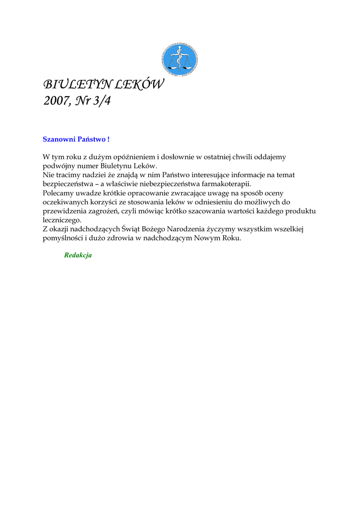 BIULETYN LEKÓW 2007, Nr 3/4 Szanowni Państwo ! W tym roku z dużym opóźnieniem i dosłownie w ostatniej chwili oddajemy podwójny numer Biuletynu Leków. Nie tracimy nadziei że znajdą w nim Państwo interesujące informacje na temat bezpieczeństwa – a właściwie niebezpieczeństwa farmakoterapii. Polecamy uwadze krótkie opracowanie zwracające uwagę na sposób oceny oczekiwanych korzyści ze stosowania leków w odniesieniu do możliwych do przewidzenia zagrożeń, czyli mówiąc krótko szacowania wartości każdego produktu leczniczego. Z okazji nadchodzących Świąt Bożego Narodzenia życzymy wszystkim wszelkiej pomyślności i dużo zdrowia w nadchodzącym Nowym Roku. Redakcja Spis treści: Ocena stosunku korzyści do ryzyka stosowania produktu leczniczego.................. 3 Informacje różne................................................................................................................8 Biuletyn Leków, 2007, nr 3/4 2 OCENA STOSUNKU KORZYŚCI DO RYZYKA STOSOWANIA PRODUKTU LECZNICZEGO Anna Arcab z Wydziału Monitorowania Niepożądanych Działań Produktów Leczniczych Ocena stosunku korzyści do ryzyka jest powszechnie stosowanym narzędziem, które ma pomóc w podjęciu decyzji o tym, czy lek można dopuścić do obrotu, a w okresie porejestracyjnym - czy w określonych warunkach stosowania preparat może nadal pozostawać w lecznictwie. Czym więc jest taka ocena, jak jej dokonywać, czy istnieją specjalne algorytmy, tak jak przy ocenie związku przyczynowo-skutkowego, kto takiej analizy powinien się podjąć? Definicja stosunku korzyści do ryzyka znalazła się również w polskiej ustawie Prawo farmaceutyczne. W artykule 2, w punkcie 37 b) czytamy: „stosunkiem korzyści do ryzyka - jest ocena pozytywnych skutków terapeutycznych produktu leczniczego w odniesieniu do ryzyka związanego z użyciem produktu leczniczego, z wyłączeniem zagrożenia niepożądanym wpływem na środowisko <…>”. Z oceny stosunku korzyści do ryzyka może wynikać konieczność podjęcia konkretnych działań, zmierzających do poprawy bezpieczeństwa stosowania leku. Jeżeli bilans korzyści do ryzyka zmienia się w jakikolwiek sposób, to zazwyczaj stanowi to podstawę do przekazania takiej informacji w szczególny sposób fachowym pracownikom opieki zdrowotnej, a w uzasadnionych przypadkach również pacjentom. Jedną z możliwości przekazania takiej informacji mogą być komunikaty, kierowane bezpośrednio do lekarzy i farmaceutów lub stosowne materiały informacyjne dla pacjentów. Wyraźnie kształtuje się więc konieczność dokonania oceny stosunku korzyści do ryzyka przy wprowadzaniu leku do terapii, a potem prowadzenie tej oceny na bieżąco. Wydanie pozwolenia na dopuszczenie leku do obrotu jest jednoznaczne z tym, ze dokonana ocena stosunku korzyści dla stosowania tego leku zgodnie z zaleceniami, zawartymi w charakterystyce produktu leczniczego oraz w planie zarządzania ryzykiem (jeśli dotyczy) dała pozytywny rezultat. Ważne jest aby pamiętać, że ocena ta musi być dokonywana osobno dla każdego zatwierdzonego wskazania i oddzielnie dla każdej grupy pacjentów. Istnieją dwa główne sposoby oceny stosunku korzyści do ryzyka. Pierwsza metoda oparta jest na analizie ilościowej. Zakłada ona wyznaczenie konkretnej wartości liczbowej, która odpowiadać będzie bilansowi korzyści do ryzyka. Drugim sposobem oceny jest metoda „jakościowa”, czyli przygotowanie opinii eksperckiej, przeprowadzonej przez jednego lub więcej specjalistów. Taka naukowa ocena farmakologiczna powinna uwzględniać wszystkie zauważone czynniki, mające wpływ zarówno na korzyść jak i na ryzyko stosowania leku. W ostatnim okresie zaproponowano nową metodę oceny ilościowej. Została ona niedawno opracowana przez zespół naukowców z firm farmaceutycznych przy Biuletyn Leków, 2007, nr 3/4 3 współudziale ekspertów z organów kontroli leków. Metoda została nazwana akronimem MCDA od pełnej nazwy angielskiej Multi Criteria Decision Analysis. Główne założenia proponowanej metody są następujące: - odniesienie do wielu różnych czynników, dotyczących korzyści i ryzyka - przygotowanie oceny na podstawie dowodów oraz przyjęcie założenia pewnego stopnia niepewności (zakłada się, że informacje brane pod uwagę – „dowody” – nie są pełne) - konfrontacja korzyści z ryzykiem (zakłada się zgodę na pewne ryzyko pod warunkiem konkretnej korzyści) - przyjęcie skali między 0 a 100 (wszystkie sumowane wartości cząstkowe dają wynik 100). Całościowa ocena stosunku korzyści do ryzyka według metody Multi Criteria Decision Analysis przebiega według 7 następujących po sobie kroków: 1. Określenie kontekstu (określenie wskazania, dawki w tym wskazaniu, przeciwwskazań) 2. Wybranie opcji, które będą oceniane (wybór leku i porównanie go do placebo lub do leku referencyjnego) 3. Wybór kryteriów korzyści i ryzyka oraz sposobu podziału czynników ryzyka i czynników odnoszących się do korzyści 4. Ocena wyników w każdej opcji względem wybranych kryteriów dla oceny korzyści i ryzyka (wybranie odpowiednich danych z badań oraz ustalenie skali cząstkowej) 5. Określenie wagi każdego z wyznaczonych wcześniej czynników 6. Wyliczenie odpowiednich wartości na każdym przyjętym poziomie i końcowej wartości liczbowej 7. Dokonanie analizy czułości metody Dotychczasowym uznanym standardem oceny stosunku korzyści do ryzyka jest jej przeprowadzenie metodą jakościową. Opiera się ona na wiedzy i doświadczeniu eksperta albo grona ekspertów. Ocena taka odnosi się do wszystkich korzyści i zagrożeń związanych ze stosowaniem leku, jednak każde wskazanie oceniane jest osobno. Ekspert dokonujący oceny może wyodrębnić podobne obszary zagadnień, wyznaczone dla korzyści i zagrożeń np. nasilenie, czas trwania i częstość występowania objawów. Eksperci z ośrodka WHO the Uppsala Monitoring Centre, którzy zajm