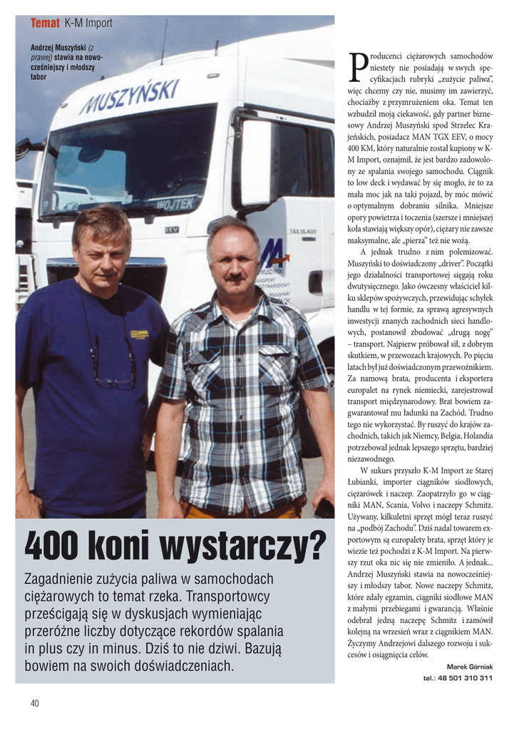 Temat K-M Import Andrzej Muszyński (z prawej) stawia na nowocześniejszy i młodszy tabor 400 koni wystarczy? Zagadnienie zużycia paliwa w samochodach ciężarowych to temat rzeka. Transportowcy prześcigają się w dyskusjach wymieniając przeróżne liczby dotyczące rekordów spalania in plus czy in minus. Dziś to nie dziwi. Bazują bowiem na swoich doświadczeniach. P roducenci ciężarowych samochodów niestety nie posiadają w swych specyfikacjach rubryki „zużycie paliwa”, więc chcemy czy nie, musimy im zawierzyć, chociażby z przymrużeniem oka. Temat ten wzbudził moją ciekawość, gdy partner biznesowy Andrzej Muszyński spod Strzelec Krajeńskich, posiadacz MAN TGX EEV, o mocy 400 KM, który naturalnie został kupiony w KM Import, oznajmił, że jest bardzo zadowolony ze spalania swojego samochodu. Ciągnik to low deck i wydawać by się mogło, że to za mała moc jak na taki pojazd, by móc mówić o optymalnym dobraniu silnika. Mniejsze opory powietrza i toczenia (szersze i mniejszej koła stawiają większy opór), ciężary nie zawsze maksymalne, ale „pierza” też nie wożą. A jednak trudno z nim polemizować. Muszyński to doświadczony „driver”. Początki jego działalności transportowej sięgają roku dwutysięcznego. Jako ówczesny właściciel kilku sklepów spożywczych, przewidując schyłek handlu w tej formie, za sprawą agresywnych inwestycji znanych zachodnich sieci handlowych, postanowił zbudować „drugą nogę” – transport. Najpierw próbował sił, z dobrym skutkiem, w przewozach krajowych. Po pięciu latach był już doświadczonym przewoźnikiem. Za namową brata, producenta i eksportera europalet na rynek niemiecki, zarejestrował transport międzynarodowy. Brat bowiem zagwarantował mu ładunki na Zachód. Trudno tego nie wykorzystać. By ruszyć do krajów zachodnich, takich jak Niemcy, Belgia, Holandia potrzebował jednak lepszego sprzętu, bardziej niezawodnego. W sukurs przyszło K-M Import ze Starej Łubianki, importer ciągników siodłowych, ciężarówek i naczep. Zaopatrzyło go w ciągniki MAN, Scania, Volvo i naczepy Schmitz. Używany, kilkuletni sprzęt mógł teraz ruszyć na „podbój Zachodu”. Dziś nadal towarem exportowym są europalety brata, sprzęt który je wiezie też pochodzi z K-M Import. Na pierwszy rzut oka nic się nie zmieniło. A jednak... Andrzej Muszyński stawia na nowocześniejszy i młodszy tabor. Nowe naczepy Schmitz, które zdały egzamin, ciągniki siodłowe MAN z małymi przebiegami i gwarancją. Właśnie odebrał jedną naczepę Schmitz i zamówił kolejną na wrzesień wraz z ciągnikiem MAN. Życzymy Andrzejowi dalszego rozwoju i sukcesów i osiągnięcia celów. Marek Górniak tel.: 48 501 310 311 40