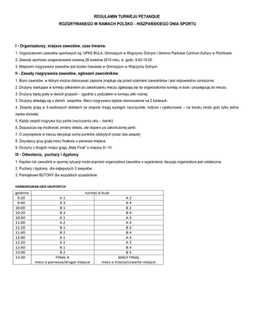 REGULAMIN TURNIEJU PETANQUE ROZGRYWANEGO W RAMACH POLSKO - HISZPAŃSKIEGO DNIA SPORTU I - Organizatorzy, miejsce zawodów, czas trwania. 1. Organizatorem zawodów sportowych są: UPKS BULA, Gimnazjum w Wiączyniu Dolnym i Gminno Parkowe Centrum Kultury w Plichtowie. 2. Zawody sportowe zorganizowane zostaną 26 kwietnia 2015 roku, w godz. 9.00-15.00. 3. Miejscem rozgrywania zawodów jest boisko trawiaste w Gimnazjum w Wiączyniu Dolnym. II - Zasady rozgrywania zawodów, zgłoszeń zawodników. 1. Biuro zawodów, w którym można dokonywać zapisów znajduje się przed szatniami zawodników i jest odpowiednio oznaczone. 2. Drużyny startujące w turnieju piłkarskim po zakończeniu meczu zgłaszają się do organizatorów turnieju w bule i przystępują do meczu. 3. Drużyny będą grały w dwóch grupach – zgodnie z podziałem w turnieju piłki nożnej 3. Drużyny składają się z dwóch zespołów. Mecz rozgrywany będzie równocześnie na 2 boiskach. 4. Zespoły grają w 3-osobowych składach (w zespole mogą wystąpić nauczyciele, rodzice i opiekunowie – na boisku może grać tylko jedna osoba dorosła) 5. Każdy zespół rozgrywa trzy partie (wyrzucenia celu – świnki) 6. Dopuszcza się możliwość zmiany składu, ale dopiero po zakończonej partii. 7. O zwycięstwie w meczu decyduje suma punktów zdobytych przez oba zespoły 8. Zwycięzcy grup grają mecz finałowy o pierwsze miejsce. 9. Drużyny z drugich miejsc grają „Mały Finał” o miejsce III / IV III - Odwołania, puchary i dyplomy 1. Kapitan lub zawodnik w spornej sytuacji może poprosić organizatora zawodów o wyjaśnienie; decyzja organizatora jest ostateczna. 2. Puchary i dyplomy dla najlepszych 3 zespołów 3. Pamiątkowe BUTONY dla wszystkich uczestników HARMONOGRAM GIER GRUPOWYCH godzina 9:20 9:40 10:00 10:20 10:40 11:00 11:20 11:40 12:00 12:20 12:40 13:00 13:30 turniej w bule A1 A2 A3 A4 B1 B2 B3 B4 A1 A3 A2 A4 B1 B3 B2 B4 A1 A4 A2 A3 B1 B4 B2 B3 FINAŁ A MAŁY FINAŁ mecz o pierwsze/drugie miejsce mecz o trzecie/czwarte miejsce