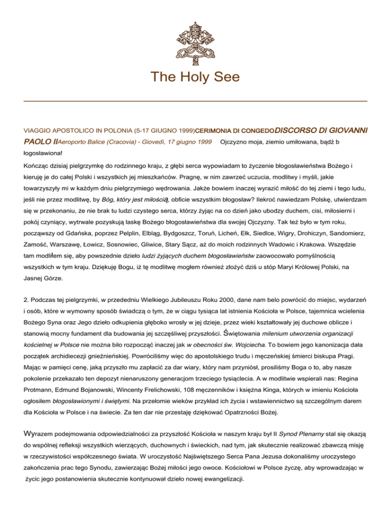 The Holy See VIAGGIO APOSTOLICO IN POLONIA (5-17 GIUGNO 1999)CERIMONIA DI CONGEDODISCORSO DI GIOVANNI PAOLO IIAeroporto Balice (Cracovia) - Giovedì, 17 giugno 1999 Ojczyzno moja, ziemio umiłowana, bądź b łogosławiona! Kończąc dzisiaj pielgrzymkę do rodzinnego kraju, z głębi serca wypowiadam to życzenie błogosławieństwa Bożego i kieruję je do całej Polski i wszystkich jej mieszkańców. Pragnę, w nim zawrzeć uczucia, modlitwy i myśli, jakie towarzyszyły mi w każdym dniu pielgrzymiego wędrowania. Jakże bowiem inaczej wyrazić miłość do tej ziemi i tego ludu, jeśli nie przez modlitwę, by Bóg, który jest miłością, obficie wszystkim błogosław? Ilekroć nawiedzam Polskę, utwierdzam się w przekonaniu, że nie brak tu ludzi czystego serca, którzy żyjąc na co dzień jako ubodzy duchem, cisi, miłosierni i pokój czyniący, wytrwale pozyskują laskę Bożego błogosławieństwa dla swojej Ojczyzny. Tak też było w tym roku, począwszy od Gdańska, poprzez Pelplin, Elbląg, Bydgoszcz, Toruń, Licheń, Ełk, Siedlce, Wigry, Drohiczyn, Sandomierz, Zamość, Warszawę, Łowicz, Sosnowiec, Gliwice, Stary Sącz, aż do moich rodzinnych Wadowic i Krakowa. Wszędzie tam modliłem się, aby powszednie dzieło ludzi żyjących duchem błogosławieństw zaowocowało pomyślnością wszystkich w tym kraju. Dziękuję Bogu, iż tę modlitwę mogłem również złożyć dziś u stóp Maryi Królowej Polski, na Jasnej Górze. 2. Podczas tej pielgrzymki, w przededniu Wielkiego Jubileuszu Roku 2000, dane nam belo powrócić do miejsc, wydarzeń i osób, które w wymowny sposób świadczą o tym, że w ciągu tysiąca lat istnienia Kościoła w Polsce, tajemnica wcielenia Bożego Syna oraz Jego dzieło odkupienia głęboko wrosły w jej dzieje, przez wieki kształtowały jej duchowe oblicze i stanowią mocny fundament dla budowania jej szczęśliwej przyszłości. Świętowania milenium utworzenia organizacji kościelnej w Polsce nie można biło rozpocząć inaczej jak w obecności św. Wojciecha. To bowiem jego kanonizacja dała początek archidiecezji gnieźnieńskiej. Powróciliśmy więc do apostolskiego trudu i męczeńskiej śmierci biskupa Pragi. Mając w pamięci cenę, jaką przyszło mu zapłacić za dar wiary, który nam przyniósł, prosiliśmy Boga o to, aby nasze pokolenie przekazało ten depozyt nienaruszony generacjom trzeciego tysiąclecia. A w modlitwie wspierali nas: Regina Protmann, Edmund Bojanowski, Wincenty Frelichowski, 108 męczenników i księżna Kinga, których w imieniu Kościoła ogłosiłem błogosławionymi i świętymi. Na przełomie wieków przykład ich życia i wstawiennictwo są szczególnym darem dla Kościoła w Polsce i na świecie. Za ten dar nie przestaję dziękować Opatrzności Bożej. Wyrazem podejmowania odpowiedzialności za przyszłość Kościoła w naszym kraju był II Synod Plenarny stal się okazją do wspólnej refleksji wszystkich wierzących, duchownych i świeckich, nad tym, jak skutecznie realizować zbawczą misję w rzeczywistości współczesnego świata. W uroczystość Najświętszego Serca Pana Jezusa dokonaliśmy uroczystego zakończenia prac tego Synodu, zawierzając Bożej miłości jego owoce. Kościołowi w Polsce życzę, aby wprowadzając w życic jego postanowienia skutecznie kontynuował dzieło nowej ewangelizacji. 2 3. Cieszę się, że podczas tej pielgrzymki mogłem spotkać się z pełniącymi władzę ustawodawczą wykonawczą i sądowniczą w naszym kraju. Przy tej niezwykłej sposobności wszyscy mogliśmy się przekonać, że dobro wspólne jest tą, wokół której ludzie mogą jednoczyć się w twórczej współpracy, mimo zwyczajnej w demokracji różnorodności przekonań i politycznej wizji. Panu Prezydentowi, obu izbom parlamentu, rządowi Rzeczypospolitej oraz trybunałom na wszystkich szczeblach życzę, aby - mając przed oczyma dobro Ojczyzny i narodu - wytrwale służyli swoim rodakom i mogli cieszyć się owocarni tej służby. Wędrując po różnych zakątkach kraju mogłem dostrzec, że rozwija się on pod każdym względem. Wiem, że jest to efekt wysiłku całej społeczności, okupionego nieraz wieloma wyrzeczeniami i ofiarami. Wszystkim, którzy z miłością budują, pomyślną przyszłość Ojczyzny, pragnę dziś wyrazić moje szczere uznanie i podziękowanie. Równocześnie zdajemy sobie sprawę, iż na drodze tego rozwoju nie brak przeszkód, problemów i zagrożeń. Pragnę raz jeszcze dać wyraz mej nadziei, że z Bożą pomocą i przy zgodnej współpracy wszystkich wszelkie trudności zostaną pokonane. O to proszę Pana Boga, myśląc nade wszystko o wartościach duchowych, jakie minione pokolenia wiernie przechowały i których nie można zatracić pośród słusznych trosk o materialną pomyślność kraju. Jako Papież, a zarazem syn tego narodu zwracam się do wszystkich ludzi. dobrej woli, a w sposób szczególny do moich braci w wierze, z gorącym wezwaniem, aby dokładali wszelkich starań, by, Polska wchodziła w trzecie tysiąclecie nie udko jako państwo stabilne politycznie i gospodarczo zasobne, ale również umocnione duchem miłości wzajemnej społecznej. 4. Oddając chwalę Bogu za dar tej wizyty, pragnę również podziękować wszystkim, dzięki którym mogła on dojść do sutku. Na ręce Pana Prezydenta Rzeczypospolitej składam podziękowanie władzom państwowym za zaproszenie oraz za wszelki trud poniesiony w związku z przygotowaniem i pomyślną realizacją pielgrzymki. Dziękuję za wszelkie oznaki życzliwości. Słowa podziękowania należą się władzom regionalnym i samorządowym, które nie szczędziły wysiłków i środków, aby spotkania wiernych z Papieżem odbywali się w pięknym otoczeniu i w atmosferze pokoju i radości. Bóg zapłać za gościnę! Il Papa così risponde ai presenti che gridano « Resta con noi »: « Zostań z nami ». Serdecznie dziękuję Wojsku Polskiemu, policji, strażakom, innym służbom porządkowy