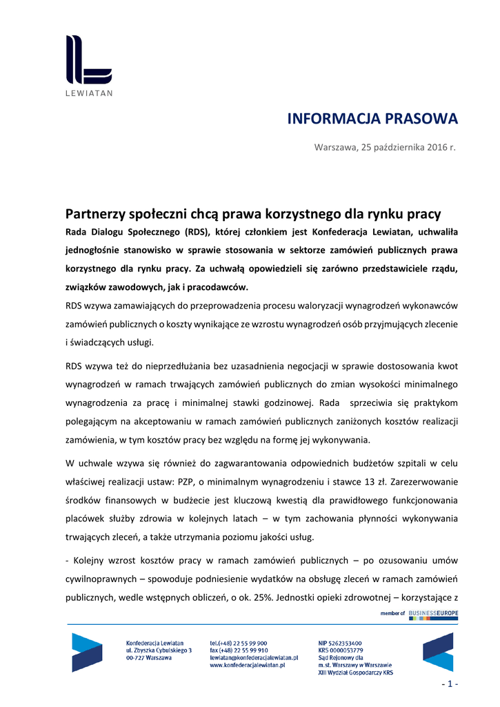 INFORMACJA PRASOWA Warszawa, 25 października 2016 r. Partnerzy społeczni chcą prawa korzystnego dla rynku pracy Rada Dialogu Społecznego (RDS), której członkiem jest Konfederacja Lewiatan, uchwaliła jednogłośnie stanowisko w sprawie stosowania w sektorze zamówień publicznych prawa korzystnego dla rynku pracy. Za uchwałą opowiedzieli się zarówno przedstawiciele rządu, związków zawodowych, jak i pracodawców. RDS wzywa zamawiających do przeprowadzenia procesu waloryzacji wynagrodzeń wykonawców zamówień publicznych o koszty wynikające ze wzrostu wynagrodzeń osób przyjmujących zlecenie i świadczących usługi. RDS wzywa też do nieprzedłużania bez uzasadnienia negocjacji w sprawie dostosowania kwot wynagrodzeń w ramach trwających zamówień publicznych do zmian wysokości minimalnego wynagrodzenia za pracę i minimalnej stawki godzinowej. Rada sprzeciwia się praktykom polegającym na akceptowaniu w ramach zamówień publicznych zaniżonych kosztów realizacji zamówienia, w tym kosztów pracy bez względu na formę jej wykonywania. W uchwale wzywa się również do zagwarantowania odpowiednich budżetów szpitali w celu właściwej realizacji ustaw: PZP, o minimalnym wynagrodzeniu i stawce 13 zł. Zarezerwowanie środków finansowych w budżecie jest kluczową kwestią dla prawidłowego funkcjonowania placówek służby zdrowia w kolejnych latach – w tym zachowania płynności wykonywania trwających zleceń, a także utrzymania poziomu jakości usług. - Kolejny wzrost kosztów pracy w ramach zamówień publicznych – po ozusowaniu umów cywilnoprawnych – spowoduje podniesienie wydatków na obsługę zleceń w ramach zamówień publicznych, wedle wstępnych obliczeń, o ok. 25%. Jednostki opieki zdrowotnej – korzystające z -1- zewnętrznych firm świadczących usługi sprzątania czy dostarczających posiłki do szpitali – muszą być na to gotowe. Odpowiedzialność spoczywa również na Ustawodawcy – powinnością jest zagwarantowanie na ten cel środków w budżecie jednostek mu podległych. Jednym z kluczowych zamierzeń nowelizacji przepisów jest podwyższenie minimalnego wynagrodzenia bez negatywnego wpływu na poziom zatrudnienia oraz jakość realizacji zleconych zadań. Służy temu obowiązkowa waloryzacja kontraktów – spoczywająca na szpitalach jako Zamawiających, nie zaś na podmiotach świadczących usługi – mówi Marek Kowalski, przewodniczący Zespołu ds. Zamówień Publicznych przy Radzie Dialogu Społecznego, ekspert Konfederacji Lewiatan. W świetle zmian w przepisach wchodzących w życie 1 stycznia 2017 roku – które podnoszą płacę minimalną do 2 000 zł oraz ustanawiają najniższą stawkę godzinową na poziomie 13 zł – nieodzowne jest dostosowanie długoterminowych kontraktów obowiązujących w ramach zamówień publicznych do zwiększonych kosztów realizacji zleceń. W celu zapewnienia prawidłowej realizacji umów na podstawie obowiązującego prawa wykonawcy muszą mieć zagwarantowaną waloryzację umów oraz stawek za wykonywanie świadczeń. - Rada Dialogu Społecznego to ciało niezwykle ważne i niezwykle potrzebne w polskim państwie, które zastąpiło funkcjonującą przez wiele lat formułę Komisji Trójstronnej; formułę, która, jak wszyscy państwo wtedy zgodnie twierdziliście, wyczerpała się. Dialog jest niezwykle potrzebny partnerom społecznym i przedstawicielom pracodawców, ale także jest potrzebny polskiemu rządowi po to, żeby omówić problemy, omówić i ocenić projekty ustaw, żeby wprowadzać rozwiązania, które nie tylko spotykają się z akceptacją ze strony partnerów społecznych i przedstawicieli pracodawców, ale także takie, które przede wszystkim są potrzebne Rzeczypospolitej, które pozwalają naprawiać polskie państwo – powiedział prezydent Andrzej Duda na uroczystym posiedzeniu Rady Dialogu Społecznego.1 Więcej informacji na blogu kowalski.blog.onet.pl oraz twitter.com/MarekKowalski. Konfederacja Lewiatan 1 Źródło: PAP, http://www.wnp.pl/wiadomosci/283661.html, 2016-10-19 -2-