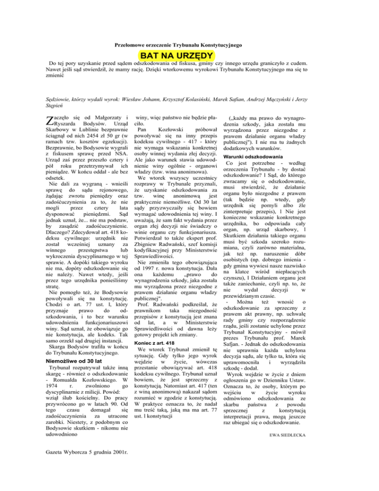 Przełomowe orzeczenie Trybunału Konstytucyjnego BAT NA URZĘDY Do tej pory uzyskanie przed sądem odszkodowania od fiskusa, gminy czy innego urzędu graniczyło z cudem. Nawet jeśli sąd stwierdził, że mamy rację. Dzięki wtorkowemu wyrokowi Trybunału Konstytucyjnego ma się to zmienić Sędziowie, którzy wydali wyrok: Wiesław Johann, Krzysztof Kolasiński, Marek Safian, Andrzej Mączyński i Jerzy Stępień się od Małgorzaty i Zaczęło Ryszarda Bodysów. Urząd Skarbowy w Lublinie bezprawnie ściągnął od nich 2454 zł 50 gr (w ramach tzw. kosztów egzekucji). Bezprawnie, bo Bodysowie wygrali z fiskusem sprawę przed NSA. Urząd zaś przez przeszło cztery i pół roku przetrzymywał ich pieniądze. W końcu oddał - ale bez odsetek. Nie dali za wygraną - wnieśli sprawę do sądu rejonowego, żądając zwrotu pieniędzy oraz zadośćuczynienia za to, że nie mogli przez cztery lata dysponować pieniędzmi. Sąd jednak uznał, że... nie ma podstaw, by zasądzić zadośćuczynienie. Dlaczego? Zdecydował art. 418 kodeksu cywilnego: urzędnik nie został wcześniej uznany za winnego przestępstwa lub wykroczenia dyscyplinarnego w tej sprawie. A dopóki takiego wyroku nie ma, dopóty odszkodowanie się nie należy. Nawet wtedy, jeśli przez tego urzędnika ponieśliśmy stratę. Nie pomogło też, że Bodysowie powoływali się na konstytucję. Chodzi o art. 77 ust. l, który przyznaje prawo do odszkodowania, i to bez warunku udowodnienia funkcjonariuszowi winy. Sąd uznał, że obowiązuje go nie konstytucja, ale kodeks. Tak samo orzekł sąd drugiej instancji. Skarga Bodysów trafiła w końcu do Trybunału Konstytucyjnego. Niemożliwe od 30 lat Trybunał rozpatrywał także inną skargę - również o odszkodowanie - Romualda Kozłowskiego. W 1974 r. zwolniono go dyscyplinarnie z milicji. Powód: wziął ślub kościelny. Do pracy przywrócono go w latach 90. Od tego czasu domagał się zadośćuczynienia za utracone zarobki. Niestety, z podobnym co Bodysowie skutkiem - nikomu nie udowodniono Gazeta Wyborcza 5 grudnia 2001r. winy, więc państwo nie będzie płaciło. Pan Kozłowski próbował powoływać się na inny przepis kodeksu cywilnego - 417 - który nie wymaga wskazania konkretnej osoby winnej wydania złej decyzji. Ale jako warunek stawia udowodnienie winy ogólnie - organowi władzy (tzw. wina anonimowa). We wtorek wszyscy uczestnicy rozprawy w Trybunale przyznali, że uzyskanie odszkodowania za tzw. winę anonimową jest praktycznie niemożliwe. Od 30 lat sądy przyzwyczaiły się bowiem wymagać udowodnienia tej winy. I uważają, że sam fakt wydania przez organ złej decyzji nie świadczy o winie organu czy funkcjonariusza. Potwierdzał to także ekspert prof. Zbigniew Radwański, szef komisji kodyfikacyjnej przy Ministerstwie Sprawiedliwości. Nie zmieniła tego obowiązująca od 1997 r. nowa konstytucja. Dała ona każdemu „prawo do wynagrodzenia szkody, jaka została mu wyrządzona przez niezgodne z prawem działanie organu władzy publicznej". Prof. Radwański podkreślał, że prawnikom taka niezgodność przepisów z konstytucją jest znana od lat, a w Ministerstwie Sprawiedliwości od dawna leży gotowy projekt ich zmiany. Koniec z art. 418 We wtorek Trybunał zmienił tę sytuację. Gdy tylko jego wyrok wejdzie w życie, wówczas przestanie obowiązywać art. 418 kodeksu cywilnego. Trybunał uznał bowiem, że jest sprzeczny z konstytucją. Natomiast art. 417 (ten z winą anonimową) nakazał sądom rozumieć w zgodzie z konstytucją. W praktyce oznacza to, że nadał mu treść taką, jaką ma ma art. 77 ust. l konstytucji („każdy ma prawo do wynagrodzenia szkody, jaka została mu wyrządzona przez niezgodne z prawem działanie organu władzy publicznej"). I nie ma tu żadnych dodatkowych warunków. Warunki odszkodowania Co jest potrzebne - według orzeczenia Trybunału - by dostać odszkodowanie? l Sąd, do którego zwracamy się o odszkodowanie, musi stwierdzić, że działanie organu było niezgodne z prawem (tak będzie np. wtedy, gdy urzędnik się pomyli albo źle zinterpretuje przepis), l Nie jest konieczne wskazanie konkretnego urzędnika, bo odpowiada cały organ, np. urząd skarbowy, l Skutkiem działania takiego organu musi być szkoda szeroko rozumiana, czyli zarówno materialna, jak też np. naruszenie dóbr osobistych (np. dobrego imienia gdy gmina wywiesi nasze nazwisko na klatce wśród niepłacących czynszu), l Działaniem organu jest także zaniechanie, czyli np. to, że nie wydał decyzji w przewidzianym czasie. Można też wnosić o odszkodowanie za sprzeczny z prawem akt prawny, np. uchwałę rady gminy czy rozporządzenie rządu, jeśli zostanie uchylone przez Trybunał Konstytucyjny - mówił prezes Trybunału prof. Marek Safjan. - Jednak do odszkodowania nie uprawnia każda uchylona decyzja sądu, ale tylko ta, która się uprawomocniła i wyrządziła szkodę - dodał. Wyrok wejdzie w życie z dniem ogłoszenia go w Dzienniku Ustaw. Oznacza to, że osoby, którym po wejściu w życie wyroku odmówiono odszkodowania ze skarbu państwa z powodu sprzecznej z konstytucją interpretacji prawa, mogą jeszcze raz ubiegać się o odszkodowanie. EWA SIEDLECKA