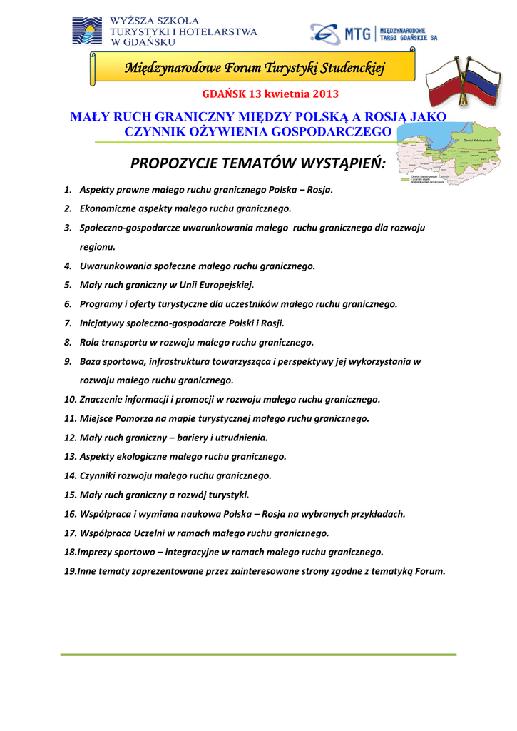 Międzynarodowe Forum Turystyki Studenckiej GDAŃSK 13 kwietnia 2013 MAŁY RUCH GRANICZNY MIĘDZY POLSKĄ A ROSJĄ JAKO CZYNNIK OŻYWIENIA GOSPODARCZEGO PROPOZYCJE TEMATÓW WYSTĄPIEŃ: 1. Aspekty prawne małego ruchu granicznego Polska – Rosja. 2. Ekonomiczne aspekty małego ruchu granicznego. 3. Społeczno-gospodarcze uwarunkowania małego ruchu granicznego dla rozwoju regionu. 4. Uwarunkowania społeczne małego ruchu granicznego. 5. Mały ruch graniczny w Unii Europejskiej. 6. Programy i oferty turystyczne dla uczestników małego ruchu granicznego. 7. Inicjatywy społeczno-gospodarcze Polski i Rosji. 8. Rola transportu w rozwoju małego ruchu granicznego. 9. Baza sportowa, infrastruktura towarzysząca i perspektywy jej wykorzystania w rozwoju małego ruchu granicznego. 10. Znaczenie informacji i promocji w rozwoju małego ruchu granicznego. 11. Miejsce Pomorza na mapie turystycznej małego ruchu granicznego. 12. Mały ruch graniczny – bariery i utrudnienia. 13. Aspekty ekologiczne małego ruchu granicznego. 14. Czynniki rozwoju małego ruchu granicznego. 15. Mały ruch graniczny a rozwój turystyki. 16. Współpraca i wymiana naukowa Polska – Rosja na wybranych przykładach. 17. Współpraca Uczelni w ramach małego ruchu granicznego. 18.Imprezy sportowo – integracyjne w ramach małego ruchu granicznego. 19.Inne tematy zaprezentowane przez zainteresowane strony zgodne z tematyką Forum.