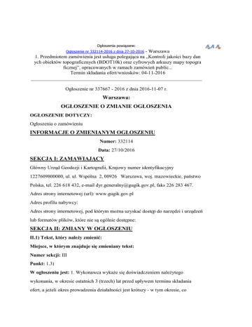 Ogłoszenia powiązane: Ogłoszenie nr 332114-2016 z dnia 27-10-2016 - Warszawa 1. Przedmiotem zamówienia jest usługa polegająca na „Kontroli jakości bazy dan ych obiektów topograficznych (BDOT10k) oraz cyfrowych arkuszy mapy topogra ficznej”, opracowanych w ramach zamówień public... Termin składania ofert/wniosków: 04-11-2016 Ogłoszenie nr 337667 - 2016 z dnia 2016-11-07 r. Warszawa: OGŁOSZENIE O ZMIANIE OGŁOSZENIA OGŁOSZENIE DOTYCZY: Ogłoszenia o zamówieniu INFORMACJE O ZMIENIANYM OGŁOSZENIU Numer: 332114 Data: 27/10/2016 SEKCJA I: ZAMAWIAJĄCY Główny Urząd Geodezji i Kartografii, Krajowy numer identyfikacyjny 1227609800000, ul. ul. Wspólna 2, 00926 Warszawa, woj. mazowieckie, państwo Polska, tel. 226 618 432, e-mail [email protected], faks 226 283 467. Adres strony internetowej (url): www.gugik.gov.pl Adres profilu nabywcy: Adres strony internetowej, pod którym można uzyskać dostęp do narzędzi i urządzeń lub formatów plików, które nie są ogólnie dostępne: SEKCJA II: ZMIANY W OGŁOSZENIU II.1) Tekst, który należy zmienić: Miejsce, w którym znajduje się zmieniany tekst: Numer sekcji: III Punkt: 1.3) W ogłoszeniu jest: 1. Wykonawca wykaże się doświadczeniem należytego wykonania, w okresie ostatnich 3 (trzech) lat przed upływem terminu składania ofert, a jeżeli okres prowadzenia działalności jest krótszy - w tym okresie, co najmniej: 1) jednej usługi polegającej na kontroli jakości prac obejmujących opracowanie wektorowych map, o wartość nie mniejszej niż 200 000,00 PLN brutto; przez kontrolę jakości rozumie się min. czynności polegające na: sprawdzeniu zgodności opracowanych produktów z określonymi wymogami, raportowaniu wyników kontroli, bieżącym sprawdzaniu i raportowaniu w określonych odstępach czasowych stanu realizacji prac oraz poprawności opracowywanych produktów; 2) jednej usługi polegającej na opracowaniu modelu jakości danych przestrzennych, o wartość nie mniejszej niż 100 000,00 PLN brutto; 3) jednej usługi polegającej na opracowaniu lub aktualizacji co najmniej 3 (trzech) zbiorów bazy danych obiektów topograficznych (BDOT10k), zgodnie z Rozporządzeniem Ministra Spraw Wewnętrznych i Administracji z dnia 17 listopada 2011 r. w sprawie bazy danych obiektów topograficznych oraz bazy danych obiektów ogólnogeograficznych a także standardowych opracowań kartograficznych, przy czym dopuszcza się możliwość wykazania zrealizowanych usług opracowania w/w zbiorów BDOT10k w ramach różnych zamówień; przez zbiór bazy danych obiektów topograficznych rozumie się dane obejmujące jeden powiat; 4) jednej usługi polegającej na opracowaniu co najmniej 5 (pięciu) arkuszy mapy topograficznej w skali 1 : 10 000, zgodnie z Rozporządzeniem Ministra Spraw Wewnętrznych i Administracji z dnia 17 listopada 2011 r. w sprawie bazy danych obiektów topograficznych oraz bazy danych obiektów ogólnogeograficznych a także standardowych opracowań kartograficznych, przy czym dopuszcza się możliwość wykazania zrealizowanych usług opracowania w/w map w ramach różnych zamówień; Doświadczenie dotyczące wszystkich rodzajów usług, o których mowa w ust. 1, może wynikać z realizacji zamówień obejmujących łącznie lub odrębnie te usługi. W przypadku, gdy ww. usługi realizowane były łącznie z innymi usługami niewymienionymi w ust. 1, Wykonawca musi bezwzględnie określić wartość brutto tylko tych usług (każdej osobno), które potwierdzają spełnienie warunków udziału w niniejszym postępowaniu. Uwaga: Wykonawca w wykazie usług zobowiązany jest podać tylko te główne usługi, które potwierdzają spełnienie warunków udziału w postępowaniu. Zamawiający wymaga, aby Wykonawca wskazał konkretne usługi na potwierdzenie spełnienia powyższego warunku, a nie zawierał zapisy typu „zgodne z SIWZ” lub wpisywał wymagania podane przez Zamawiającego na zasadzie „kopiuj-wklej”. 2. Wykonawca będzie dysponował na etapie realizacji zamówienia osobami zdolnymi do wykonania zamówienia, które spełniają następujące wymagania: 1) Kierownik projektu – co najmniej 1 (jedna) osoba Wymagane kwalifikacje i doświadczenie zawodowe: a) znajomość metodyki zarządzania projektami PRINCE2 lub równoważnej, przy czym przez metodykę równoważną rozumie się metodykę powszechnie stosowaną (stosowanie nie wymaga opłat autorskich) i publicznie dostępną (opis metodyki jest opublikowany i szeroko dostępny), która stanowi zbiór reguł i zasad postępowania stanowiący spójne pojęciowo podejście do wykonywania i zarządzania projektem oraz umożliwia adaptację do specjalnych potrzeb organizacji, programu lub projektu; b) w ciągu ostatnich 3 (trzech) lat przed upływem terminu składania ofert pełnił funkcję kierownika projektu przy realizacji co najmniej 2 (dwóch) zakończonych usług o łącznej wartości nie mniejszej niż 500 000,00 PLN brutto, przy czym wartość jednej z usług nie może być mniejsza niż 250 000,00 PLN brutto; 2) Specjalista ds. kartografii – co najmniej 1 (jedna) osoba Wymagane kwalifikacje i doświadczenie zawodowe: a) posiada uprawnienia zawodowe z zakresu „redakcja map”, o których mowa w art. 43 pkt 6 ustawy pgik; b) w ciągu ostatnich 3 (trzech) lat przed upływem terminu składania ofert uczestniczył jako specjalista przy realizacji co najmniej 2 (dwóch) zakończonych usług, polegających na opracowaniu mapy topograficznej w skali 1 : 10 000 zgodnie z Rozporządzeniem Ministra Spraw Wewnętrznych i Administracji z dnia 17 listopada 2011 r. w sprawie bazy danych obiektów topograficznych oraz bazy danych obiektów ogólnogeograficznych a także standardowych opracowań kartograficznych; 3) Specjalista ds. kontroli jakości danych – co najmniej 1 (jedna) osoba Wymagane kwalifikacje i doświadczenie zawodowe: a) posiada uprawnienia zawodowe z zakresu „redakcja map”, o których mowa w art. 43 pkt 6 ustawy pgik, b) w ci