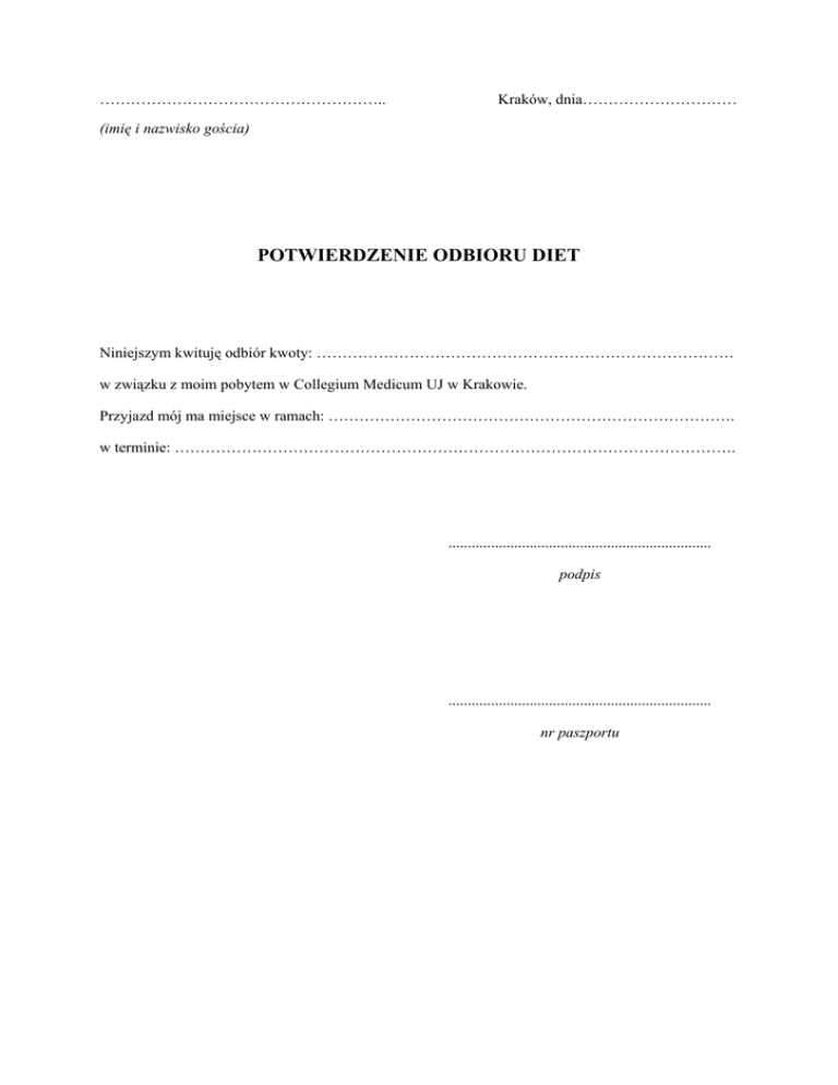 ……………………………………………….. Kraków, dnia………………………… (imię i nazwisko gościa) POTWIERDZENIE ODBIORU DIET Niniejszym kwituję odbiór kwoty: ……………………………………………………………………… w związku z moim pobytem w Collegium Medicum UJ w Krakowie. Przyjazd mój ma miejsce w ramach: ……………………………………………………………………. w terminie: ………………………………………………………………………………………………. .................................................................... podpis .................................................................... nr paszportu