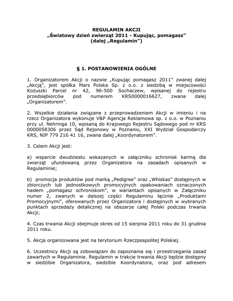 REGULAMIN AKCJI „Światowy dzień zwierząt 2011 - Kupując, pomagasz” (dalej „Regulamin”) § 1. POSTANOWIENIA OGÓLNE 1. Organizatorem Akcji o nazwie „Kupując pomagasz 2011” zwanej dalej „Akcją”, jest spółka Mars Polska Sp. z o.o. z siedzibą w miejscowości Kożuszki Parcel nr 42, 96-500 Sochaczew, wpisanej do rejestru przedsiębiorców pod numerem KRS0000016627, zwana dalej „Organizatorem”. 2. Wszelkie działania związane z przeprowadzeniem Akcji w imieniu i na rzecz Organizatora wykonuje V&P Agencja Reklamowa sp. z o.o. w Poznaniu przy ul. Nehringa 10, wpisaną do Krajowego Rejestru Sądowego pod nr KRS 0000058306 przez Sąd Rejonowy w Poznaniu, XXI Wydział Gospodarczy KRS, NIP 779 216 41 16, zwana dalej „Koordynatorem”. 3. Celem Akcji jest: a) wsparcie dwudziestu wskazanych w załączniku schronisk karmą dla zwierząt ufundowaną przez Organizatora na zasadach opisanych w Regulaminie; b) promocja produktów pod marką „Pedigree” oraz „Whiskas” dostępnych w zbiorczych lub jednostkowych promocyjnych opakowaniach oznaczonych hasłem „pomagasz schroniskom”, w wariantach opisanych w Załączniku numer 2, zwanych w dalszej części Regulaminu łącznie „Produktami Promocyjnymi”, oferowanych przez Organizatora i dostępnych w wybranych punktach sprzedaży detalicznej na obszarze całej Polski podczas trwania Akcji; 4. Czas trwania Akcji obejmuje okres od 15 sierpnia 2011 roku do 31 grudnia 2011 roku. 5. Akcja organizowana jest na terytorium Rzeczpospolitej Polskiej. 6. Uczestnicy Akcji są zobowiązani do zapoznania się i przestrzegania zasad zawartych w Regulaminie. Regulamin w trakcie trwania Akcji będzie dostępny w siedzibie Organizatora, siedzibie Koordynatora, oraz pod adresem www.posilekdlaschroniska.pl. Uczestnictwo w Akcji, rozumiane przesłanie Zgłoszenia oznacza akceptację postanowień Regulaminu. jako 7. W Akcji biorą udział schroniska dla zwierząt (dalej „Beneficjenci”) wskazane w Załączniku numer 1 do niniejszego regulaminu. 8. Wyłącznym fundatorem Posiłków, które przekazane Beneficjentom, jest Organizator. w ramach Akcji zostaną § 2. WARUNKI UCZESTNICTWA 1. W Akcji mogą uczestniczyć osoby fizyczne - konsumenci w rozumieniu art. 221 kodeksu cywilnego, posiadające pełną zdolność do czynności prawnych, zamieszkałe na terytorium Rzeczpospolitej Polskiej, za wyjątkiem pracowników Organizatora, pracowników Koordynatora, właścicieli oraz pracowników punktów sprzedaży oferujących Produkty Promocyjne, oraz najbliższych członków ich rodzin. Przez najbliższych członków rodziny rozumie się: wstępnych, zstępnych, rodzeństwo, małżonków, rodziców małżonków i osoby pozostające w stosunku przysposobienia ( dalej „Uczestnicy”). 2. W Akcji nie mogą brać udziału osoby prawne i jednostki organizacyjne nie posiadające osobowości prawnej, za wyjątkiem partnerów Akcji zaproszonych imiennie do udziału przez Organizatora, którym Organizator przyzna według swojego uznania pulę unikalnych kodów do wykorzystania w formie bezpośredniego przekazania wskazanemu Beneficjentowi lub kuponów do rozprowadzenia wśród konsumentów – klientów partnera. 3. Udział w Akcji jest dobrowolny. 4. W Akcji uczestniczą osoby fizyczne, które w dniach od 15 sierpnia 2011 roku do 31 grudnia 2011 roku: a) otrzymają za pośrednictwem gazet wydawanych przez partnerów medialnych Akcji, w formie insertu, kupon zawierający unikalny kod, lub b) otrzymają od partnera Akcji ( §2 ustęp 2 Regulaminu) kupon zawierający unikalny kod, lub c) dokonają zakupu co najmniej jednego z pośród Produktów Promocyjnych oznaczonych hasłem „pomagasz schroniskom” zawierającego kupon z unikatowym kodem, a następnie wyślą unikalny kod za pośrednictwem : - strony internetowej www.posilekdlaschroniska.pl , lub - wiadomości SMS na numer 70700 (koszt SMS: 0,50 zł plus podatek VAT, tj. 0,62 złotych brutto), - wskazując jednocześnie jednego Beneficjenta, na rzecz którego Organizator przekaże karmę dla zwierząt ( dalej „Zgłoszenie”). 5. W akcji uczestniczą również osoby fizyczne, które w dniach od 15 sierpnia 2011 roku do 31 grudnia 2011 roku posiadają konto w serwisie społecznościowym facebook.com wezmą udział w wydarzeniu pod nazwą „STOP PUSTUM MISKOM – POMAGAMY SCHRONISKOM” w rozumieniu nomenklatury stosowanej w tym serwisie. Uczestnictwo jednej osoby w tym wydarzeniu powodować będzie przekazanie przez Organizatora jednego posiłku na rzecz beneficjenta. Organizator przekaże Stowarzyszeniu Na Rzecz Odpowiedzialnej Opieki Nad Zwierzętami Domowymi łącznie tyle posiłków, ile osób będzie brać udział w tym wydarzeniu według stanu na dzień 31 grudnia 2011 r. o godz. 23.59. , natomiast wskazane stowarzyszenie dokona podziału zebranej w ten sposób ilości posiłków pomiędzy poszczególnymi beneficjentami w sposób proporcjonalny, z uwzględnieniem ilości zwierząt które przebywają w schroniskach prowadzonych przez poszczególnych beneficjentów. 6. Wiadomość SMS, o której mowa w §2 ustęp 4 punkt f) podpunkt ii) powinna zawierać następującą treść: wyraz „POSILEK”, numer jednego wybranego Beneficjenta z pośród wskazanych na kuponie, oraz numer unikalnego kodu znajdującego się na kuponie ( dla przykładu: POSILEK 02 VB45HHH3). W odpowiedzi na przesłaną wiadomość Koordynator w ciągu 2 dni roboczych prześle za pośrednictwem SMS informację o przyjęciu Zgłoszenia lub jego wadliwości. 7. W Akcji uwzględniane będą jedynie wiadomości SMS wysłane z telefonu komórkowego, za pośrednictwem sieci operatorów telefonii komórkowej korzystających z polskich zasobów numeracji. W Akcji nie będą brały udziału Zgłoszenia wysyłane za pomocą internetowych bramek SMS. Uczestnik dokonujący zgłoszenia za pomoca SMS, otrzyma SMS-a zwrotnego z potwierdzeniem udziału i linkiem WAP, który będzie umożliwiał pobranie darmowej tapety na telefon komó