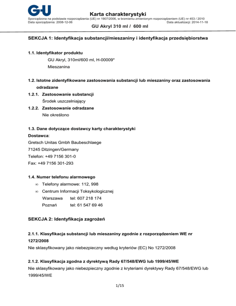 Karta charakterystyki Sporządzona na podstawie rozporządzenia (UE) nr 1907/2006, w brzmieniu zmienionym rozporządzeniem (UE) nr 453 / 2010 Data sporządzenia: 2008-12-06 Data aktualizacji: 2014-11-18 GU Akryl 310 ml / 600 ml SEKCJA 1: Identyfikacja substancji/mieszaniny i identyfikacja przedsiębiorstwa 1.1. Identyfikator produktu GU Akryl, 310ml/600 ml, H-00009* Mieszanina 1.2. Istotne zidentyfikowane zastosowania substancji lub mieszaniny oraz zastosowania odradzane 1.2.1. Zastosowanie substancji Środek uszczelniający 1.2.2. Zastosowanie odradzane Nie określono 1.3. Dane dotyczące dostawcy karty charakterystyki Dostawca: Gretsch Unitas Gmbh Baubeschlaege 71245 Ditzingen/Germany Telefon: +49 7156 301-0 Fax: +49 7156 301-293 1.4. Numer telefonu alarmowego • Telefony alarmowe: 112, 998 • Centrum Informacji Toksykologicznej Warszawa tel: 607 218 174 Poznań tel: 61 547 69 46 SEKCJA 2: Identyfikacja zagrożeń 2.1.1. Klasyfikacja substancji lub mieszaniny zgodnie z rozporządzeniem WE nr 1272/2008 Nie sklasyfikowany jako niebezpieczny według kryteriów (EC) No 1272/2008 2.1.2. Klasyfikacja zgodna z dyrektywą Rady 67/548/EWG lub 1999/45/WE Nie sklasyfikowany jako niebezpieczny zgodnie z kryteriami dyrektywy Rady 67/548/EWG lub 1999/45/WE 1/15 Karta charakterystyki Sporządzona na podstawie rozporządzenia (UE) nr 1907/2006, w brzmieniu zmienionym rozporządzeniem (UE) nr 453 / 2010 Data sporządzenia: 2008-12-06 Data aktualizacji: 2014-11-18 GU Akryl 310 ml / 600 ml 2.2. Elementy oznakowania Zgodnie z Rozporządzeniem PE i Rady 1272/2008 Nie sklasyfikowany jako niebezpieczny według kryteriów (EC) No 1272/2008 Oznakowania dodatkowe EUH208 Zawiera: reagującą masę: 5-chloro-2-methyl-4-isothiazolin-3-one [EC no. 247-500-7] i 2-methyl-4-isothiazolin-3-one [EC no. 220-239-6] (3:1). Może powodować reakcje alergiczne. Zgodnie z dyrektywą Rady 67/548/EWG lub 1999/45/WE Nie sklasyfikowany jako niebezpieczny zgodnie z kryteriami dyrektywy Rady 67/548/EWG lub 1999/45/WE Zawiera: reagującą masę: 5-chloro-2-methyl-4-isothiazolin-3-one [EC no. 247-500-7] i 2methyl4-isothiazolin-3-one [EC no. 220-239-6] (3:1). Może powodować reakcje alergiczne. 2.3. Inne zagrożenia CLP Lekko drażniący dla oczu DSD / DPD Lekko drażniący dla oczu Może powodować reakcję alergiczą SEKCJA 3: Skład/informacja o składnikach 3.1. Substancje Nie dotyczy 3.2. Mieszanina Mieszanina nie zawiera substancji podlegających zgłoszeniu SEKCJA 4: Środki pierwszej pomocy 4.1. Opis środków pierwszej pomocy OGÓLNE. W przypadku złego samopoczucia zasięgnąć porady lekarskiej. 2/15 Karta charakterystyki Sporządzona na podstawie rozporządzenia (UE) nr 1907/2006, w brzmieniu zmienionym rozporządzeniem (UE) nr 453 / 2010 Data sporządzenia: 2008-12-06 Data aktualizacji: 2014-11-18 GU Akryl 310 ml / 600 ml Po wdychaniu: Wynieść poszkodowanego na świeże powietrze. W przypadku problemów z oddychaniem: zasięgnąć porady lekarza / personelu medycznego Po kontakcie ze skórą: Przemyć dużą ilością wody. Można używać mydła Jeżeli podrażnienie się utrzymuje zabrać poszkodowanego do lekarza Po kontakcie z oczami: Przemyć dużą ilością wody. Jeśli podrażnienie nie ustępuje zabrać poszkodowanego do okulisty. Po spożyciu: Wypłukać usta wodą. W przypadku złego samopoczucia skonsultować się z lekarzem / personelem medycznym. 4.2. Najważniejsze ostre i opóźnione objawy oraz skutki narażenia 4.2.1. Objawy ostre Po wdychaniu: Nie są znane Po kontakcie ze skórą: Nie są znane Po kontakcie z oczami: Nie są znane Po spożyciu: Nie są znane 4.2.2. Objawy opóźnione Nie są znane 4.3. Wskazania dotyczące wszelkiej natychmiastowej pomocy lekarskiej i szczególnego postępowania z poszkodowanym Jeśli informacja jest dostępna, zostanie umieszczona poniżej. SEKCJA 5: Postępowanie w przypadku pożaru 3/15 Karta charakterystyki Sporządzona na podstawie rozporządzenia (UE) nr 1907/2006, w brzmieniu zmienionym rozporządzeniem (UE) nr 453 / 2010 Data sporządzenia: 2008-12-06 Data aktualizacji: 2014-11-18 GU Akryl 310 ml / 600 ml 5.1. Środki gaśnicze 5.1.1 Odpowiednie środki gaśnicze Mgła wodna, piana gaśnicza 5.1.2 Niewłaściwe środki gaśnicze Nie są znane 5.2. Szczególne zagrożenia związane z substancją lub mieszaniną Podczas spalania wydzielają się toksyczne i żrące gazy / pary ( HCl, CO i CO2 5.3. Informacje dla straży pożarnej 5.3.1 Zalecenia: Rozcieńczać toksyczne gazy przez spryskiwanie wodą . Wziąć pod uwagę toksyczne / żrące odpady wodne. 5.3.2 Specjalne wyposażenie ochronne dla strażaków: Rękawice ochronne. Odzież ochronna ( ekspozycja na ogień i ciepło): Aparat tlenowy. SEKCJA 6: Postępowanie w przypadku niezamierzonego uwolnienia do środowiska 6.1. Indywidualne środki ostrożności, wyposażenie ochronne i procedury w sytuacjach awaryjnych Chronić przed otwartym ogniem. 6.1.1 Wyposażenie ochronne dla personelu nie ratunkowego Patrz punkt 8.2 6.1.2 Wyposażenie ochronne dla personelu ratunkowego Rękawice ochronne. Odzież ochronna Odpowiednia odzież ochronna – patrz punkt 8.2 6.2. Środki ostrożności w zakresie ochrony środowiska Zawiera substancje płynne. Używać odpowiednich pojemników aby zapobiec przedostaniu się do środowiska. 6.3. Metody i materiały zapobiegające rozprzestrzenianiu się skażenia i służące do usuwania skażenia. 4/15 Karta charakterystyki Sporządzona na podstawie rozporządzenia (UE) nr 1907/2006, w brzmieniu zmienionym rozporządzeniem (UE) nr 453 / 2010 Data sporządzenia: 2008-12-06 Data aktualizacji: 2014-11-18 GU Akryl 310 ml / 600 ml Stałe pozostałości zbierać do zamykanych pojemników. pojemników. Zanieczyszczone powierzchnie czyścić roztworem wody z mydłem. Wyprać odzież i oczyścić wyposażenie po akcji. 6.4. Odniesienia do innych sekcji Patrz zalecenia przedstawione w sekcji 13. SEKCJA 7: Postępowanie z substancjami i mieszaninami oraz ich magazynowanie 7.1. Środki o