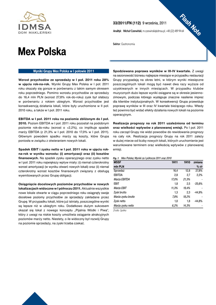 h as Fl 33/2011/FN (112) 9 września, 2011 Mex Polska Wyniki Grupy Mex Polska w I połowie 2011 Wzrost przychodów ze sprzedaży w I poł. 2011 roku 28% w ujęciu rok-na-rok. Wyniki Grupy Mex Polska w I poł. 2011 roku okazały się gorsze w porównaniu z takim samym okresem roku poprzedniego. Pomimo wzrostu przychodów ze sprzedaży do 16,4 mln PLN (wzrost 27,8% rok-do-roku) zysk był słabszy w porównaniu z rokiem ubiegłym. Wzrost przychodów jest konsekwencją działania lokali, które były uruchomione w II poł. 2010 roku, a także w I poł. 2011 roku. EBITDA w I poł. 2011 roku na poziomie zbliżonym do I poł. 2010. Poziom EBITDA w I poł. 2011 roku pozostał na podobnym poziomie rok-do-roku (wzrost o +2,2%), co implikuje spadek marży EBITDA (z 21,3% w I poł. 2010 do 17,0% w I poł. 2011). Głównym powodem spadku marży są koszty, które Grupa poniosła w związku z otwieraniem nowych lokali. Spadek EBIT i zysku netto w I poł. 2011 roku w ujęciu rokna-rok w wyniku wzrostu: (i) amortyzacji oraz (ii) kosztów finansowych. Na spadek zysku operacyjnego oraz zysku netto w I poł. 2011 roku największy wpływ miały: (i) niemal czterokrotny wzrost amortyzacji (w wyniku otwarć nowych lokali) oraz (ii) niemal czterokrotny wzrost kosztów finansowych związany z obsługą wyemitowanych przez Grupę obligacji. Osiągnięcie docelowych poziomów przychodów w nowych lokalizacjach widoczne w I półroczu 2011. Aktualnie wszystkie nowe lokale otwarte w ciągu poprzedniego roku osiągnęły swoje docelowe poziomy przychodów ze sprzedaży zakładane przez Grupę. W przypadku lokali, które już istniały, poszczególne wyniki są lepsze niż w ubiegłym roku. Dodatkowo dużym sukcesem okazał się lokal z nowego konceptu „Pijalnia Wódki i Piwa”, który z uwagi na niskie koszty umożliwia osiąganie atrakcyjnych poziomów marży netto. Niestety, o ile widoczny był rozwój Grupy na poziomie sprzedaży, na zyski trzeba czekać. te No Analityk: Michał Czerwiński, [email protected], +48 (22) 489 94 64 Sektor: Gastronomia Spodziewana poprawa wyników w III-IV kwartale. Z uwagi na sezonowość biznesu najlepsze miesiące w przypadku restauracji Grupy przypadają na okres letni, w którym wyniki miesięczne poszczególnych lokali mogą być nawet dwa razy wyższe od uzyskiwanych w innych miesiącach. W przypadku klubów muzycznych dużo lepsze wyniki osiągane są w okresie jesiennozimowym, podczas którego występuje znaczne nasilenie imprez dla klientów instytucjonalnych. W konsekwencji Grupa przewiduje poprawę wyników w III oraz IV kwartale bieżącego roku. Wtedy też powinno być widać efekty działania nowych lokali na poziomie operacyjnym. Realizacja prognozy na rok 2011 uzależniona od terminu oraz wielkości wpływów z planowanej emisji. Po I poł. 2011 roku zarząd Grupy nie widzi powodów do rewidowania prognozy na cały rok. Realizacja prognozy Grupy na rok 2011 zależy w dużej mierze od liczby nowych lokali, których uruchomienie jest warunkowane terminem oraz wielkością wpływów z planowanej emisji. Fig. 1 Mex Polska; Wyniki za I półrocze 2011 oraz 2010 MSSF mln PLN Sprzedaż EBITDA Marża EBITDA EBIT Marża EBIT Zysk brutto Marża zysku brutto Zysk netto Marża zysku netto Źródło: Spółka 1H11 1H10 16,4 2,8 17,0% 1,8 11,3% 1,3 7,8% 1,0 6,2% 12,8 2,7 21,3% 2,5 19,4% 2,3 18,2% 1,8 14,3% zmiana % r/r 27,8% 2,2% -25,6% -44,9% -44,8% - SŁOWNICZEK POJĘĆ Rotacja należności w dniach – Pokazuje, średnio po ilu dniach środki pieniężne z tytułu należności trafiają do firmy, liczona według formuły 365 / (przychody ze sprzedaży / średni stan należności w danym okresie). Rotacja zapasów w dniach – Pokazuje, średnio po ilu dniach zapasy są sprzedawane i odnawiane, liczona według formuły 365 / (koszt sprzedanych towarów / średni stan zapasów w danym okresie). Rotacja zobowiązań handlowych w dniach – Pokazuje liczoną w dniach średnią szybkość regulacji zobowiązań handlowych, liczona jest według formuły 365 / (koszt wytworzenia sprzedaży / średni stan zobowiązań handlowych w danym okresie). Płynność bieżąca – Pokazuje, w jakim stopniu możliwa jest ewentualna spłata zobowiązań krótkoterminowych poprzez zamianę na gotówkę majątku obrotowego, liczona jest jako stosunek aktywów obrotowych pomniejszonych o krótkoterminowe rozliczenia międzyokresowe do zobowiązań krótkoterminowych. Płynność szybka Pokazuje zdolność do zapłaty zobowiązań krótkoterminowych poprzez zamianę na gotówkę najbardziej płynnych składników aktywów obrotowych, liczona jako stosunek aktywów obrotowych pomniejszonych o zapasy i krótkoterminowe rozliczenia międzyokresowe do zobowiązań krótkoterminowych. Wskaźnik pokrycia odsetek – Pokazuje stopień zabezpieczenia obsługi długu, liczony jako stosunek zysku z działalności gospodarczej powiększonego o odsetki do wartości odsetek. Marża brutto na sprzedaży – Procentowy stosunek zysku brutto ze sprzedaży do wartości przychodów ze sprzedaży. Marża EBITDA – Procentowy stosunek zysku operacyjnego powiększonego o amortyzację do wartości przychodów ze sprzedaży. Marża EBIT – Procentowy stosunek zysku operacyjnego do wartości przychodów ze sprzedaży. Marża zysku przed opodatkowaniem – Procentowy stosunek zysku przed opodatkowaniem do wartości przychodów ze sprzedaży. ROE – Procentowy stosunek zysku netto do średniej wartości kapitału własnego przedsiębiorstwa w danym okresie. ROA – Procentowy stosunek zysku netto powiększonego o odsetki do wartości aktywów przedsiębiorstwa w danym okresie. EV – Wielkość przybliżająca teoretyczny koszt przejęcia przedsiębiorstwa, liczona jako kapitalizacja spółki powiększona o oprocentowane zobowiązania i pomniejszona o gotówkę i jej odpowiedniki (np.: krótkoterminowe płynne papiery dłużne). EPS – Zysk netto przypadający na jedną akcję wyemitowaną przez spółkę. CAGR – zł