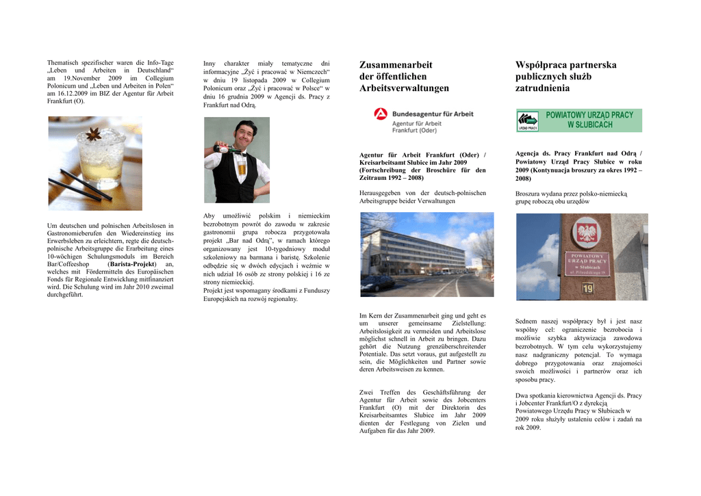 Thematisch spezifischer waren die Info-Tage „Leben und Arbeiten in Deutschland“ am 19.November 2009 im Collegium Polonicum und „Leben und Arbeiten in Polen“ am 16.12.2009 im BIZ der Agentur für Arbeit Frankfurt (O). Um deutschen und polnischen Arbeitslosen in Gastronomieberufen den Wiedereinstieg ins Erwerbsleben zu erleichtern, regte die deutschpolnische Arbeitsgruppe die Erarbeitung eines 10-wöchigen Schulungsmoduls im Bereich Bar/Coffeeshop (Barista-Projekt) an, welches mit Fördermitteln des Europäischen Fonds für Regionale Entwicklung mitfinanziert wird. Die Schulung wird im Jahr 2010 zweimal durchgeführt. Inny charakter miały tematyczne dni informacyjne „Żyć i pracować w Niemczech“ w dniu 19 listopada 2009 w Collegium Polonicum oraz „Żyć i pracować w Polsce“ w dniu 16 grudnia 2009 w Agencji ds. Pracy z Frankfurt nad Odrą. Zusammenarbeit der öffentlichen Arbeitsverwaltungen Współpraca partnerska publicznych służb zatrudnienia Agentur für Arbeit Frankfurt (Oder) / Kreisarbeitsamt Słubice im Jahr 2009 (Fortschreibung der Broschüre für den Zeitraum 1992 – 2008) Agencja ds. Pracy Frankfurt nad Odrą / Powiatowy Urząd Pracy Słubice w roku 2009 (Kontynuacja broszury za okres 1992 – 2008) Herausgegeben von der deutsch-polnischen Arbeitsgruppe beider Verwaltungen Broszura wydana przez polsko-niemiecką grupę roboczą obu urzędów Aby umożliwić polskim i niemieckim bezrobotnym powrót do zawodu w zakresie gastronomii grupa robocza przygotowała projekt „Bar nad Odrą”, w ramach którego organizowany jest 10-tygodniowy moduł szkoleniowy na barmana i baristę. Szkolenie odbędzie się w dwóch edycjach i weźmie w nich udział 16 osób ze strony polskiej i 16 ze strony niemieckiej. Projekt jest wspomagany środkami z Funduszy Europejskich na rozwój regionalny. Im Kern der Zusammenarbeit ging und geht es um unserer gemeinsame Zielstellung: Arbeitslosigkeit zu vermeiden und Arbeitslose möglichst schnell in Arbeit zu bringen. Dazu gehört die Nutzung grenzüberschreitender Potentiale. Das setzt voraus, gut aufgestellt zu sein, die Möglichkeiten und Partner sowie deren Arbeitsweisen zu kennen. Zwei Treffen des Geschäftsführung der Agentur für Arbeit sowie des Jobcenters Frankfurt (O) mit der Direktorin des Kreisarbeitsamtes Slubice im Jahr 2009 dienten der Festlegung von Zielen und Aufgaben für das Jahr 2009. Sednem naszej współpracy był i jest nasz wspólny cel: ograniczenie bezrobocia i możliwie szybka aktywizacja zawodowa bezrobotnych. W tym celu wykorzystujemy nasz nadgraniczny potencjał. To wymaga dobrego przygotowania oraz znajomości swoich możliwości i partnerów oraz ich sposobu pracy. Dwa spotkania kierownictwa Agencji ds. Pracy i Jobcenter Frankfurt/O z dyrekcją Powiatowego Urzędu Pracy w Słubicach w 2009 roku służyły ustaleniu celów i zadań na rok 2009. Die im Dezember 2008 gebildete deutschpolnischen Arbeitsgruppe mit Mitarbeitern aus der Agentur für Arbeit Frankfurt (Oder) und dem Kreisarbeitsamt Słubice traf sich regelmäßig einmal monatlich, um an der Umsetzung der gestellten Ziele zu arbeiten. Damit gewann die langjährige gute Zusammenarbeit zwischen der Agentur für Arbeit Frankfurt (Oder) und dem Kreisarbeitsamt Słubice im Jahr 2009 an Dynamik. In einer zweisprachigen Broschüre wurden zunächst die Ergebnisse der bisherigen Zusammenarbeit im Zeitraum 1992 – 2008 zusammengefasst. Die Auflage betrug 400 Exemplare, die im November 2009 an strategische Partner, Ämter auf beiden Seiten der Grenze sowie allen Interessierten übergeben wurden. Weitere Publikationen, meist kleinere Artikel in der Tagespresse sowie interne Informationsmaterialien für Mitarbeiter folgten. Utworzona w grudniu 2008 roku polskoniemiecka grupa robocza, w skład której wchodzą współpracownicy Agencji ds. Pracy z Frankfurtu nad Odrą oraz Powiatowego Urzędu Pracy w Słubicach spotykała się regularnie raz w miesiącu, aby pracować nad realizacją założonych celów. W ten sposób długoletnia współpraca pomiędzy Agencją ds. Pracy Frankfurt Odrą a Powiatowym Urzędem Pracy w Słubicach staje się coraz bardziej dynamiczna. W dwujęzycznej broszurze zostały przedstawione wyniki dotychczasowej współpracy w latach 1992 – 2008. Nakład wynosił 400 egzemplarzy, które zostały przekazane partnerom, urzędom po obu stronach granicy oraz wszystkim zainteresowanym. Po niej następowały dalsze publikacje, w większości w postaci małych artykułów w prasie, jak i materiałów informacyjnych dla współpracowników. Ein anderer Schwerpunkt der Öffentlichkeitsarbeit war die Installierung einer gemeinsamen Internetseite, auf der sich sowohl Mitarbeiter als auch alle Interessierten über gemeinsame Projekte informieren können. Dies gestaltete sich schwieriger als gedacht und steckt auch jetzt noch in den Kinderschuhen. Doch es wird weiter daran gearbeitet, so dass sich ein „Vorbeischauen“ zunehmend lohnt: www.arbeitsagentur.de oder www.pupslubice.pl Innym obszarem działań PR była wspólna witryna internetowa, na której wszyscy pracownicy i osoby zainteresowane mogłyby uzyskać informacje o wspólnych projektach i planowanych działaniach. Ten punkt okazał się trudniejszy w realizacji niż planowano i w dalszym ciągu znajduje się w fazie początkowej. Nieustannie pracujemy nad tym zadaniem, zaś namiastka wspólnej witryny dostępna jest pod adresem: www.pupslubice.pl Współpraca międzynarodowa lub www.arbeitsagentur.de In der Zeit von September bis November 2009 wurden gegenseitige Hospitationen durchgeführt. Eine Mitarbeiterin des Arbeitsamtes Słubice informierte sich zwei Wochen lang über die Arbeit der deutschen Arbeit der deutschen Kollegen. 6 Mitarbeiter der Agentur für Arbeit hospitierten einen Tag im Arbeitsamt Słubice. Sie konnten viele Gemeinsamkeiten, aber auch Unterschiede feststellen. Vor allem aber wuchs das W okresie od września do listopada 2009 odbyły się wzajemne hospitacje. Pra