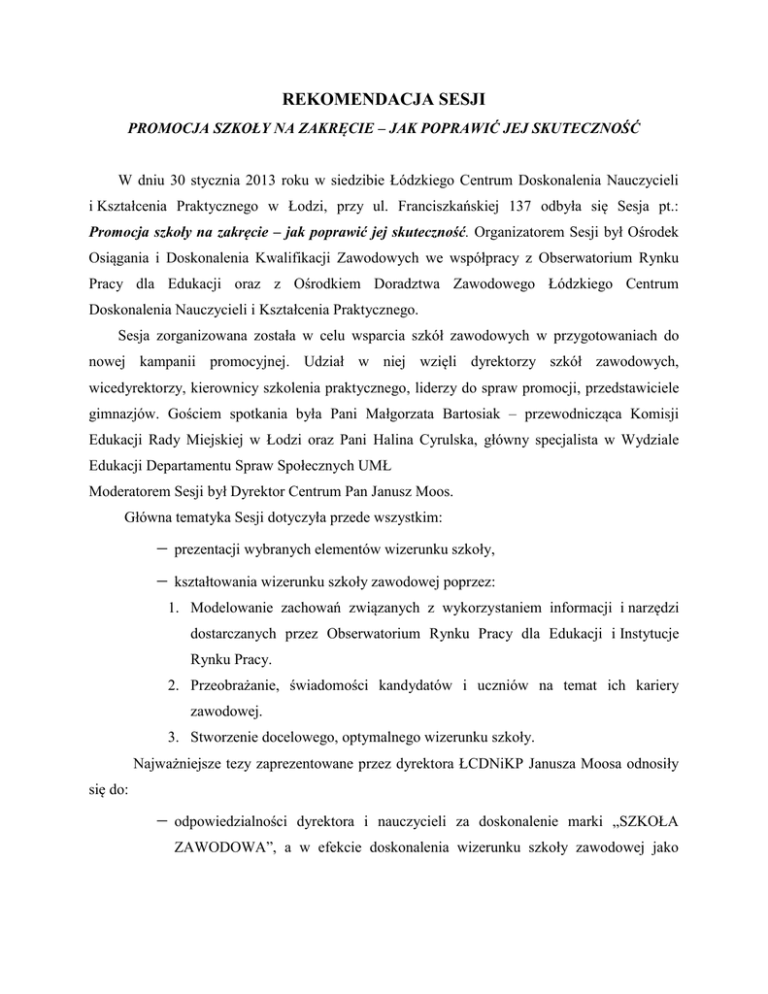 REKOMENDACJA SESJI PROMOCJA SZKOŁY NA ZAKRĘCIE – JAK POPRAWIĆ JEJ SKUTECZNOŚĆ W dniu 30 stycznia 2013 roku w siedzibie Łódzkiego Centrum Doskonalenia Nauczycieli i Kształcenia Praktycznego w Łodzi, przy ul. Franciszkańskiej 137 odbyła się Sesja pt.: Promocja szkoły na zakręcie – jak poprawić jej skuteczność. Organizatorem Sesji był Ośrodek Osiągania i Doskonalenia Kwalifikacji Zawodowych we współpracy z Obserwatorium Rynku Pracy dla Edukacji oraz z Ośrodkiem Doradztwa Zawodowego Łódzkiego Centrum Doskonalenia Nauczycieli i Kształcenia Praktycznego. Sesja zorganizowana została w celu wsparcia szkół zawodowych w przygotowaniach do nowej kampanii promocyjnej. Udział w niej wzięli dyrektorzy szkół zawodowych, wicedyrektorzy, kierownicy szkolenia praktycznego, liderzy do spraw promocji, przedstawiciele gimnazjów. Gościem spotkania była Pani Małgorzata Bartosiak – przewodnicząca Komisji Edukacji Rady Miejskiej w Łodzi oraz Pani Halina Cyrulska, główny specjalista w Wydziale Edukacji Departamentu Spraw Społecznych UMŁ Moderatorem Sesji był Dyrektor Centrum Pan Janusz Moos. Główna tematyka Sesji dotyczyła przede wszystkim: prezentacji wybranych elementów wizerunku szkoły, kształtowania wizerunku szkoły zawodowej poprzez: 1. Modelowanie zachowań związanych z wykorzystaniem informacji i narzędzi dostarczanych przez Obserwatorium Rynku Pracy dla Edukacji i Instytucje Rynku Pracy. 2. Przeobrażanie, świadomości kandydatów i uczniów na temat ich kariery zawodowej. 3. Stworzenie docelowego, optymalnego wizerunku szkoły. Najważniejsze tezy zaprezentowane przez dyrektora ŁCDNiKP Janusza Moosa odnosiły się do: odpowiedzialności dyrektora i nauczycieli za doskonalenie marki „SZKOŁA ZAWODOWA”, a w efekcie doskonalenia wizerunku szkoły zawodowej jako miejsca osiągania kwalifikacji zawodowych poprzez optymalne współdziałanie z pracodawcami, obowiązków szkoły zawodowej, która powinna prezentować: procesy osiągania kwalifikacji cząstkowych i kwalifikacji złożonych, zadania zawodowe stanowiące bazę informacyjną do organizacji procesu uczenia się oraz założenia procesu wykonywania przez uczących się projektów wynikających z celów i zadań szkoły, zadań zawodowych transportowanych z rzeczywistego procesu pracy i procesów uczenia się poprzez wykonywanie zadań zawodowych (kształcenia zadaniowomodułowego), które powinny stanowić ważny element wizerunku każdej szkoły zawodowej, roli jaką w procesach nad tworzeniem wizerunku szkoły powinni spełniać doradcy zawodowi oraz liderzy funkcjonujących nauczycielskich zespołów zadaniowych, metodycznych i innowacyjnych. Podczas Sesji była także okazja do podjęcia dyskusji na temat nowego podejścia do procesu promocji szkoły zawodowej oraz upowszechnienia dobrych praktyk szkół w zakresie prowadzonej działalności promocyjnej - Zespół Szkół Przemysłu Mody zaprezentował przykład zastosowania filmu jako innowacyjnego instrumentu promocji. Poniżej przedstawiamy rezultaty prac trzech zespołów roboczych oraz rekomendujemy wnioski zgłoszone podczas dyskusji. 1. Modelowaniem zachowań związanych z wykorzystaniem informacji i narzędzi dostarczanych przez Obserwatorium Rynku Pracy dla Edukacji i Instytucje Rynku Pracy zajmował się zespół pod kierunkiem dr Elżbiety Ciepuchy (kierownika Obserwatorium) w skład, którego wchodzili przedstawiciele Zespołu Szkół Ekonomiczno-Turystyczno-Hotelarskich w Łodzi, Zespołu Szkół Przemysłu Spożywczego w Łodzi, Zespołu Szkół Ponadgimnazjalnych nr 7 w Łodzi, Zespołu Szkół Przemysłu Mody w Łodzi, Zespołu Szkół Ponadgimnazjalnych nr 15 w Łodzi, Zespołu Szkół Ponadgimnazjalnych nr 19 w Łodzi, Zespołu Szkół Ponadgimnazjalnych nr 20 w Łodzi, Zespołu Szkół Ponadgimnazjalnych nr 22 w Łodzi oraz doradca zawodowy z Publicznego Gimnazjum nr 3 w Łodzi. Grupę wspierali pracownicy ŁCDNiKP dr Leszek Kuras, dr Jarosław Tokarski, Danuta Urbaniak oraz gość - Halina Cyrulska z WE UMŁ i Janusz Moos dyrektor ŁCDNiKP. Efektem dyskusji w grupie były wnioski dotyczące działań Obserwatorium Rynku Pracy 2 dla Edukacji istotnych dla kształtowania wizerunku szkoły i jej promocji, które Sesja rekomenduje: 1. Prowadzenie badań i analiz dotyczących rozpoznania potrzeb kadrowych rynku pracy oraz publikowanie ich wyników (raporty z badań i analiz, ekspertyzy, artykuły, itp.): prezentowanie szczegółowych informacji na temat zapotrzebowania rynku pracy na specjalistów z obszarów, w których kształcą szkoły zawodowe, prezentowanie prognoz dotyczących potrzeb rynku pracy w przyszłości. 2. Pozyskiwanie i przetwarzanie danych dotyczących inwestycji realizowanych w regionie łódzkim w celu określania przewidywanego zapotrzebowania na pracowników z określonych branż. 3. Udostępnienie wyników badań nauczycielom i dyrektorom szkół, uczniom i rodzicom, władzom samorządowym. 4. Współpraca w prowadzeniu badań losów absolwentów (wsparcie szkół) – określanie gdzie występują braki, gdzie szkoła powinna reagować, aby budować sprzężenia zwrotne w układzie edukacja – rynek pracy. 5. Organizowanie konferencji i seminariów umożliwiających prezentowanie dobrych praktyk szkół zawodowych (w zakresie współpracy z pracodawcami, stosowania nowoczesnych metod kształcenia, odpowiadania na aktualne i przewidywane potrzeby rynku pracy). 6. Prowadzenie przez pracowników ORPdE zajęć edukacyjnych dla uczniów gimnazjów dotyczących potrzeb rynku pracy, w celu dokonania prawidłowego wyboru dalszej ścieżki kształcenia. 7. Współpraca ORPdE z instytucjami edukacyjnymi, gospodarczymi i innymi instytucjami rynku pracy (ukazywanie wartości współpracy i jej znaczenia dla edukacji zawodowej) – jako przykład dobrej praktyki zorganizowania sieci partnerstwa na rzecz wsparcia edukacji regionalnej. Sesja rekomenduje również wnioski dotyczące sposobów, w jaki informa