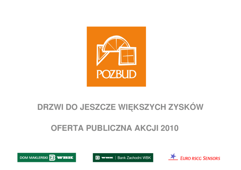 DRZWI DO JESZCZE WIĘKSZYCH ZYSKÓW OFERTA PUBLICZNA AKCJI 2010 ZASTRZEŻENIE Niniejszy materiał ma charakter wyłącznie promocyjny. Jedynym prawnie wiążącym dokumentem zawierającym informacje o Emitencie oraz o Publicznej Ofercie jest opublikowany 4 marca 2010 roku Prospekt Emisyjny Pozbud T&R SA, dostępny w wersji elektronicznej na stronach internetowych Emitenta www.pozbud.pl oraz Oferującego www.dmbzwbk.pl 2 HISTORIA ROZWOJU SPÓŁKI W latach 2008-2009 POZBUD dokonał dwóch istotnych inwestycji: • Zakupił firmę w upadłości – Wielkopolskiej Fabryki Mebli w Słonawach. Wartość transakcji to 6,1 mln zł. Na terenie zakładu produkcyjnego trwają prace modernizacyjne. • Nabył linię produkcyjną WENIG do kompleksu produkcyjnego w Słonawach za 2,0 mln EUR. Spółka przeznaczyła na inwestycję środki pozyskane z IPO. Linia została uruchomiona 26 maja 2009 r. 2010 2009 2008 2007 2006 2003 2002 1998 1995 1983 1975 Druga oferta publiczna akcji Podjęcie decyzji o przeprowadzeniu emisji akcji Debiut na GPW Przekształcenie w spółkę akcyjną Uzyskanie certyfikatu ISO 9001:2000 Zmiana nazwy na POZBUD T&R Powstanie POZ OKNA Sp. z o.o. Dołączenie do firmy przez Romana Andrzejaka Przekształcenie zakładu w firmę POZ-OKNA Objęcie kierownictwa zakładu przez Tadeusza Andrzejaka Założenie zakładu produkującego okna przez Ryszarda Andrzejaka 3 SPEŁNIONE OBIETNICE I DYNAMICZNY ROZWÓJ • POZBUD T&R spełnił wszystkie obietnice składane inwestorom podczas IPO w roku 2008: – Inwestycja w najnowocześniejszą w Polsce linię WEINIG podniosła wydajność; – Spółka zrealizowała prognozy wyników finansowych. • Zapełniony portfel kontraktów na rok 2010 pozwolił opublikować prognozę, która przewiduje dalszy znaczący wzrost. • Wykorzystując wysokie kompetencje, świetną znajomość rynku i rozbudowaną sieć sprzedaży POZBUD T&R angażuje się w nowy perspektywiczny sektor: drzwi wewnętrzne. • Przeprowadzenie emisji w 2010 będzie skutkowało zwiększeniem skali działalności i rozszerzeniem obszaru działania: – Inwestycja w linię technologiczną do produkcji drzwi wewnętrznych; – Potencjalne akwizycje. 4 PROFIL DZIAŁALNOŚCI Aktualna działalność spółki POZBUD koncentruje się przede wszystkim na następujących obszarach: Stolarka okienna drewniana z montażem jest podstawowym źródłem przychodów spółki. Produkcja okien drewnianych to najstarsza gałąź działalności spółki i najsilniejsza jej strona. Stolarka okienna drewniana Stolarka aluminiowa W III i IV kwartale 2009 roku istotny wpływ na poziom osiągniętych przychodów miał kontrakt związany ze sprzedażą stolarki aluminiowej. Usługi ogólnobudowlane Usługi ogólnobudowlane stanowią główne uzupełnienie sprzedaży stolarki otworowej. Struktura przychodów ze sprzedaży w 2009 r. Stolarka okienna drewniana 8% Usługi budowlane 18% 42% 32% Stolarka aluminiowa Pozostała stolarka i inne 5 RYNEK OKIEN PREMIUM STALE SIĘ ROZWIJA • Rynek stolarki otworowej „PREMIUM” dynamicznie się rozwija, z dynamiką wzrostu w latach 2006-2008 na poziomie 11% r/r: – Inwestorzy w sektorze budownictwa jednorodzinnego wybierają materiały wysokiej jakości. – W budownictwie wielorodzinnym deweloperzy konkurują poprzez stosowanie materiałów o coraz wyższej jakości. – Okna POZBUD-u stały się elementem wykończeniowym, za pomocą którego można podnosić standard wnętrz. • • Po trudnym roku 2008 produkcja całego sektora budowlanego w ciągu trzech kwartałów roku 2009 wzrosła o 4,7%. W latach 2010-2011 spodziewane jest dalsze przyspieszenie wzrostu. Chociaż dotychczas Spółka prowadziła głównie działalność w Polsce, rozwija sprzedaż eksportową na rynek europejski (Włochy, Niemcy, Irlandia, Wielka Brytania, Dania, Holandia, Grecja) i do USA. Produkcja okien w Polsce (w tys. sztuk) 14 000 12 000 13 100 10 000 8 000 12 200 6 000 4 000 10 700 2 000 0 2006 2007 2008 Produkcja drzwi w Polsce (w tys. sztuk) 8 500 8 000 8 200 7 500 8 000 7 000 6 500 7 800 6 000 2006 2007 2008 6 CORAZ SILNIEJSZA POZYCJA SPÓŁKI W POLSCE • • • Wartość rynku polskiej stolarki otworowej w 2008 roku wyniosła 7,6 mld złotych.* Silne rozproszenie rynku, na którym działa kilka tysięcy firm to szansa na ekspansję POZBUD T&R poprzez przejęcia. POZBUD prowadzi sprzedaż poprzez: – Własne biuro handlowe – Dealerów zlokalizowanych na terenie całego kraju – Rynek zamówień publicznych – klienci instytucjonalni • Najwyższe przychody ze sprzedaży spółka osiąga w województwie wielkopolskim (po IV kwartałach 2009 r. było to 57,7 mln zł). * Szacunkowa wartość przychodów producentów okien i drzwi wg zarządu spółki. 96 dealerów w Polsce 4 1 5 6 14 25 4 1 4 8 7 4 4 4 5 7 SEZONOWOŚĆ I STALE ROSNĄCE PRZYCHODY • • Wyraźna sezonowość sprzedaży wynikająca z prac budowlanych: ograniczenie wynikające z warunków atmosferycznych w zimie oraz kończenie inwestycji (instalowaniem stolarki otworowej) w ostatnich miesiącach roku. Sprzedaż koncentruje się w IV kwartale roku: średnio w latach 2006-2009 przychody IV kwartału stanowiły 39% przychodów całego roku. 30 Przychody ze sprzedaży w ujęciu kwartalnym (w mln zł) I kw. 27,3 25 II kw. 20 21,0 III kw. 17,3 15 IV kw. 10 10,4 0 7,1 6,9 5 5,3 2,3 3,1 2006 3,4 5,3 2007 13,2 12,0 5,6 5,7 2008 7,1 2009 8 BEZPIECZNE KANAŁY SPRZEDAŻY • • W 2009 roku POZBUD posiadał 10 odbiorców, których udział sprzedaży przekroczył 5% w obrotach netto ze sprzedaży spółki. Spółka zawarła także ramową umowę sprzedaży produktów na rynek grecki i cypryjski, której wartość w 2010 roku może wynieść 950 tys. euro i zwiększyć się do 1.150 tys. euro w roku 2011 oraz 1.350 tys. euro w roku 2012. Kontrahent Wartość umowy (tys. PLN) Kontrahent PBG S.A. 2 843 Baumal Sp. z o.o. Miasto Poznań 2 559 Miasto Poznań POL-AQUA S.A. 2 785 Hydrobudowa Polska S.A. POL-AQUA S.A. 2 500 DM Devel