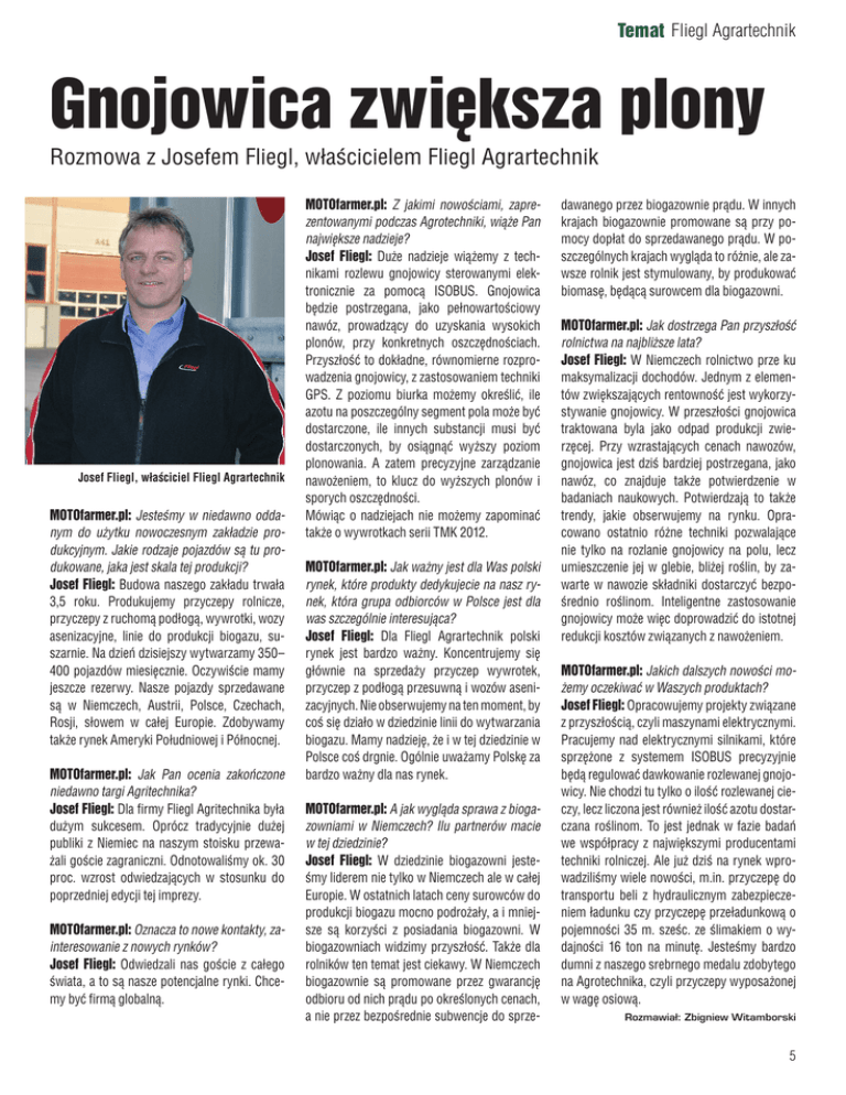 Temat Fliegl Agrartechnik Gnojowica zwiększa plony Rozmowa z Josefem Fliegl, właścicielem Fliegl Agrartechnik Josef Fliegl, właściciel Fliegl Agrartechnik MOTOfarmer.pl: Jesteśmy w niedawno oddanym do użytku nowoczesnym zakładzie produkcyjnym. Jakie rodzaje pojazdów są tu produkowane, jaka jest skala tej produkcji? Josef Fliegl: Budowa naszego zakładu trwała 3,5 roku. Produkujemy przyczepy rolnicze, przyczepy z ruchomą podłogą, wywrotki, wozy asenizacyjne, linie do produkcji biogazu, suszarnie. Na dzień dzisiejszy wytwarzamy 350– 400 pojazdów miesięcznie. Oczywiście mamy jeszcze rezerwy. Nasze pojazdy sprzedawane są w Niemczech, Austrii, Polsce, Czechach, Rosji, słowem w całej Europie. Zdobywamy także rynek Ameryki Południowej i Północnej. MOTOfarmer.pl: Jak Pan ocenia zakończone niedawno targi Agritechnika? Josef Fliegl: Dla firmy Fliegl Agritechnika była dużym sukcesem. Oprócz tradycyjnie dużej publiki z Niemiec na naszym stoisku przeważali goście zagraniczni. Odnotowaliśmy ok. 30 proc. wzrost odwiedzających w stosunku do poprzedniej edycji tej imprezy. MOTOfarmer.pl: Oznacza to nowe kontakty, zainteresowanie z nowych rynków? Josef Fliegl: Odwiedzali nas goście z całego świata, a to są nasze potencjalne rynki. Chcemy być firmą globalną. MOTOfarmer.pl: Z jakimi nowościami, zaprezentowanymi podczas Agrotechniki, wiąże Pan największe nadzieje? Josef Fliegl: Duże nadzieje wiążemy z technikami rozlewu gnojowicy sterowanymi elektronicznie za pomocą ISOBUS. Gnojowica będzie postrzegana, jako pełnowartościowy nawóz, prowadzący do uzyskania wysokich plonów, przy konkretnych oszczędnościach. Przyszłość to dokładne, równomierne rozprowadzenia gnojowicy, z zastosowaniem techniki GPS. Z poziomu biurka możemy określić, ile azotu na poszczególny segment pola może być dostarczone, ile innych substancji musi być dostarczonych, by osiągnąć wyższy poziom plonowania. A zatem precyzyjne zarządzanie nawożeniem, to klucz do wyższych plonów i sporych oszczędności. Mówiąc o nadziejach nie możemy zapominać także o wywrotkach serii TMK 2012. MOTOfarmer.pl: Jak ważny jest dla Was polski rynek, które produkty dedykujecie na nasz rynek, która grupa odbiorców w Polsce jest dla was szczególnie interesująca? Josef Fliegl: Dla Fliegl Agrartechnik polski rynek jest bardzo ważny. Koncentrujemy się głównie na sprzedaży przyczep wywrotek, przyczep z podłogą przesuwną i wozów asenizacyjnych. Nie obserwujemy na ten moment, by coś się działo w dziedzinie linii do wytwarzania biogazu. Mamy nadzieję, że i w tej dziedzinie w Polsce coś drgnie. Ogólnie uważamy Polskę za bardzo ważny dla nas rynek. MOTOfarmer.pl: A jak wygląda sprawa z biogazowniami w Niemczech? Ilu partnerów macie w tej dziedzinie? Josef Fliegl: W dziedzinie biogazowni jesteśmy liderem nie tylko w Niemczech ale w całej Europie. W ostatnich latach ceny surowców do produkcji biogazu mocno podrożały, a i mniejsze są korzyści z posiadania biogazowni. W biogazowniach widzimy przyszłość. Także dla rolników ten temat jest ciekawy. W Niemczech biogazownie są promowane przez gwarancję odbioru od nich prądu po określonych cenach, a nie przez bezpośrednie subwencje do sprze- dawanego przez biogazownie prądu. W innych krajach biogazownie promowane są przy pomocy dopłat do sprzedawanego prądu. W poszczególnych krajach wygląda to różnie, ale zawsze rolnik jest stymulowany, by produkować biomasę, będącą surowcem dla biogazowni. MOTOfarmer.pl: Jak dostrzega Pan przyszłość rolnictwa na najbliższe lata? Josef Fliegl: W Niemczech rolnictwo prze ku maksymalizacji dochodów. Jednym z elementów zwiększających rentowność jest wykorzystywanie gnojowicy. W przeszłości gnojowica traktowana byla jako odpad produkcji zwierzęcej. Przy wzrastających cenach nawozów, gnojowica jest dziś bardziej postrzegana, jako nawóz, co znajduje także potwierdzenie w badaniach naukowych. Potwierdzają to także trendy, jakie obserwujemy na rynku. Opracowano ostatnio różne techniki pozwalające nie tylko na rozlanie gnojowicy na polu, lecz umieszczenie jej w glebie, bliżej roślin, by zawarte w nawozie składniki dostarczyć bezpośrednio roślinom. Inteligentne zastosowanie gnojowicy może więc doprowadzić do istotnej redukcji kosztów związanych z nawożeniem. MOTOfarmer.pl: Jakich dalszych nowości możemy oczekiwać w Waszych produktach? Josef Fliegl: Opracowujemy projekty związane z przyszłością, czyli maszynami elektrycznymi. Pracujemy nad elektrycznymi silnikami, które sprzężone z systemem ISOBUS precyzyjnie będą regulować dawkowanie rozlewanej gnojowicy. Nie chodzi tu tylko o ilość rozlewanej cieczy, lecz liczona jest również ilość azotu dostarczana roślinom. To jest jednak w fazie badań we współpracy z największymi producentami techniki rolniczej. Ale już dziś na rynek wprowadziliśmy wiele nowości, m.in. przyczepę do transportu beli z hydraulicznym zabezpieczeniem ładunku czy przyczepę przeładunkową o pojemności 35 m. sześc. ze ślimakiem o wydajności 16 ton na minutę. Jesteśmy bardzo dumni z naszego srebrnego medalu zdobytego na Agrotechnika, czyli przyczepy wyposażonej w wagę osiową. Rozmawiał: Zbigniew Witamborski