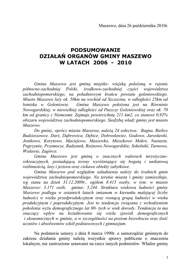 Maszewo, dnia 26 października 2010r. PODSUMOWANIE DZIAŁAŃ ORGANÓW GMINY MASZEWO W LATACH 2006 - 2010 Gmina Maszewo jest gminą miejsko- wiejską położoną w rejonie północno-zachodniej Polski, środkowo-zachodniej części województwa zachodniopomorskiego, na południowym krańcu powiatu goleniowskiego. Miasto Maszewo leży ok. 50km na wschód od Szczecina, w odległości 25km od lotniska w Goleniowie. Gmina Maszewo położona jest na Równinie Nowogardzkiej, w niewielkiej odległości od Puszczy Goleniowskiej oraz ok. 70 km od granicy z Niemcami. Zajmuje powierzchnię 211 km2, co stanowi 0,92% obszaru województwa zachodniopomorskiego. Siedzibą władz gminy jest miasto Maszewo. Do gminy, oprócz miasta Maszewa, należą 24 sołectwa: Bagna, Bielice Budzieszowce, Darż, Dąbrowica, Dębice, Dobrosławiec, Godowo, Jarosławki, Jenikowo, Korytowo, Maciejewo, Maszewko, Mieszkowo Mokre, Nastazin, Pogrzymie, Przemocze, Radzanek, Rożnowo Nowogardzkie, Sokolniki, Tarnowo, Wisławie, Zagórce. Gmina Maszewo jest gminą o znacznych walorach turystycznorekreacyjnych, posiadającą tereny wyróżniające się bogatą i unikatową roślinnością, lasy i jeziora oraz ciekawe obiekty zabytkowe. Gmina Maszewo pod względem zaludnienia należy do średnich gmin województwa zachodniopomorskiego. Na terenie miasta i gminy zamieszkuje, wg stanu na dzień 31.12.2009r., ogółem 8.415 osoby, w tym: w miasto Maszewo- 3.171 osób, gmina- 5.244. Struktura wiekowa ludności gminy Maszewo podlega w ostatnich latach zmianom w kierunku malejącej liczby ludności w wieku przedprodukcyjnym oraz rosnącą grupą ludności w wieku produkcyjnym i poprodukcyjnym. Jest to tendencja związana z wchodzeniem pokolenia wyżu demograficznego lat 80- tych w wiek dorosły. Tendencja ta ma znaczący wpływ na kształtowanie się wielu zjawisk demograficznych i ekonomicznych w gminie, a w szczególności na poziom bezrobocia oraz ilość uczniów i absolwentów szkół podstawowych i gimnazjum. Na podstawie ustawy z dnia 8 marca 1990r. o samorządzie gminnym do zakresu działania gminy należą wszystkie sprawy publiczne o znaczeniu lokalnym, nie zastrzeżone ustawami na rzecz innych podmiotów. Władze gminy 1 podejmują działania w celu zaspokojenia zbiorowych potrzeb lokalnych o charakterze powszechnym, nakierowane na jednostkę jakim jest mieszkaniec gminy, jak i na jego potrzeby. Gmina wykonuje zadania własne oraz zadania zlecone. Przez 20-letni okres funkcjonowania samorządu gminnego nie tylko zmieniła się ustawa o samorządzie gminnym, lecz radykalnie zwiększyły się zadania wykonywane przez gminy. W funkcjonowaniu samorządu gminnego nadal największym problemem pozostaje niedobór środków finansowych. Samorządom, co jest zgodne z ideą decentralizacji władzy, przekazywane są zadania, jednakże są one niewspółmierne do przyznawanych środków finansowych. Na zasady działania samorządu bardzo duże znaczenie miał rok 2004, który był dla naszego kraju czasem zmian. Przystąpienie Polski do Unii Europejskiej sprawiło, że stanęliśmy w obliczu nowych szans ustrojowych. Polska otrzymała możliwość korzystania ze środków pomocowych Unii Europejskiej. Programy unijne mają służyć także w celu mobilizacji lokalnych społeczności i pobudzenia aktywności do podejmowania wspólnych przedsięwzięć na rzecz poprawy warunków i jakości życia w swoich miejscowościach. Od momentu członkowstwa Polski w Unii Europejskiej jednym z ważniejszych działań maszewskich władz samorządowych stały się starania o jak najskuteczniejsze wykorzystanie funduszy unijnych, a tym samym przyczynienie się do rozwiązywania gminnych problemów społecznych. Szeroki zakres ustawowych zadań gmina wykonuje poprzez swoje jednostki organizacyjne: Urząd Miejski, Szkołę Podstawową w Maszewie, Szkołę Podstawową w Dębicach, Szkołę Podstawową w Rożnowie Nowogardzkim, Gimnazjum w Maszewie, Przedszkole Publiczne w Maszewie, Ośrodek Pomocy Społecznej, Ośrodek Kultury i Sportu, Bibliotekę Publiczną i Zakład Komunalny. Przystępując do pracy w bieżącej kadencji, od samego początku postawiliśmy jako główny cel- pozyskiwanie środków pozabudżetowych. Po szczegółowej analizie budżetu- planowanych dochodach i wydatkach, biorąc pod uwagę panujący kryzys oraz sytuację mieszkańców gminy, uznaliśmy, że takie działania mogą przyczynić się do realizacji wspólnych celów. Już w minionej kadencji zgromadziliśmy część niezbędnych dokumentów strategicznych przygotowując się do okresu programowego na lata 2007- 2013, a kompletne dokumenty opracowaliśmy w tej kadencji. Wykonanie powyższych dokumentów było możliwe dzięki dobrej współpracy władz samorządowych z przedstawicielami społeczeństwa lokalnego gminy Maszewo. 2 Uważam, ze minione 4 lata były dla Gminy Maszewo udane. Biorąc tylko pod uwagę skuteczność sięgania po fundusze pozabudżetowe i ich wykorzystywanie- z pewnością TAK. Środki pozabudżetowe były pozyskiwane z funduszy unijnych w ramach Regionalnego Programu Operacyjnego Województwa Zachodniopomorskiego na lata 2007- 2013, Programu Rozwoju Obszarów Wiejskich Województwa Zachodniopomorskiego na lata 2007- 2013 oraz funduszy pozyskanych m.in. z Wojewódzkiego Funduszu Ochrony Środowiska i Gospodarki Wodnej w Szczecinie, Ministerstwa Edukacji Narodowej, Narodowego Programu Przebudowy Dróg Lokalnych na lata 2008- 2011, Wojewódzkiego Konserwatora Zabytków, Wydziału Kultury, Sportu i Edukacji Urzędu Wojewódzkiego w Szczecinie. Była to ciężka praca, która wymagała bardzo szybkiego, a co za tym idzie skutecznego działania. Gmina wzbogaciła się dzięki pozyskaniu dodatkowych funduszy o duży majątek, który w przyszłości będzie procentować. Jest mi przyjemnie poinformować, że łączna kwota pozyskanych środków pozabudżetowych w tej kadencji wyniosła: 20mln 509tys. 615zł, 76 gr. I to uważam za wielkie osiągnięcie. Ponadto 