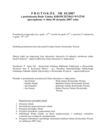 Protokół Nr IX/2007 - Urząd Gminy Krościenko Wyżne
