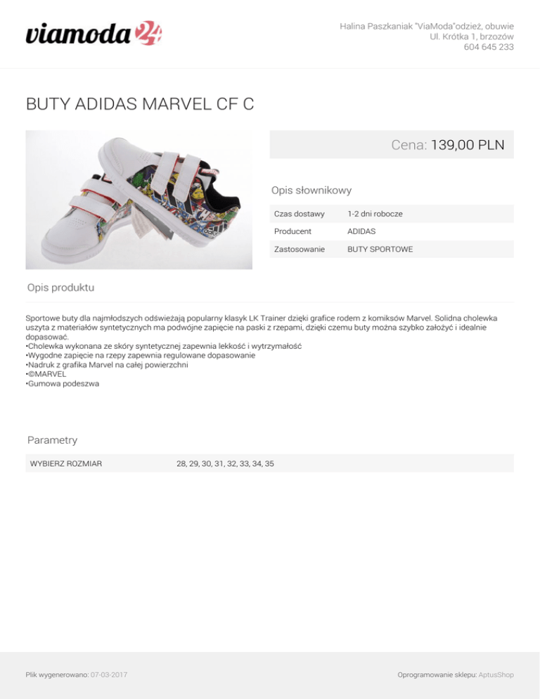 Halina Paszkaniak "ViaModa"odzież, obuwie Ul. Krótka 1, brzozów 604 645 233 BUTY ADIDAS MARVEL CF C Cena: 139,00 PLN Opis słownikowy Czas dostawy 1-2 dni robocze Producent ADIDAS Zastosowanie BUTY SPORTOWE Opis produktu Sportowe buty dla najmłodszych odświeżają popularny klasyk LK Trainer dzięki grafice rodem z komiksów Marvel. Solidna cholewka uszyta z materiałów syntetycznych ma podwójne zapięcie na paski z rzepami, dzięki czemu buty można szybko założyć i idealnie dopasować. •Cholewka wykonana ze skóry syntetycznej zapewnia lekkość i wytrzymałość •Wygodne zapięcie na rzepy zapewnia regulowane dopasowanie •Nadruk z grafika Marvel na całej powierzchni •©MARVEL •Gumowa podeszwa Parametry WYBIERZ ROZMIAR Plik wygenerowano: 07-03-2017 28, 29, 30, 31, 32, 33, 34, 35 Oprogramowanie sklepu: AptusShop Halina Paszkaniak "ViaModa"odzież, obuwie Ul. Krótka 1, brzozów 604 645 233 Galeria Plik wygenerowano: 07-03-2017 Powered by TCPDF (www.tcpdf.org) Oprogramowanie sklepu: AptusShop