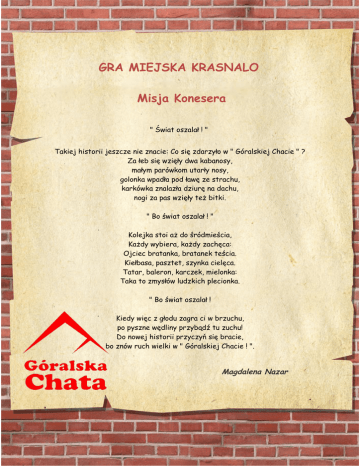 GRA MIEJSKA KRASNALO Misja Konesera " Świat oszalał ! " Takiej historii jeszcze nie znacie: Co się zdarzyło w " Góralskiej Chacie " ? Za łeb się wzięły dwa kabanosy, małym parówkom utarły nosy, golonka wpadła pod ławę ze strachu, karkówka znalazła dziurę na dachu, nogi za pas wzięły też bitki. " Bo świat oszalał ! " Kolejka stoi aż do śródmieścia, Każdy wybiera, każdy zachęca: Ojciec bratanka, bratanek teścia. Kiełbasa, pasztet, szynka cielęca. Tatar, baleron, karczek, mielonka: Taka to zmysłów ludzkich plecionka. " Bo świat oszalał ! Kiedy więc z głodu zagra ci w brzuchu, po pyszne wędliny przybądź tu zuchu! Do nowej historii przyczyń się bracie, bo znów ruch wielki w " Góralskiej Chacie ! ". Magdalena Nazar Krzysztof Jankowiak Zasmakuj się w wędlinach tradycyjnie wędzonych Przez firmę „Góralska Chata” wytworzonych Niech zapach soczystej wędliny Prowadzi Cię w rozkoszy głębiny A smak Cię mile zaskoczy Wędliny nacieszą nawet twoje oczy! :) Natalia Jankowiak Pewnie się nie spodziewacie Jakie pyszne są wędliny w "Góralskiej Chacie" Smakiem zaskakują Wyglądem oczarowują Nie znajdziecie nic lepszego Od mięska pysznego! ;) Gracjan Barczyk Pierwszy sklep Góralska Chata Odwiedziłem tego lata Ceny są tu atrakcyjne A wędliny tradycyjne Zawsze dobrze uwędzone Świeże, pyszne - w mig zjedzone! By zwiększyć odbiorców grono Nową filię otworzono Na otwarcie się wybrałem, Niespodziankę otrzymałem. A że jest mi ciągle mało Wygrać kosz by się przydało Babcia by się ucieszyła Gdyby taki zobaczyła Byłaby wręcz wniebowzięta Gdybym przywiózł go na święta ;) Adrian Nazar Wędliny tradycyjne wędzone... Czuje jak płonę, gdy zębami w nich tonę, Mięsa tego smak jest mych marzeń milionem, Góralska Chata jest mego smaku idolem. Gubię swe oczy wśród kiełbas kreacji, Gdy zanurzam się w morzu atrakcji. Wędliny tradycyjne wędzone... To miejsce staje się mym drugim domem, Jak żadne inne jest magią mięsa zwieńczone. Gdy wchodzę zaczynam podróż z salcesonem, Kończę z siatką wędlin i baleronem. Wędliny tradycyjne wędzone... Za jeden kęs oddam złotą koronę. Szynka, boczek, karczek, schab, Góralska Chata jest najlepszą z chat. Mam chęć na jej boskie wyroby, Innymi nie zaprzątam swej głowy. Wędliny tradycyjne wędzone... Na studenckim wikcie przydałby się wędlin kosz cały, bo wszyscy lokatorzy mają apetyt niemały! Lodówka zawsze pustkami świeci, czasem jakiś napój z niej wyleci... Na początek miesiąca wszyscy czekają, bo nowe fundusze dostają. Przechodząc obok Góralskiej Chaty na Krzywoustego zaglądam do mojego portfela prawie pustego. Dobrze, że ceny nie są wygórowane, bo zakupy tam zawsze są mile widziane. Asia, Basia i Ewelina wzrok znad książek podniosą, gdy tylko zapachy wędlin w domu się uniosą! W akademiku jest ludzi bez liku – wszyscy się ucieszą z wędlinek w koszyku! Emilia Bernacka Góralska Chata - wędlin oferta bogata Krasnale codziennie do Areny biegały i z półki szynkę podjadały. Rozeszła się po mieście fama, że w Góralskiej Chacie wędlin jest cała gama! Wiadomość dotarła również do ludzi, w których zapach wędzonki apetyt budzi. Biedny Właściciel z tłumem poradzić sobie nie mógł - wtem jeden Krasnal bardzo mu pomógł... Kiełbaskę świeżą na plecy zarzucił i na ulicę Krzywoustego podrzucił. Kiełbaski było jednak za mało – ludzie kupili, ile się dało! Właściciel zdziwiony przywiózł jeszcze boczek wędzony. Wszystko szybko się sprzedało, ale ludzi wciąż mnóstwo zostało. Kobiety się przepychały – jedna przez drugą w kolejce krzyczały. Aby szynki skosztowały, Właściciel otworzył na Krzywoustego sklep cały! Krasnale na całym świecie już słyszały, że w Góralskiej Chacie wszystkim wędliny smakowały. Właściciel ma teraz problem niemały – niedługo w wędlinki będzie musiał zaopatrywać świat cały! A ja życzę mu wszystkiego najlepszego i chętnie skosztuję schabiku słynnego z kosza wyjętego! Paweł Kozak Góralska Chata kusi zapachem, W niej zawsze znajdziesz pyszną kiełbachę. Świeża, pachnąca, soczysta, Myśl o niej wszystkie myśli oczyszcza. Wędliny dla dorosłych, wędliny dla dzieci, Góralska Chata takimi przysmakami zły humor podleczy Czy to chłopak czy dziewczyna, Wędliny tradycyjnie wędzone cała rodzina wcina. I choćby przyszło tysiąc atletów, I każdy zjadły po dziesięć domowych pasztetów, I każdy nie wiem jak się natężał, To Góralska Chata zawsze w przysmaki jest pełna. Barbara Sroka Czy Ci chłopie nie żal, czyś już stracił rozum, Baba jeszcze w pracy, a Ty idziesz do domu. Wstąp do Góralskiej Chaty, poddaj się smakowi tradycyjnej kiełbasy Niech ona ukoi twe podniebienie, Niech baba wie gdzie jest najlepsze jedzenie. Idź do domu i wołaj wszędzie, żeś się nawrócił, że biada innym sprzedawcom będzie. Tylko tradycyjnie wędzone wędliny jadać teraz trzeba Góralska Chata już zadba o nasze podniebienia. Mateusz Morawa