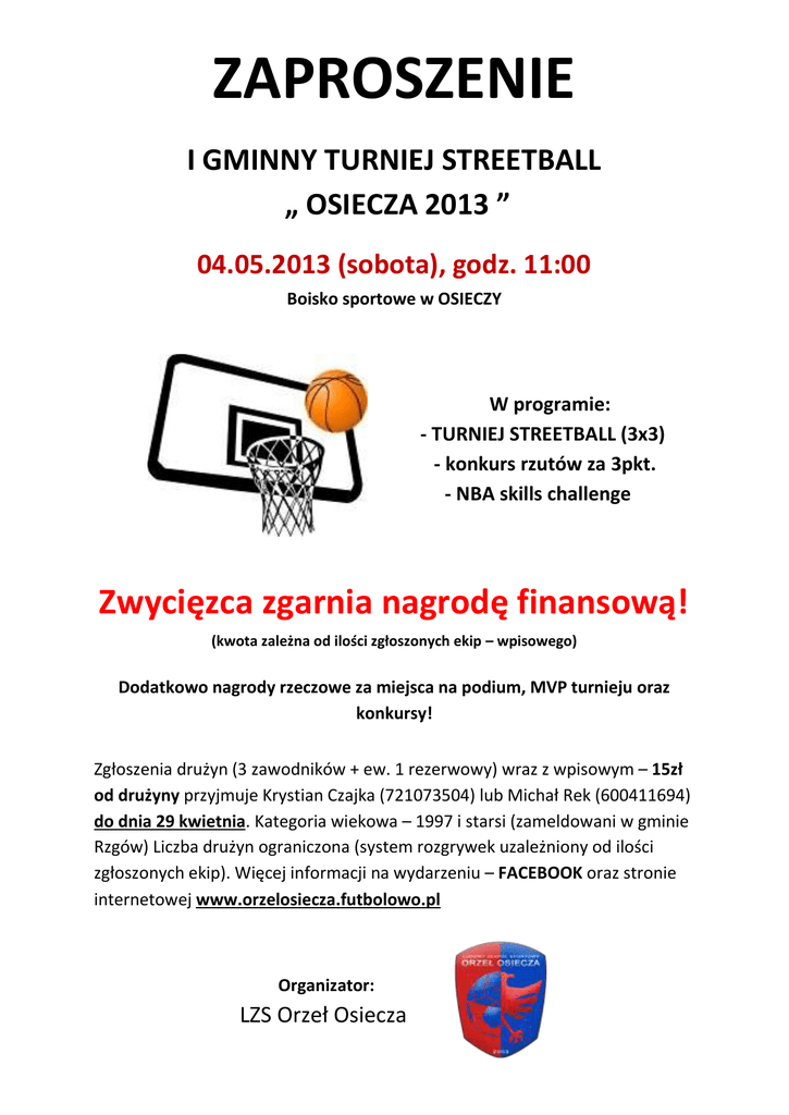 ZAPROSZENIE I GMINNY TURNIEJ STREETBALL „ OSIECZA 2013 ” 04.05.2013 (sobota), godz. 11:00 Boisko sportowe w OSIECZY W programie: - TURNIEJ STREETBALL (3x3) - konkurs rzutów za 3pkt. - NBA skills challenge Zwycięzca zgarnia nagrodę finansową! (kwota zależna od ilości zgłoszonych ekip – wpisowego) Dodatkowo nagrody rzeczowe za miejsca na podium, MVP turnieju oraz konkursy! Zgłoszenia drużyn (3 zawodników + ew. 1 rezerwowy) wraz z wpisowym – 15zł od drużyny przyjmuje Krystian Czajka (721073504) lub Michał Rek (600411694) do dnia 29 kwietnia. Kategoria wiekowa – 1997 i starsi (zameldowani w gminie Rzgów) Liczba drużyn ograniczona (system rozgrywek uzależniony od ilości zgłoszonych ekip). Więcej informacji na wydarzeniu – FACEBOOK oraz stronie internetowej www.orzelosiecza.futbolowo.pl Organizator: LZS Orzeł Osiecza