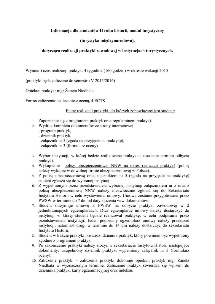 Informacja dla studentów II roku historii, moduł turystyczny (turystyka międzynarodowa), dotycząca realizacji praktyki zawodowej w instytucjach turystycznych. Wymiar i czas realizacji praktyk: 4 tygodnie (160 godzin) w okresie wakacji 2015 (praktyki będą zaliczane do semestru V 2015/2016) Opiekun praktyk: mgr Żaneta Niedbała Forma zaliczenia: zaliczenie z oceną, 4 ECTS Etapy realizacji praktyki, do których zobowiązany jest student: 1. 2. Zapoznanie się z programem praktyk oraz regulaminem praktyki. Wydruk kompletu dokumentów ze strony internetowej: - program praktyk, - dziennik praktyk, - załącznik nr 5 (zgoda na przyjęcie na praktykę), - załącznik nr 3 (formularz oceny). 3. Wybór instytucji, w której będzie realizowana praktyka i ustalenie terminu odbycia praktyki. Wykupienie polisy ubezpieczeniowej NNW na okres realizacji praktyk! (polisę należy wykupić w dowolnej firmie ubezpieczeniowej w Polsce). Z polisą ubezpieczeniową oraz złącznikiem nr 5 (zgoda na przyjęcie na praktykę) student zgłasza się do wybranej instytucji. Z wypełnionym przez przedstawiciela wybranej instytucji załącznikiem nr 5 oraz z polisą ubezpieczeniową NNW należy niezwłocznie zgłosić się do Sekretariatu Instytutu Historii w celu wystawienia umowy. Umowa zostanie przygotowana przez PWSW w terminie do 7 dni od daty złożenia w/w dokumentów. Student otrzymuje umowę z PWSW na odbycie praktyki zawodowej w 2 jednobrzmiących egzemplarzach. Dwa egzemplarze umowy należy dostarczyć do instytucji w której student będzie realizował praktykę, w celu podpisania przez przedstawiciela instytucji. Jeden podpisany egzemplarz umowy należy przekazać instytucji, natomiast drugi w terminie do 14 dni należy dostarczyć do sekretariatu Instytutu Historii. Student w trakcie praktyki prowadzi dziennik praktyk, który powinien być wypełniony zgodnie z programem praktyk. Po zakończeniu praktyki należy złożyć w sekretariacie Instytutu Historii następujące dokumenty: uzupełniony dziennik praktyk, wypełniony załącznik nr 3 (formularz oceny). Zaliczenie praktyki - zaliczenia praktyki dokonuje opiekun praktyk mgr Żaneta Niedbała w wyznaczonym terminie. Zaliczenie praktyk stwierdza się wpisem do dziennika praktyk, karty egzaminacyjnej oraz indeksu. 4. 5. 6. 7. 8. 9. 10.