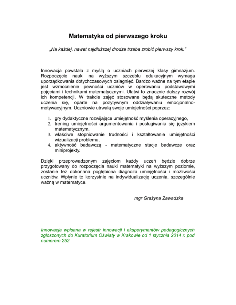 Matematyka od pierwszego kroku „Na każdej, nawet najdłuższej drodze trzeba zrobić pierwszy krok.” Innowacja powstała z myślą o uczniach pierwszej klasy gimnazjum. Rozpoczęcie nauki na wyższym szczeblu edukacyjnym wymaga uporządkowania dotychczasowych osiagnięć. Bardzo ważne na tym etapie jest wzmocnienie pewności uczniów w operowaniu podstawowymi pojęciami i technikami matematycznymi. Ułatwi to znacznie dalszy rozwój ich kompetencji. W trakcie zajęć stosowane będą skuteczne metody uczenia się, oparte na pozytywnym oddziaływaniu emocjonalnomotywacyjnym. Uczniowie utrwalą swoje umiejetności poprzez: 1. gry dydaktyczne rozwijające umiejętność myślenia operacyjnego, 2. trening umiejętności argumentowania i posługiwania się językiem matematycznym, 3. właściwe stopniowanie trudności i kształtowanie umiejętności wizualizacji problemu, 4. aktywność badawczą - matematyczne stacje badawcze oraz miniprojekty. Dzięki przeprowadzonym zajęciom każdy uczeń będzie dobrze przygotowany do rozpoczęcia nauki matematyki na wyższym poziomie, zostanie też dokonana pogłębiona diagnoza umiejętności i możliwości uczniów. Wpłynie to korzystnie na indywidualizację uczenia, szczególnie ważną w matematyce. mgr Grażyna Zawadzka Innowacja wpisana w rejestr innowacji i eksperymentów pedagogicznych zgłoszonych do Kuratorium Oświaty w Krakowie od 1 stycznia 2014 r. pod numerem 252
