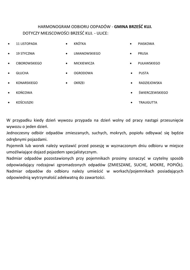 HARMONOGRAM ODBIORU ODPADÓW - GMINA BRZEŚĆ KUJ. DOTYCZY MIEJSCOWOŚCI BRZEŚĆ KUJ. - ULICE: 11 LISTOPADA KRÓTKA PIASKOWA 19 STYCZNIA LIMANOWSKIEGO PRUSA CIBOROWSKIEGO MICKIEWICZA PUŁAWSKIEGO GŁUCHA OGRODOWA PUSTA KONARSKIEGO OKRZEI RADZIEJOWSKA KOŃCOWA ŚWIERCZEWSKIEGO KOŚCIUSZKI TRAUGUTTA W przypadku kiedy dzień wywozu przypada na dzień wolny od pracy nastąpi przesunięcie wywozu o jeden dzień. Jednoczesny odbiór odpadów zmieszanych, suchych, mokrych, popiołu odbywać się będzie odrębnymi pojazdami. Pojemnik lub worek należy wystawić przed posesję w wyznaczonym dniu odbioru w miejsce umożliwiające dojazd pojazdem specjalistycznym. Nadmiar odpadów pozostawionych przy pojemnikach prosimy oznaczyć w czytelny sposób odpowiadający rodzajowi zgromadzonych odpadów (ZMIESZANE, SUCHE, MOKRE, POPIÓŁ). Nadmiar odpadów do odbioru należy umieścić w workach/pojemnikach posiadających odpowiednią wytrzymałość adekwatną do zawartości. ODPADY ZMIESZANE/SUCHE/MOKRE/POPIÓŁ UWAGA: POPIÓŁ BĘDZIE ODBIERANY PODCZAS PIERWSZEJ WIZYTY W NASTĘPUJĄCYCH MIESIĄCACH: PAŹDZIERNIK GRUDZIEŃ HARMONOGRAM ODBIORU ODPADÓW - GMINA BRZEŚĆ KUJ. DOTYCZY MIEJSCOWOŚCI BRZEŚĆ KUJ. - ULICE: Al. WŁ. ŁOKIETKA KRAKOWSKA PODMIERNA DUBOIS KRASZEWSKIEGO PRZESMYK FARSKA KRZYŻOWA REYMONTA GŁOWACKIEGO NARUTOWICZA RYBAKI KONOPNICKIEJ ORZESZKOWEJ SŁOWACKIEGO KOPERNIKA PL. WŁ. ŁOKIETKA TARGOWA WIDOK W przypadku kiedy dzień wywozu przypada na dzień wolny od pracy nastąpi przesunięcie wywozu o jeden dzień. Jednoczesny odbiór odpadów zmieszanych, suchych, mokrych, popiołu odbywać się będzie odrębnymi pojazdami. Pojemnik lub worek należy wystawić przed posesję w wyznaczonym dniu odbioru w miejsce umożliwiające dojazd pojazdem specjalistycznym. Nadmiar odpadów pozostawionych przy pojemnikach prosimy oznaczyć w czytelny sposób odpowiadający rodzajowi zgromadzonych odpadów (ZMIESZANE, SUCHE, MOKRE, POPIÓŁ). Nadmiar odpadów do odbioru należy umieścić w workach/pojemnikach posiadających odpowiednią wytrzymałość adekwatną do zawartości. ODPADY ZMIESZANE/SUCHE/MOKRE/POPIÓŁ UWAGA: POPIÓŁ BĘDZIE ODBIERANY PODCZAS PIERWSZEJ WIZYTY W NASTĘPUJĄCYCH MIESIĄCACH: PAŹDZIERNIK GRUDZIEŃ HARMONOGRAM ODBIORU ODPADÓW - GMINA BRZEŚĆ KUJ. DOTYCZY MIEJSCOWOŚCI BRZEŚĆ KUJ. - ULICE: ARCHEOLOGÓW KRÓLEWSKA PIASTOWSKA H. SAWICKIEJ KSIĄŻĄT KUJ. POLNA I ARMII WOJ. POL. KUJAWSKA ZAUŁEK KILIŃSKIEGO NIECAŁA ŻEROMSKIEGO KOLEJOWA NOWA ZIELNA OBWODOWA W przypadku kiedy dzień wywozu przypada na dzień wolny od pracy nastąpi przesunięcie wywozu o jeden dzień. Jednoczesny odbiór odpadów zmieszanych, suchych, mokrych, popiołu odbywać się będzie odrębnymi pojazdami. Pojemnik lub worek należy wystawić przed posesję w wyznaczonym dniu odbioru w miejsce umożliwiające dojazd pojazdem specjalistycznym. Nadmiar odpadów pozostawionych przy pojemnikach prosimy oznaczyć w czytelny sposób odpowiadający rodzajowi zgromadzonych odpadów (ZMIESZANE, SUCHE, MOKRE, POPIÓŁ). Nadmiar odpadów do odbioru należy umieścić w workach/pojemnikach posiadających odpowiednią wytrzymałość adekwatną do zawartości. ODPADY ZMIESZANE/SUCHE/MOKRE/POPIÓŁ UWAGA: POPIÓŁ BĘDZIE ODBIERANY PODCZAS PIERWSZEJ WIZYTY W NASTĘPUJĄCYCH MIESIĄCACH: PAŹDZIERNIK GRUDZIEŃ HARMONOGRAM ODBIORU ODPADÓW - GMINA BRZEŚĆ KUJ. DOTYCZY MIEJSCOWOŚCI : GUŹLIN RZADKA WOLA RZADKA WOLA – PARCELE SOKOŁOWO SOKOŁOWO - PARCELE W przypadku kiedy dzień wywozu przypada na dzień wolny od pracy nastąpi przesunięcie wywozu o jeden dzień. Jednoczesny odbiór odpadów zmieszanych, suchych, mokrych, popiołu odbywać się będzie odrębnymi pojazdami. Pojemnik lub worek należy wystawić przed posesję w wyznaczonym dniu odbioru w miejsce umożliwiające dojazd pojazdem specjalistycznym. Nadmiar odpadów pozostawionych przy pojemnikach prosimy oznaczyć w czytelny sposób odpowiadający rodzajowi zgromadzonych odpadów (ZMIESZANE, SUCHE, MOKRE, POPIÓŁ). Nadmiar odpadów do odbioru należy umieścić w workach/pojemnikach posiadających odpowiednią wytrzymałość adekwatną do zawartości. ODPADY ZMIESZANE/SUCHE/MOKRE/POPIÓŁ UWAGA: POPIÓŁ BĘDZIE ODBIERANY W NASTĘPUJĄCYCH MIESIĄCACH: PAŹDZIERNIK GRUDZIEŃ HARMONOGRAM ODBIORU ODPADÓW - GMINA BRZEŚĆ KUJ. DOTYCZY MIEJSCOWOŚCI: WIENIEC W przypadku kiedy dzień wywozu przypada na dzień wolny od pracy nastąpi przesunięcie wywozu o jeden dzień. Jednoczesny odbiór odpadów zmieszanych, suchych, mokrych, popiołu odbywać się będzie odrębnymi pojazdami. Pojemnik lub worek należy wystawić przed posesję w wyznaczonym dniu odbioru w miejsce umożliwiające dojazd pojazdem specjalistycznym. Nadmiar odpadów pozostawionych przy pojemnikach prosimy oznaczyć w czytelny sposób odpowiadający rodzajowi zgromadzonych odpadów (ZMIESZANE, SUCHE, MOKRE, POPIÓŁ). Nadmiar odpadów do odbioru należy umieścić w workach/pojemnikach posiadających odpowiednią wytrzymałość adekwatną do zawartości. ODPADY ZMIESZANE/SUCHE/MOKRE/POPIÓŁ UWAGA: POPIÓŁ BĘDZIE ODBIERANY PODCZAS PIERWSZEJ WIZYTY W NASTĘPUJĄCYCH MIESIĄCACH: PAŹDZIERNIK GRUDZIEŃ HARMONOGRAM ODBIORU ODPADÓW - GMINA BRZEŚĆ KUJ. DOTYCZY MIEJSCOWOŚCI: WIENIEC ZALESIE WIENIEC ZDRÓJ W przypadku kiedy dzień wywozu przypada na dzień wolny od pracy nastąpi przesunięcie wywozu o jeden dzień. Jednoczesny odbiór odpadów zmieszanych, suchych, mokrych, popiołu odbywać się będzie odrębnymi pojazdami. Pojemnik lub worek należy wystawić przed posesję w wyznaczonym dniu odbioru w miejsce umożliwiające dojazd pojazdem specjalistycznym. Nadmiar odpadów pozostawionych przy pojemnikach prosimy oznaczyć w czytelny sposób odpowiadający rodzajowi zgromadzonych odpadów (ZMIESZANE, SUCHE, MOKRE, POPIÓŁ). Nadmiar odpadów do odbioru należy umieścić w workach/pojemnikach posiadających odpowiednią wytrzymałość adekwatną do zawartości. ODPADY ZMIESZA