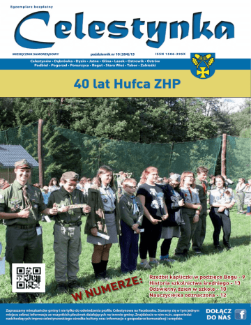 Egzemplar z b ezpłatny październik nr 10 (204)/15 MIESIĘCZNIK SAMORZĄDOWY ISSN 1506-395X Celestynów • Dąbrówka • Dyzin • Jatne • Glina • Lasek • Ostrowik • Ostrów Podbiel • Pogorzel • Ponurzyca • Regut • Stara Wieś • Tabor • Zabieżki 40 lat Hufca ZHP ZE: W R E M NU Rzeźbił kapliczki w podzięce Bogu - 9 Historia szkolnictwa średniego - 13 Odświętny dzień w szkole - 10 Nauczycielka odznaczona - 12 w numerze: 12 DZIEŃ EDUKACJI 12 POSPRZĄTALI WIEŚ 20 WIEŚ ZA PAGÓRKIEM 22–23 TURNIEJ SIATKÓWKI 30 Celestynka wydawca i adres redakcji: Urząd Gminy w Celestynowie, ul. Regucka 3, 05-430 Celestynów tel. +48 22 789 70 86, +48 22 789 70 60 wew. 101 20 www.celestynow.pl redakcja: Redaktor Naczelny – Andrzej Kamiński, [email protected] Kolegium: Beata Przysowa – [email protected], Ilona Bąk – [email protected], Wojciech Siergiejuk – [email protected] Małgorzata Jabłońska – [email protected] współpraca: K. Bojanowska-Niewczas, A. Jastrzębska, M. Jedynak, L. Komorowska, W. J. Muszyński, A. Olszewska, L. Rutkowska, T. Skrzypkowski, M. Gałecka, B. Markowska, M. Kulesza projekt graficzny: ART Depot 22-23 korekta, skład i przygotowanie do druku: Agencja Reklamowa CZARNO NA BIAŁYM druk: Agencja Reklamowa CZARNO NA BIAŁYM nakład: 2000 egzemplarzy numer zamknięto i oddano do druku: 26 października 2015 r. Redakcja zastrzega sobie prawo do redagowania i skracania tekstów i tytułów. Materiałów niezamówionych redakcja nie zwraca. Redakcja nie odpowiada też za treść zamieszczanych ogłoszeń. 30 2 2 Celestynka październik nr 10 (204)/15 www.celestynow.pl Od redakcji Drodzy mieszkańcy gminy, 10 numer „Celestynki” pęka w szwach od wydarzeń, jakie miały miejsce pod koniec września i w październiku. Obchodzono kilka ważnych rocznic. Mieszkanka naszej gminy Marianna Bednarczyk obchodziła swoje setne urodziny, celestynowski Hufiec ZHP świętował 40 rocznicę utworzenia a uczniowie Zespołu Szkół uczcili 76 rocznicę powstania Polskiego Państwa Podziemnego. Jak każdego miesiąca obecnej kadencji władz samorządowych oddano do użytku kilka wyremontowanych dróg. Wójt nagrodził kilkoro dyrektorów i nauczycieli za ich wyjątkową pracę na rzecz szkół z okazji Dnia Edukacji Narodowej. Mieszkańcy Dąbrówki podczas zebrania podzielili przypadający na rok przyszły fundusz sołecki. 7 drużyn, w tym jedna składająca się z pracowników gminy, wzięło udział w V Turnieju Piłki Siatkowej. A jak im poszło proponujemy przeczytać na stronach sportowych. W numerze znajduje się reportaż o kolejnej gminnej miejscowości. Tym razem o wsi Ponurzyca i jej mieszkańcach. Cóż, trudno wymienić w krótkiej zapowiedzi wszystko, co się działo. Zachęcamy do przeczytania. Zespół Redakcyjny KONKURS NA LOGO WSI Sołtys i Rada Sołecka wsi Lasek zapraszają do wzięcia udziału w konkursie na logo sołectwa Lasek. Prace należy nadsyłać na adres mailowy: [email protected] do końca bieżącego roku. Najlepsza praca, wyłoniona przez głosowanie na stronie internetowej: www.lasek.celestynow.net w terminie od 1.01.2016 r. do 31.01.2016 r., zostanie nagrodzona nagrodą niespodzianką. Regulamin konkursu na stronie: www.lasek.celestynow.net. ZAPOWIEDZI WYDARZEŃ KULTURALNYCH - Konkurs plastyczny „Karta Świąteczna” dla dzieci, młodzieży i dorosłych termin dostarczania prac do 18.11.2015 r. Regulamin oraz karty zgłoszenia do pobrania na stronie www.gokcelestynow.pl, organizator: GOK Celestynów; - 04.11.2015 r. (środa) godz. 11.00 wykład z psychologiem Pawłem Głębickim w ramach Celestynowskiego Koła Studenckiego dla Seniorów, miejsce: sala konferencyjna Urzędu Gminy w Celestynowie, organizator: Gminny Ośrodek Kultury w Celestynowie, Mazowiecka Federacja na Rzecz Ekonomii Społecznej wstęp wolny; - 11.11.2015 r. (środa) Obchody 97. Rocznicy Odzyskania Niepodległości Polski godz. 10.30 – uroczysta Msza Święta za Ojczyznę, - złożenie kwiatów pod pomnikiem „Dziesięciolecia Niepodległości" na terenie placu przy Kościele Parafialnym, - koncert słowno-muzyczny w wykonaniu Kingi i Arkadiusza Głogowskich oraz Dziecięcego Chóru Grupy Rekonstrukcji Historycznych „Żołnierze września 1939" Garnizonu Dęblin pod dowództwem Tadeusza Kucharskiego, miejsce: Kościół Parafialny w Celestynowie, organizatorzy: Kapłani Parafii Wniebowzięcia NMP, Gminny Ośrodek Kultury w Celestynowie, wstęp wolny; PRZYPOMINAMY Zapełnione worki lub pojemniki prosimy wystawiać przed posesję w dniu wywozu do godz. 6.00 zgodnie z wyznaczonym harmonogramem w miejscach dostępnych do ich odbioru. Red. Celestynka październik nr 10 (204)/15 www.celestynow.pl - 18.11.2015 r. (środa) godz. 11.00 wykład „Joga śmiechu” Piotr Bielski w ramach Celestynowskiego Koła Studenckiego dla Seniorów, miejsce: sala konferencyjna Urzędu Gminy w Celestynowie, organizator: Gminny Ośrodek Kultury w Celestynowie, Mazowiecka Federacja na Rzecz Ekonomii Społecznej wstęp wolny; - 28.11.2015 r. (sobota) godz. 16.00–21.00 Klub Dojrzałego Człowieka w programie: spotkanie autorskie z Jarosławem Kretem, zabawa taneczna przy zespole DIMER, miejsce: sala Zespołu Szkół w Celestynowie ul. Św. Kazimierza 55, organizator: GOK, Bibliotekla Publiczna w Celestynowie; - 06.12.2015 r. (niedziela) Bajkowa Niedziela miejsce: sala gimnastyczna Zespołu Szkół w Celestynowie ul. Św. Kazimierza 55, w programie: spektakl teatralny, pokaz tańca nowoczesnego w wykonaniu dzieci z sekcji GOK Celestynów, zimowe piosenki dla dzieci, mini konkursy dla dzieci z nagrodami, rodzinne warsztaty przedświąteczne, wystawa pokonkursowa oraz wręczenie nagród laureatom konkursu „Karta Świąteczna", organizator: GOK Celestynów wstęp wolny. MEDAL DLA NAUCZYCIELKI Na wniosek Dyrektora Przedszkola Samorządowego w Celestynowie w dniu 15 października 2015 r. w auli Schumana Uniwersytetu Kardynała Stefana Wyszyńskiego Mazowiecki Kurator Oświat