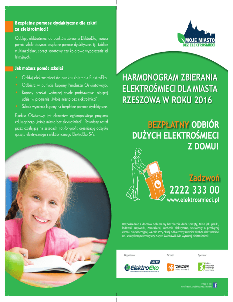 Bezpłatne pomoce dydaktyczne dla szkół za elektrośmieci! Oddając elektrośmieci do punktów zbierania ElektroEko, możesz pomóc szkole otrzymać bezpłatne pomoce dydaktyczne, tj. tablice multimedialne, sprzęt sportowy czy kolorowe wyposażenie sal lekcyjnych. Jak możesz pomóc szkole? • Oddaj elektrośmieci do punktu zbierania ElektroEko. • Odbierz w punkcie kupony Funduszu Oświatowego. • Kupony przekaż wybranej szkole podstawowej biorącej udział w programie „Moje miasto bez elektrośmieci”. • Szkoła wymienia kupony na bezpłatne pomoce dydaktyczne. HARMONOGRAM ZBIERANIA ELEKTROŚMIECI DLA MIASTA RZESZOWA W ROKU 2016 Fundusz Oświatowy jest elementem ogólnopolskiego programu edukacyjnego „Moje miasto bez elektrośmieci”. Powołany został przez działającą na zasadach not-for-profit organizację odzysku sprzętu elektrycznego i elektronicznego ElektroEko SA. BezpoÊrednio z domów odbieramy bezpłatnie du˝e sprz´ty, takie jak: pralki, lodówki, zmywarki, zamra˝arki, kuchenki elektryczne, telewizory o przekàtnej ekranu przekraczajàcej 24 cale. Przy okazji odbierzemy równie˝ drobne elektroÊmieci np. sprz´t komputerowy czy zu˝yte Êwietlówki. Nie wyrzucaj elektroÊmieci! Organizator Partner Operator w HARMONOGRAM ZBIÓREK OSIEDLOWYCH Lp. 1. Miejsce zbiórki bi1 Al. Wincentego Witosa 21 (parking sklepu – od strony ul. Jana Wiktora) Termin zbiórki Godziny HARMONOGRAM ZBIÓREK OSIEDLOWYCH Lp. Każda pierwsza sobota miesiąca (z wyjątkiem świąt): 06.02.2016 05.03.2016 02.04.2016 07.05.2016 04.06.2016 02.07.2016 06.08.2016 03.09.2016 01.10.2016 05.11.2016 03.12.2016 E.LECLERC Al. Tadeusza Rejtana 69 (parking sklepu) 06.02.2016 05.03.2016 02.04.2016 07.05.2016 04.06.2016 02.07.2016 06.08.2016 03.09.2016 01.10.2016 05.11.2016 03.12.2016 3. 06.02.2016 05.03.2016 02.04.2016 07.05.2016 04.06.2016 02.07.2016 06.08.2016 03.09.2016 01.10.2016 05.11.2016 03.12.2016 Godziny ul. Piotra Skargi 2 (parking samochodowy) 16.04.2016 8 - 13 9. Osiedle Przybyszówka (ul. Dębicka 170 – Dom Kultury) 18.06.2016 8 - 13 10. Osiedle Staromieście (przy skrzyżowaniu ulic Staromiejskiej i Długiej) 15.10.2016 8 - 13 11. Osiedle Zwięczyca (ul. Beskidzka – boisko sportowe Zespołu Szkół nr 5) 23.04.2016 8 - 13 12. Osiedle Załęże (ul. ks. Jana Stączka – parking przy kościele) 20.08.2016 8 - 13 13. Osiedle Słocina (ul. Powstańców Śląskich, obok Park-Hotel Wellness) 19.11.2016 8 - 13 9 - 14 9 - 14 Każda pierwsza sobota miesiąca (z wyjątkiem świąt): Galeria Nowy Świat Ul. Krakowska 20 (parking przed sklepem Stokrotka – od strony ul. Ofiar Katynia) Termin zbiórki 8. Każda pierwsza sobota miesiąca (z wyjątkiem świąt): 2. Miejsce zbiórki 9 - 14 4. ul. Podwisłocze 40 (parking samochodowy) 27.02.2016 8 - 13 5. ul. Miłocińska (pętla MPK) 16.07.2016 8 - 13 14. Osiedle Wilkowyja (ul. Cienista – parking przy cmentarzu komunalnym) 25.06.2016 8 - 13 6. ul. Paderewskiego 3f (parking samochodowy) 20.02.2016 24.09.2016 8 - 13 15. Osiedle Budziwój (ul. Budziwojska – Dom Kultury) 21.05.2016 8 - 13 7. ul. Wita Stwosza (parking przy blokach ul. Malczewskiego 13, 15) 19.03.2016 17.09.2016 8 - 13 ODDAJ ELEKTROŚMIECI DO PUNKTÓW ZBIERANIA ELEKTROEKO – POMÓŻ SZKOLE KORZYSTAĆ Z FUNDUSZU OŚWIATOWEGO!
