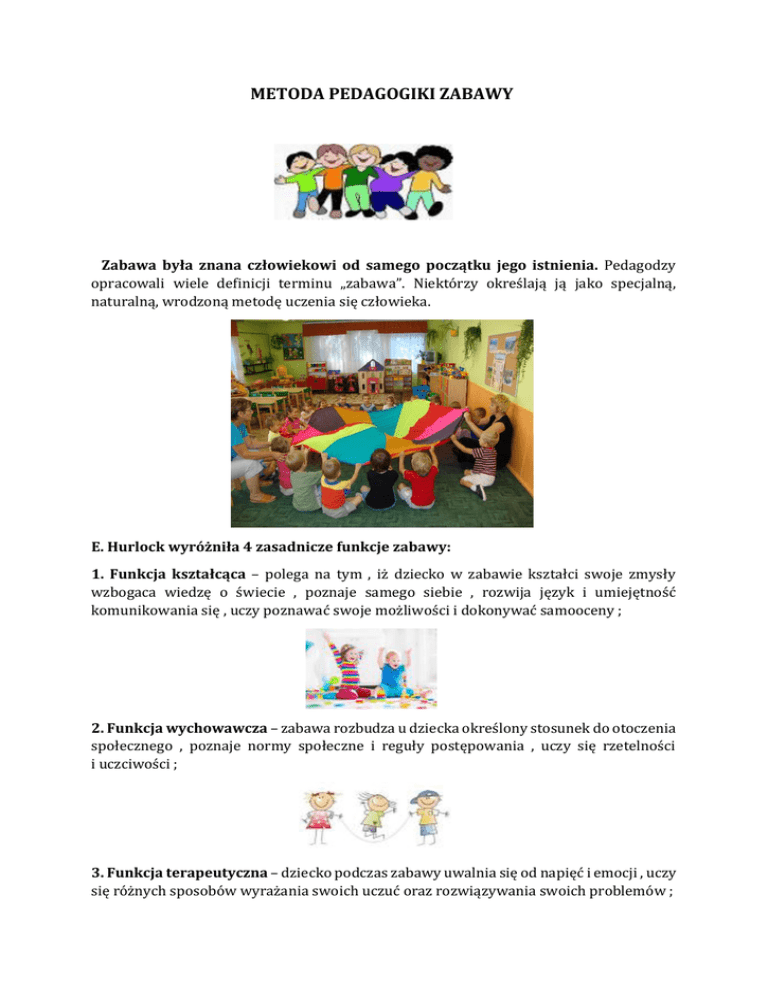 METODA PEDAGOGIKI ZABAWY Zabawa była znana człowiekowi od samego początku jego istnienia. Pedagodzy opracowali wiele definicji terminu „zabawa”. Niektórzy określają ją jako specjalną, naturalną, wrodzoną metodę uczenia się człowieka. E. Hurlock wyróżniła 4 zasadnicze funkcje zabawy: 1. Funkcja kształcąca – polega na tym , iż dziecko w zabawie kształci swoje zmysły wzbogaca wiedzę o świecie , poznaje samego siebie , rozwija język i umiejętność komunikowania się , uczy poznawać swoje możliwości i dokonywać samooceny ; 2. Funkcja wychowawcza – zabawa rozbudza u dziecka określony stosunek do otoczenia społecznego , poznaje normy społeczne i reguły postępowania , uczy się rzetelności i uczciwości ; 3. Funkcja terapeutyczna – dziecko podczas zabawy uwalnia się od napięć i emocji , uczy się różnych sposobów wyrażania swoich uczuć oraz rozwiązywania swoich problemów ; 4. Funkcja projekcyjna – dziecko w zabawie wchodzi w różne sytuacje, wykonuje różne zadania, pelni różne role i dzięki temu ujawnia swoje właściwości. Natomiast wychowawca może odkryć i lepiej poznać mocne i słabe strony wychowanka. Pedagogika zabawy nie jest dyscypliną naukową lecz symboliczną nazwą metodycznych poszukiwań ułatwiających pracę z grupą, proces uczenia. Proponuje ona działania dające członkom grupy możliwość rozwoju w atmosferze zaufania, wzajemnej akceptacji, bez względu na wiek i umiejętności, wyzwala aktywność twórczą i ciekawość, ułatwia kontakty z innymi, ze sobą i otaczającą rzeczywistością. Na zajęciach prowadzonych metodami pedagogiki zabawy obowiązują określone zasady: dobrowolności – decydowanie o swojej aktywności w atmosferze wolnej od nakazów; wychowawca jedynie zachęca, zaprasza do uczestnictwa w zabawie; wielopoziomowość komunikacji – świadome porozumiewanie się na poziomie wer-balnym i niewerbalnym, rzeczowym (wymiana logicznych i prawdziwych informacji) i emocjonalnym (wyrażanie, odczuwanie, akceptowanie uczuć swoich i innych); unikanie rywalizacji – rezygnacja z podziału na zwycięzcę i przegranych , uczenie współpracy i współdziałania z innymi; różnorodność środków wyrazu – umożliwienie przekazywania treści i emocji poprzez oddziaływanie na różne zmysły. Stosuje się podczas zajęć wszystkie media, ruch, dotyk, gest, taniec, malowanie, lepienie oraz pantomimę. Wszystkie te zasady wzmacniają relacje w grupie, uczą wyrażania uczuć, budują zaufanie do prowadzącego i całej grupy. Pedagogika zabawy prezentuje także szeroki wybór metod, których celem jest ożywienie kontaktów między ludźmi. Metody te likwidują lęk, obawę i strach, napięcie mięśni oraz napięcia psychiczne, angażują w działanie całą osobę wszystkie jej zmysły, wyzwalają twórczą aktywność, uczą współpracy z innymi.